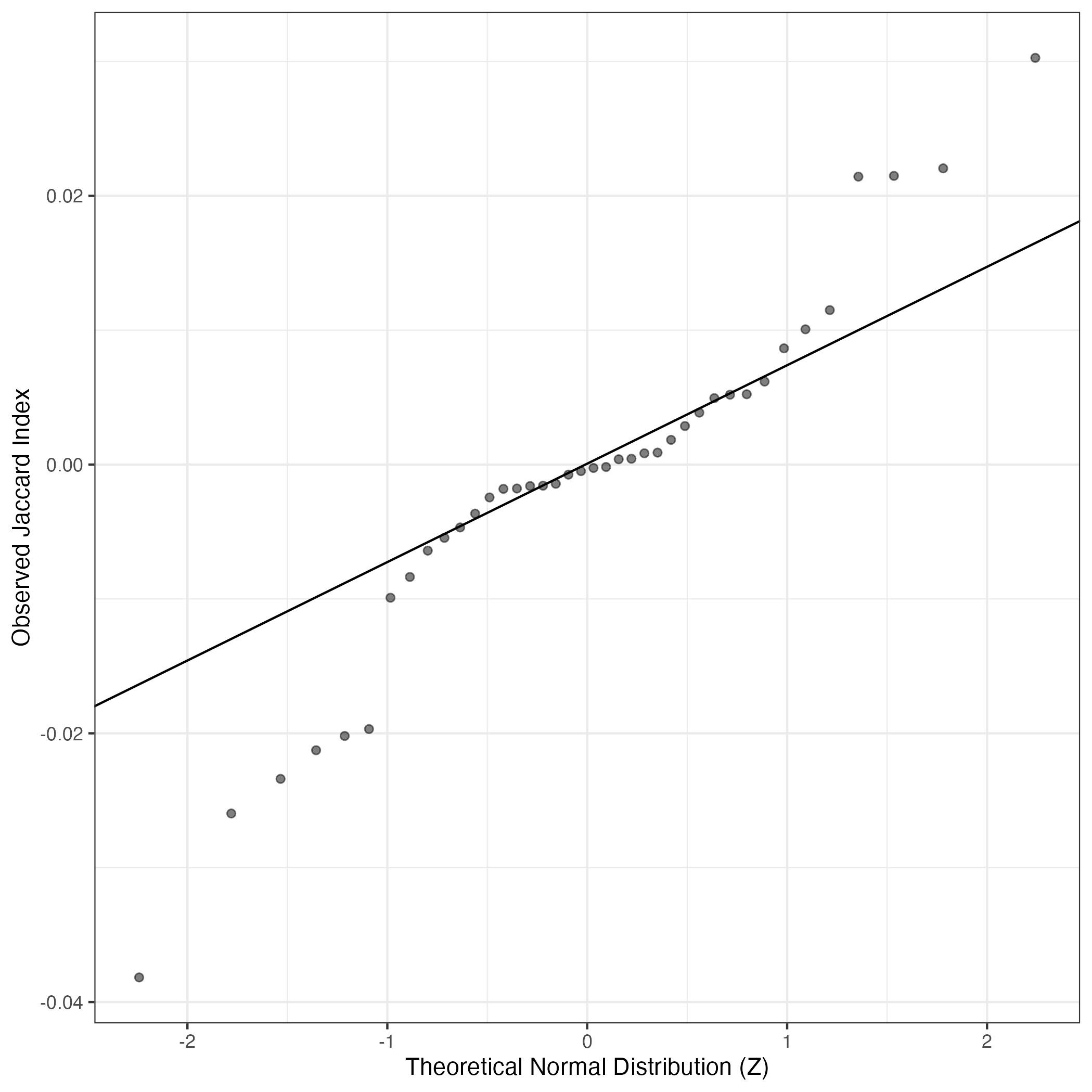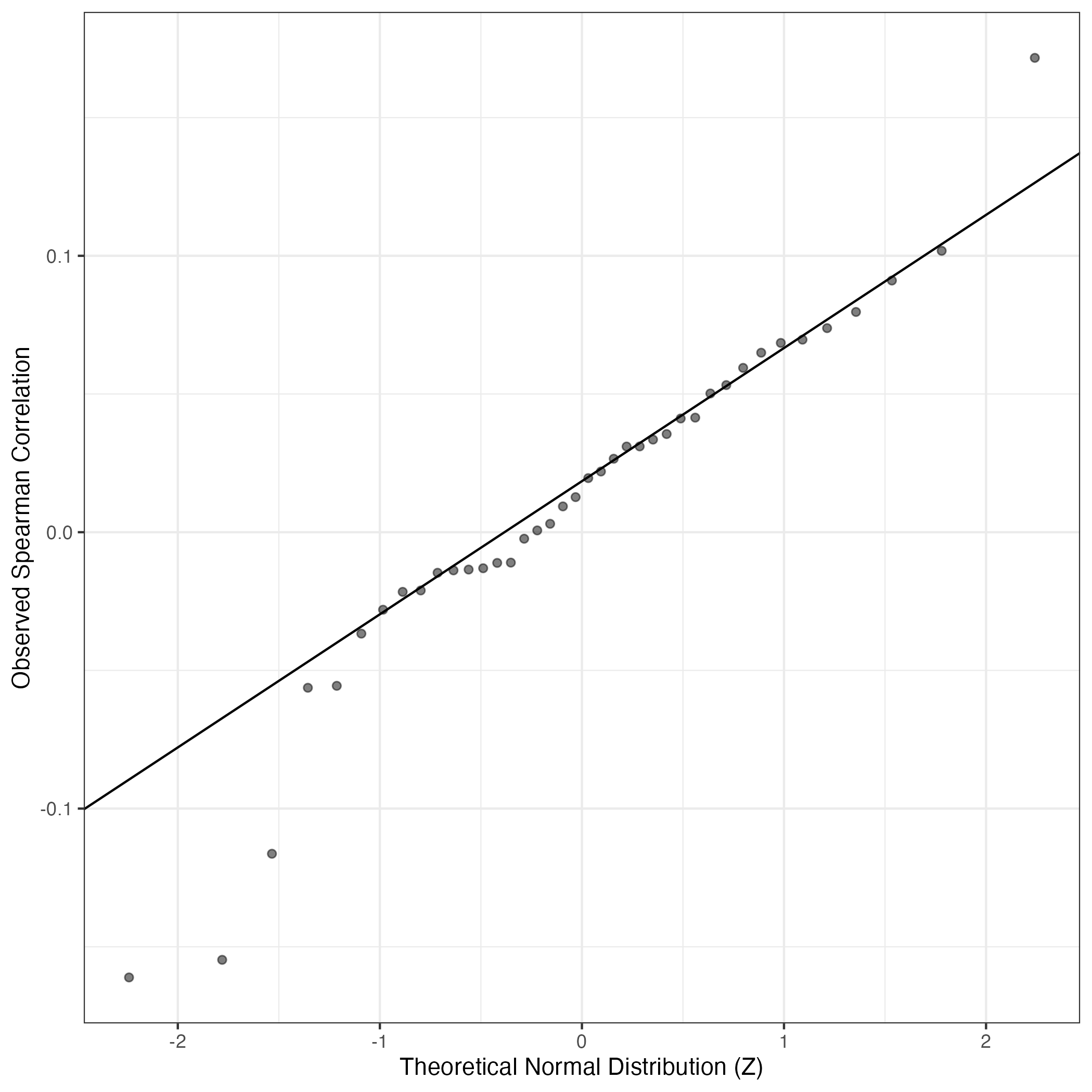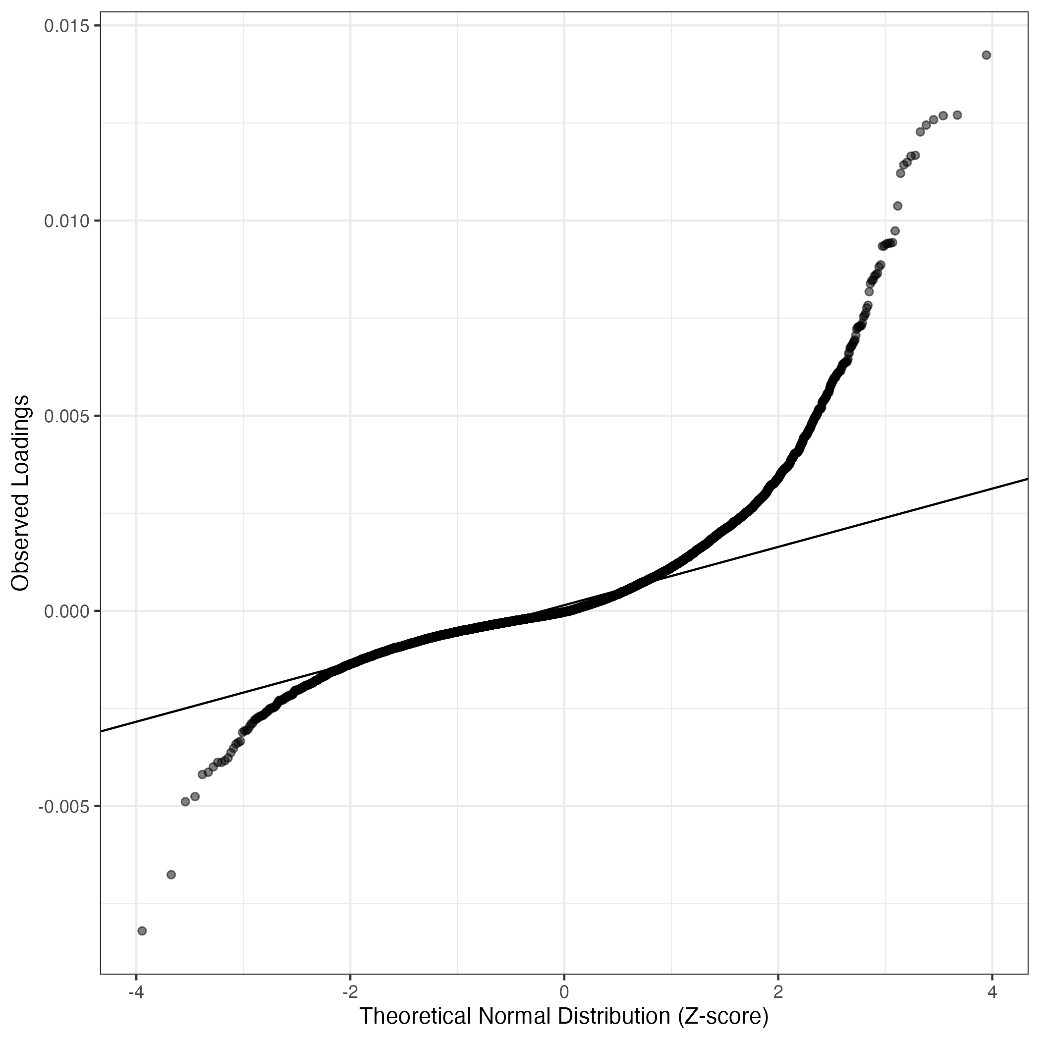 QQ-plot of gene loadings, averaged over both independent splits of the data