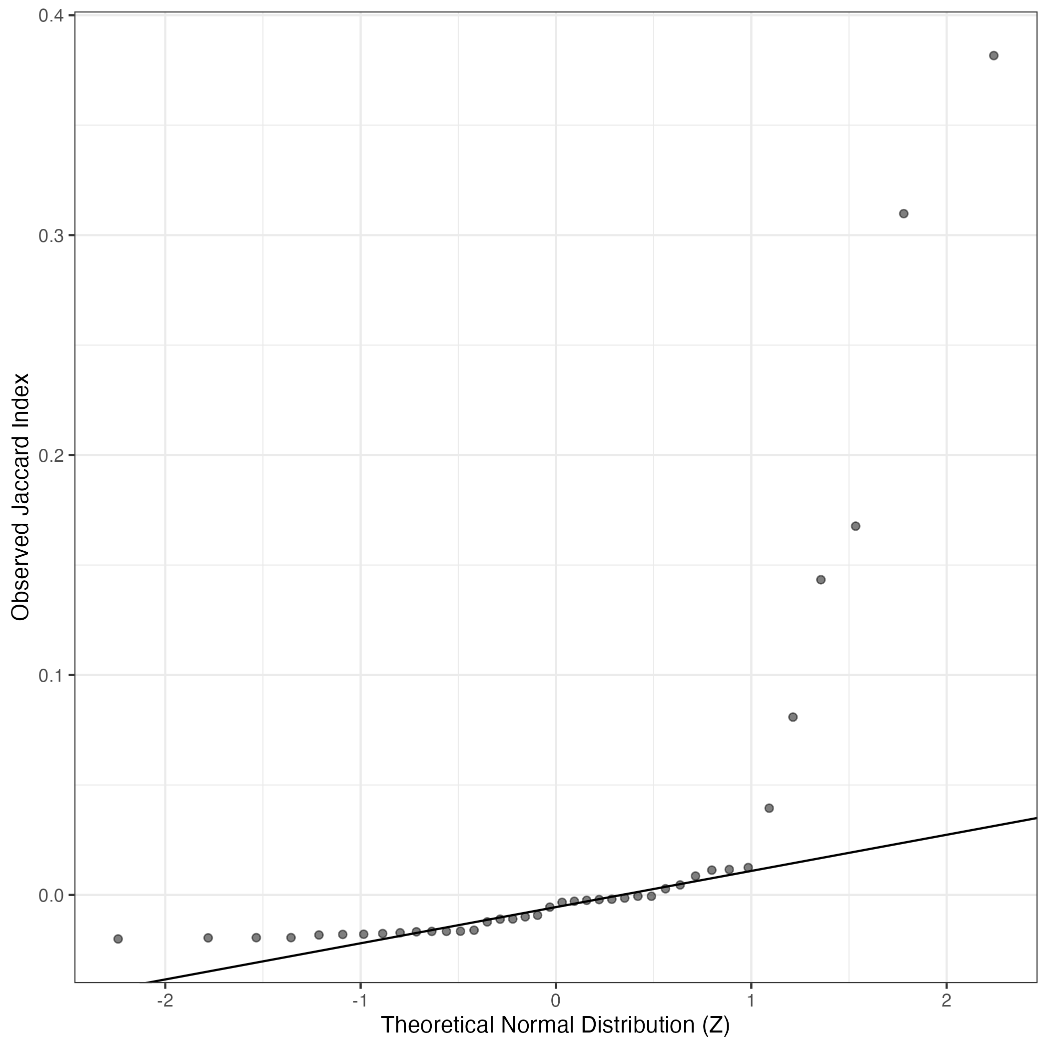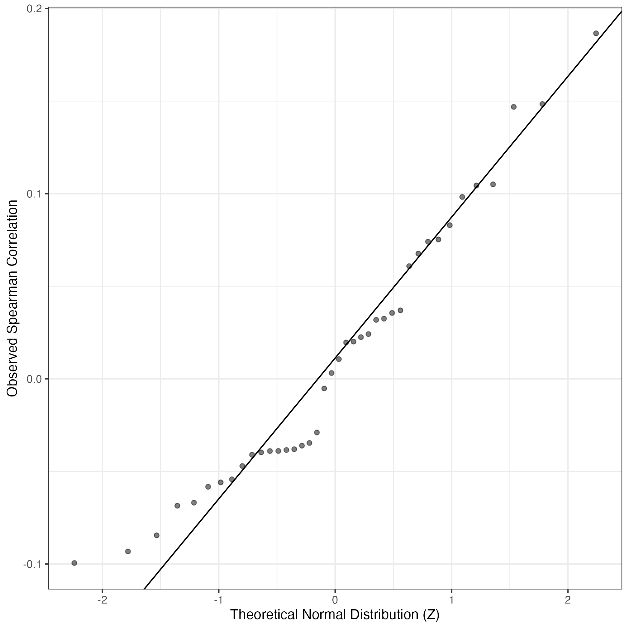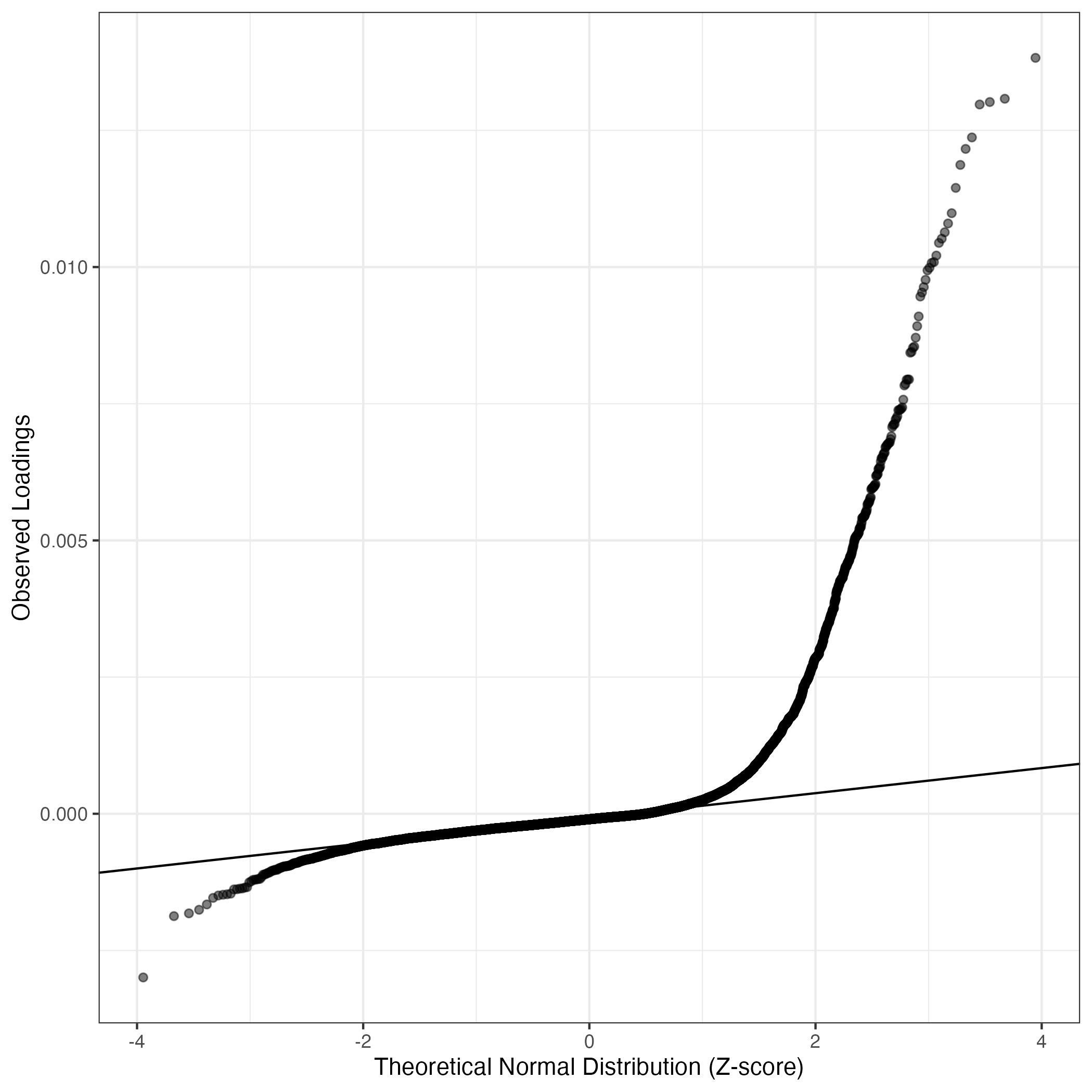 QQ-plot of gene loadings, averaged over both independent splits of the data