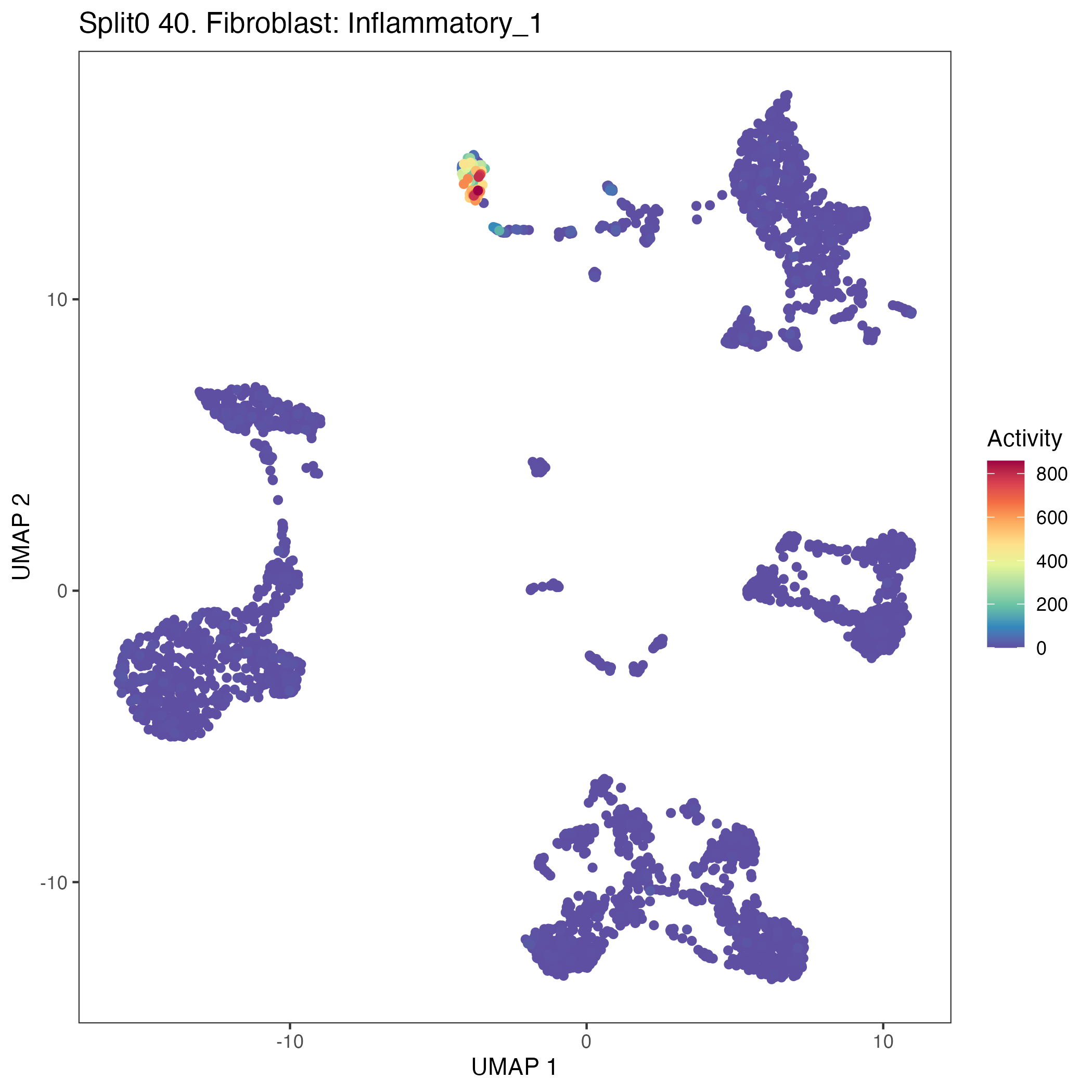 UMAP plots showing activity of gene expression program identified in GEP 40. Fibroblast: Inflammatory: