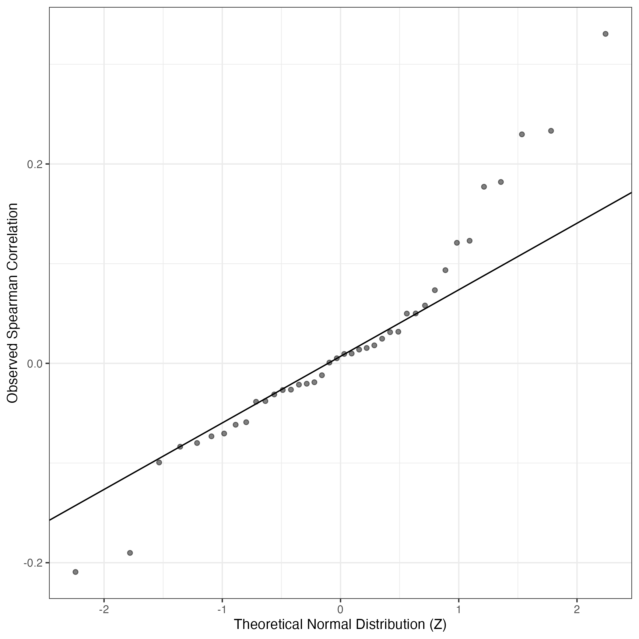 A similar QQ-plot as above, but only for instances where the H value is e.g. > 25, i.e. we are confident that the expression program is active above noise. Agreemenet between these binary vectors is tested using the Jaccard Index, with the P-values calculated by an exact test: