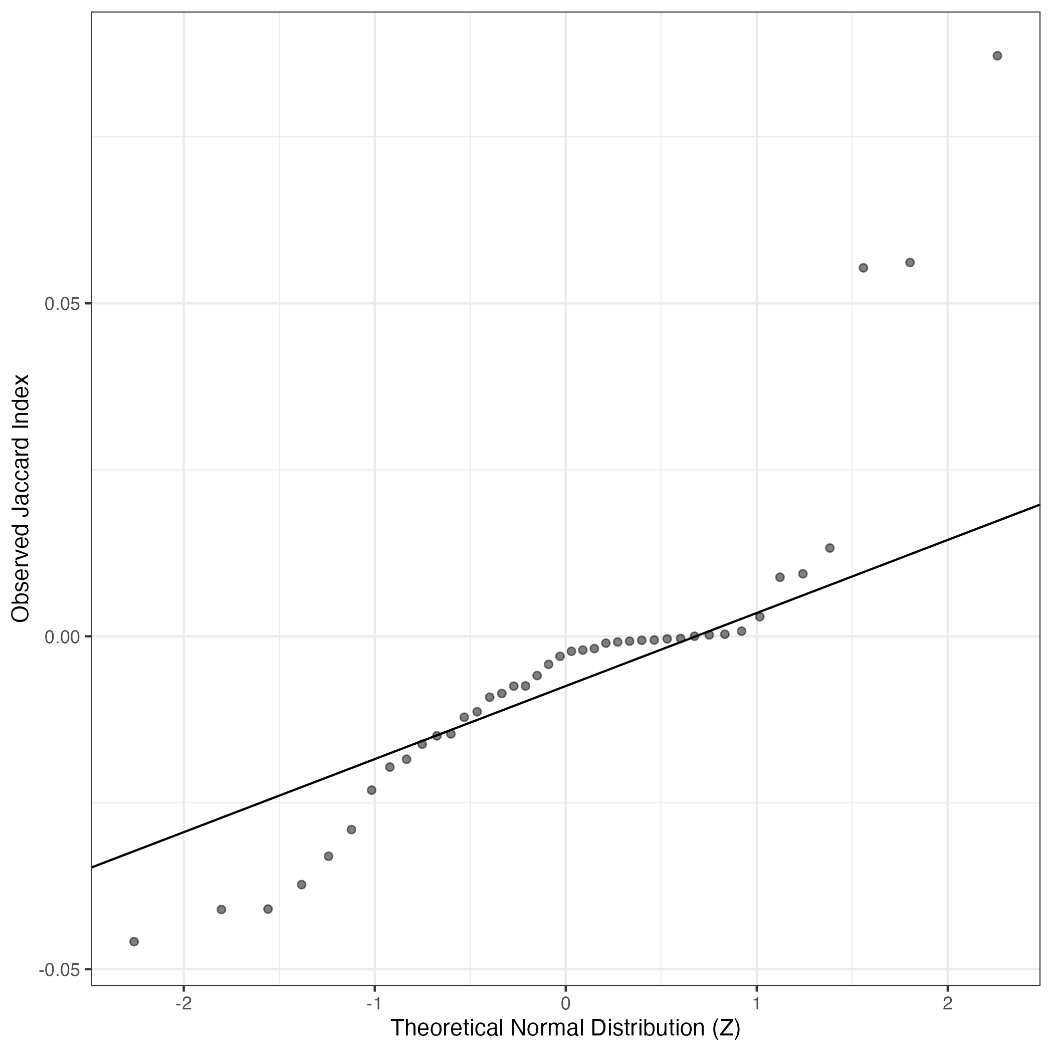 A similar QQ-plot as above, but only for instances where the H value is e.g. > 25, i.e. we are confident that the expression program is active above noise. Agreemenet between these binary vectors is tested using the Jaccard Index, with the P-values calculated by an exact test: