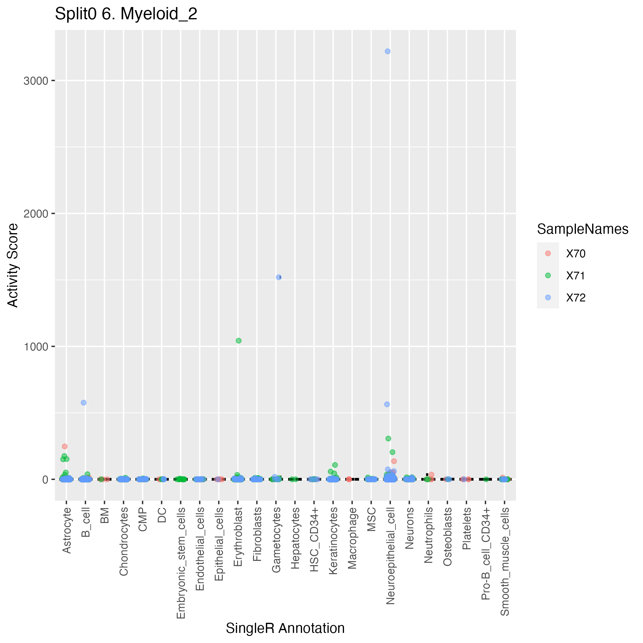 Promyelocytes: Promyelocytes (model markers) early granulocyte progenitors in the bone marrow which are derived from the myeloblasts and develop into the myelocytes: Wilcoxon ranksum test P-value for gene set overrepresentation: 1.68e-01 Mean rank of genes in gene set: 6560 Rank on gene expression program of genes in gene set: