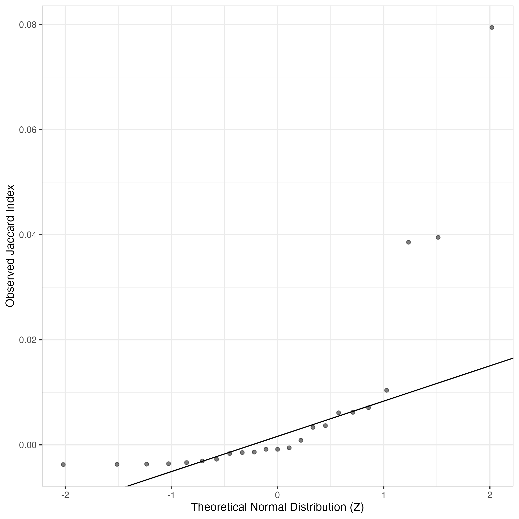 A similar QQ-plot as above, but only for instances where the H value is e.g. > 25, i.e. we are confident that the expression program is active above noise. Agreemenet between these binary vectors is tested using the Jaccard Index, with the P-values calculated by an exact test: