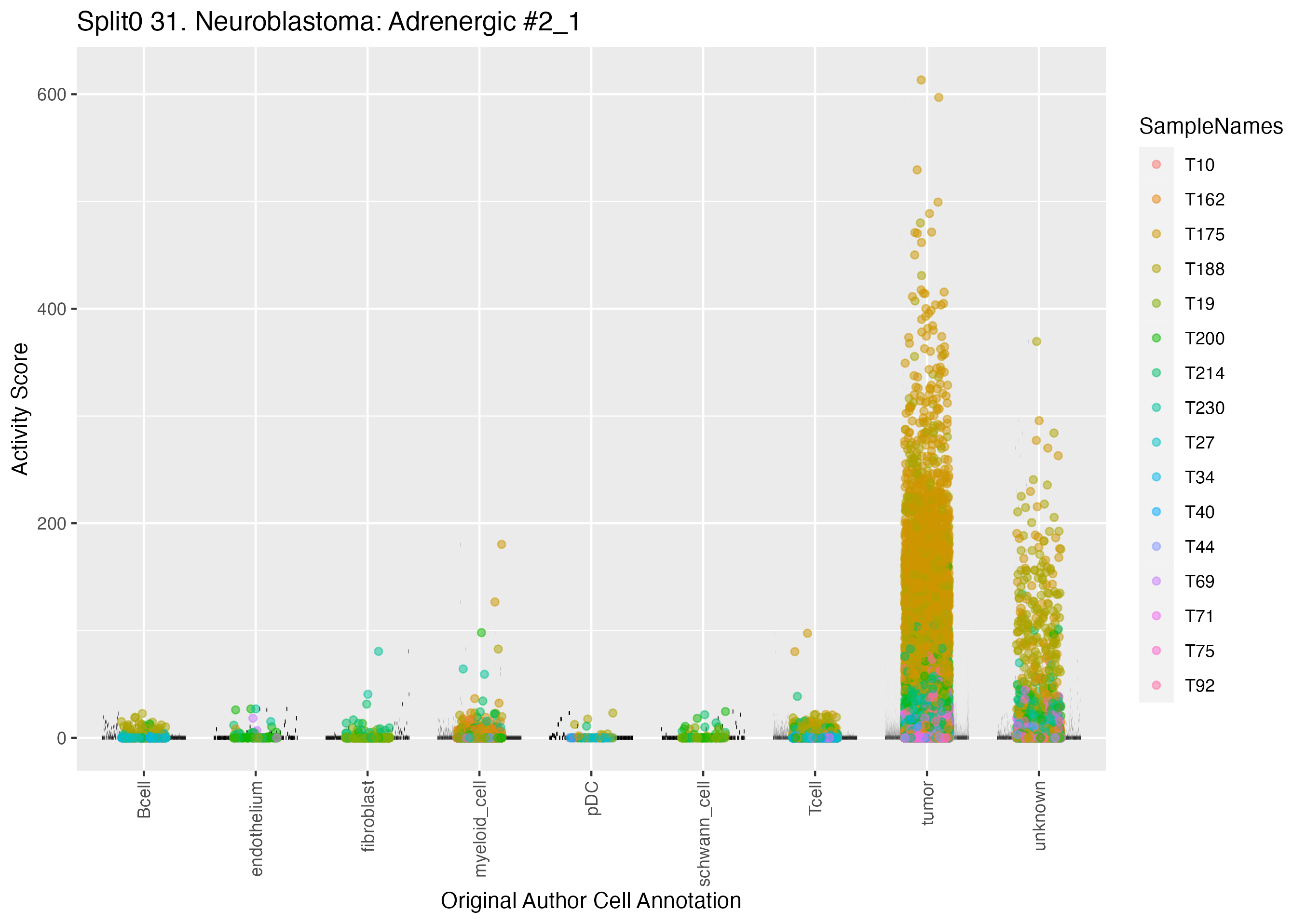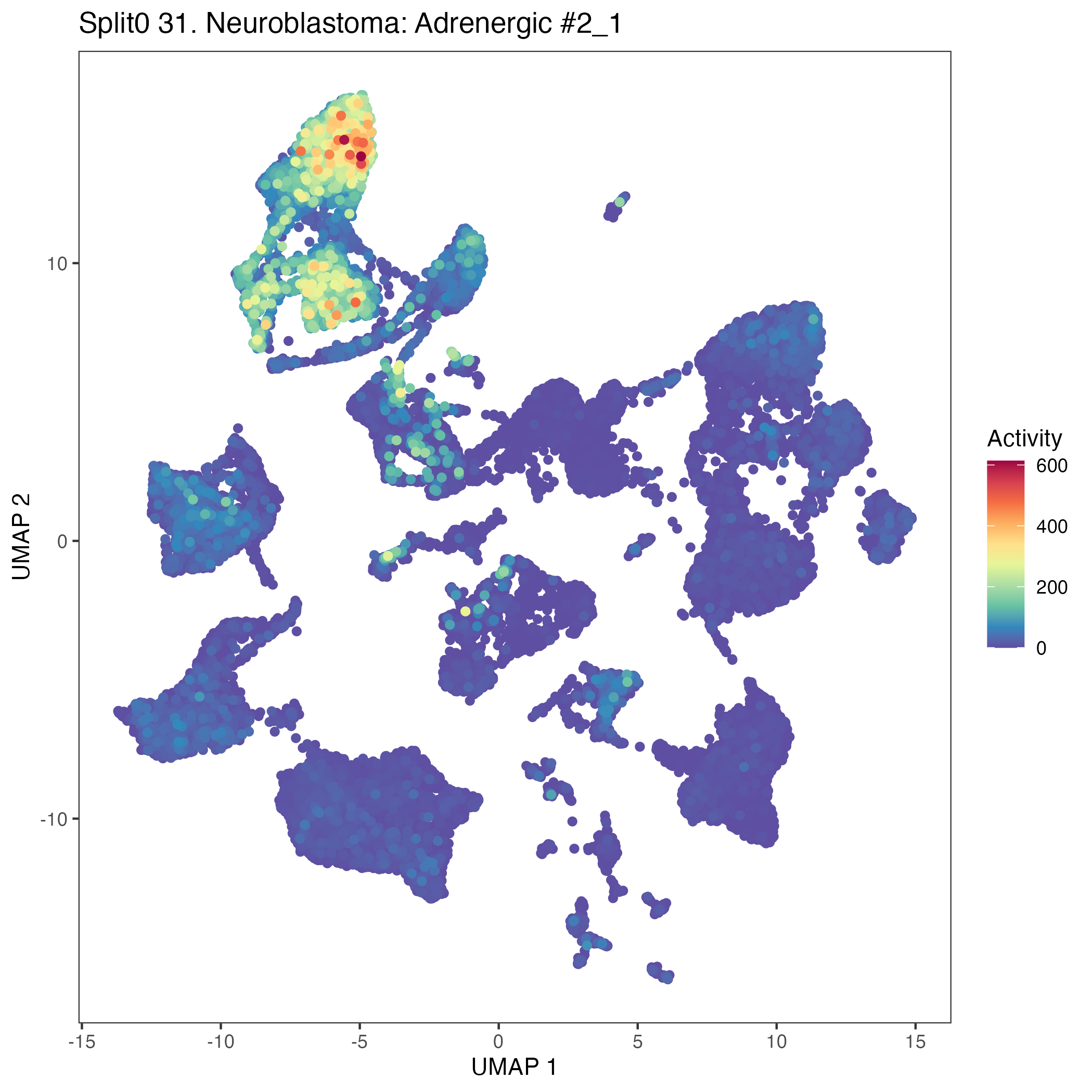 UMAP plots showing activity of gene expression program identified in GEP 31. Neuroblastoma: Adrenergic #2: