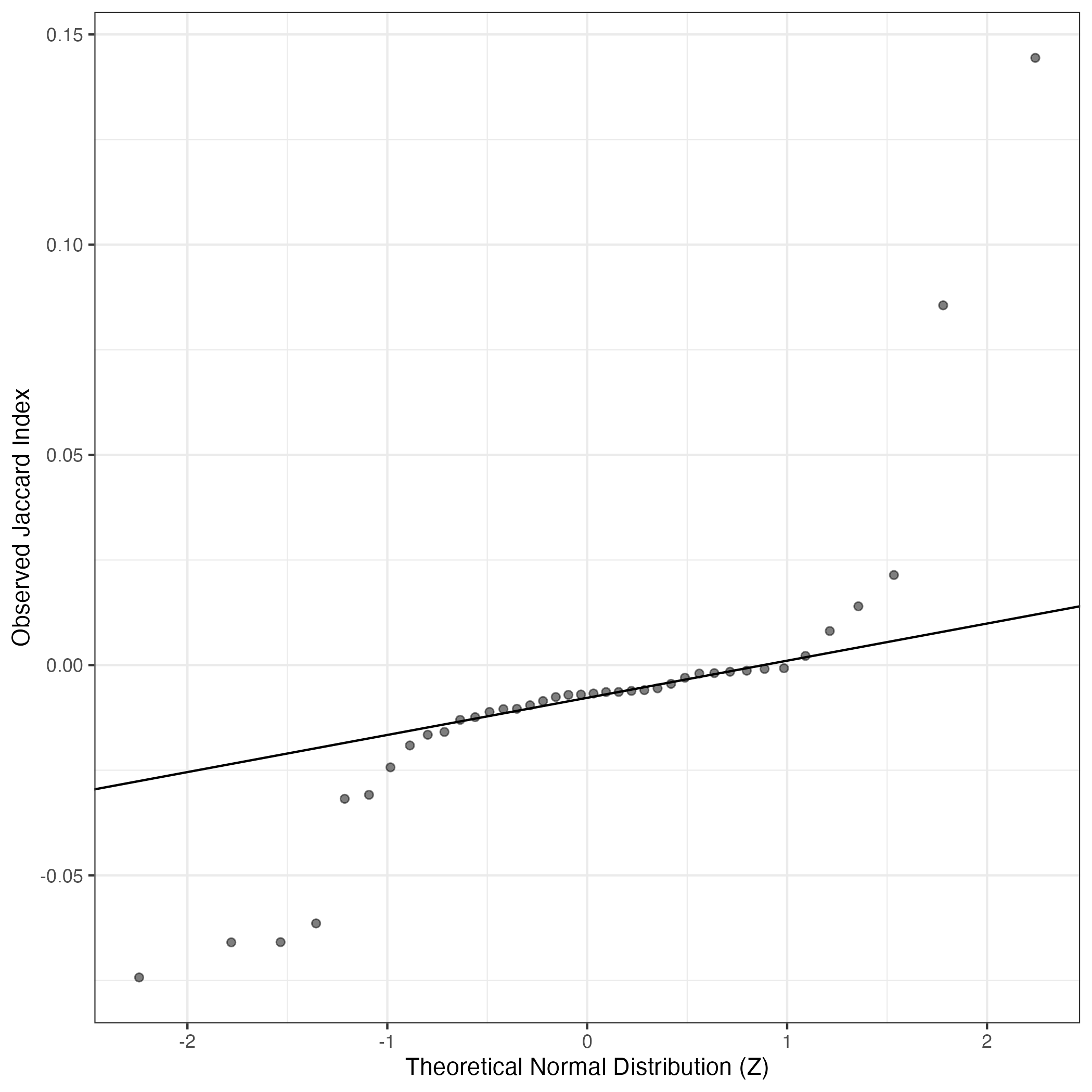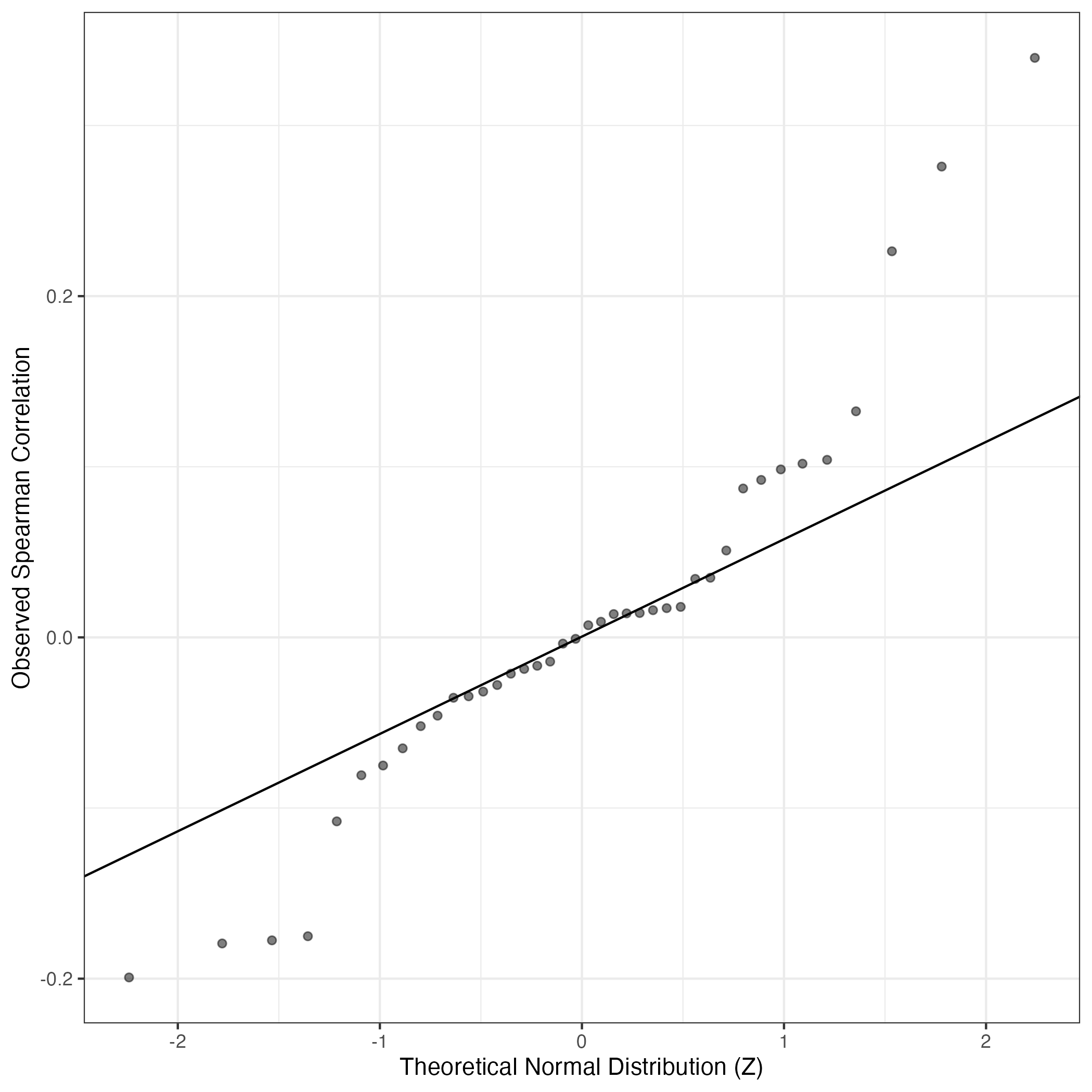 QQ-plot of gene loadings, averaged over both independent splits of the data
