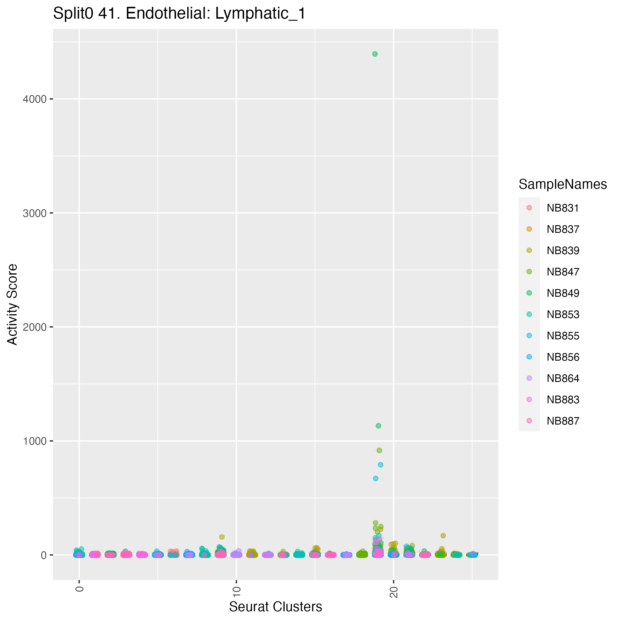 UMAP plots showing activity of gene expression program identified in community:41. Endothelial: Lymphatic