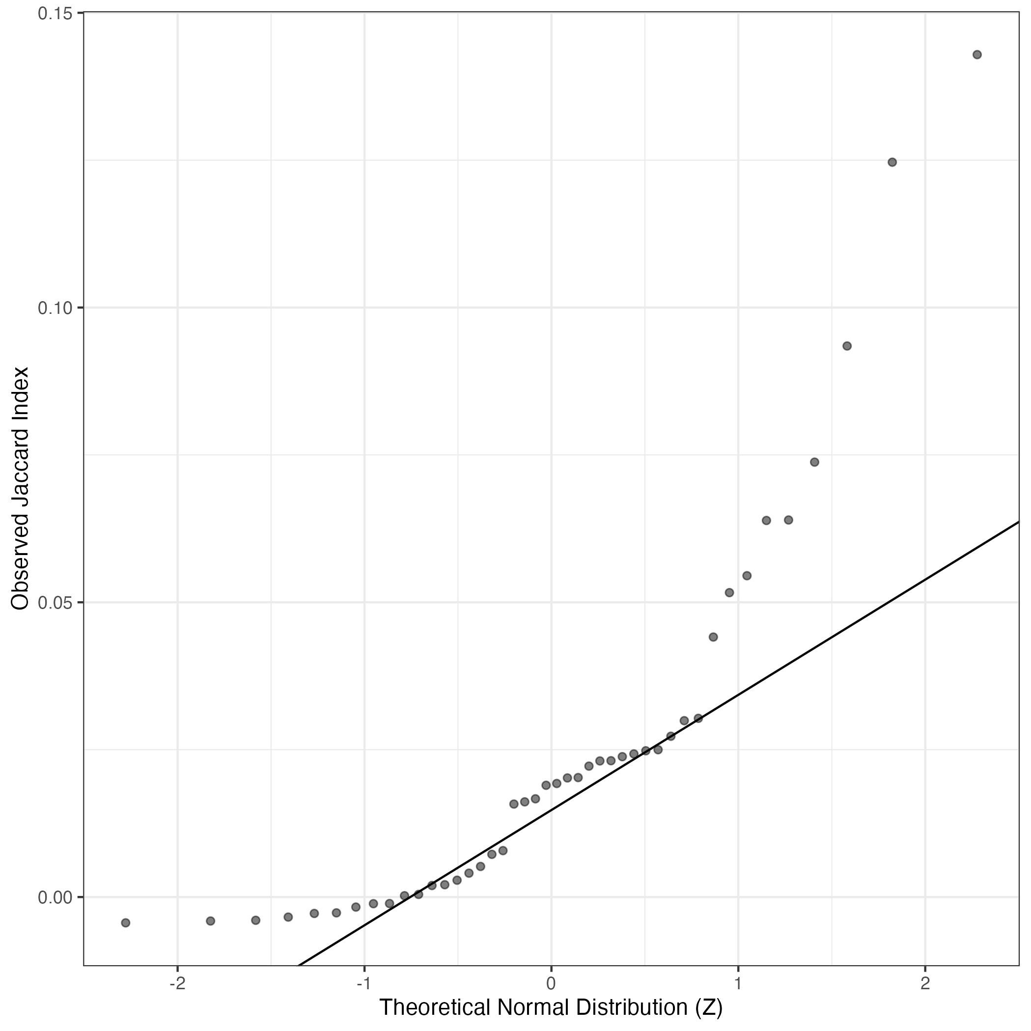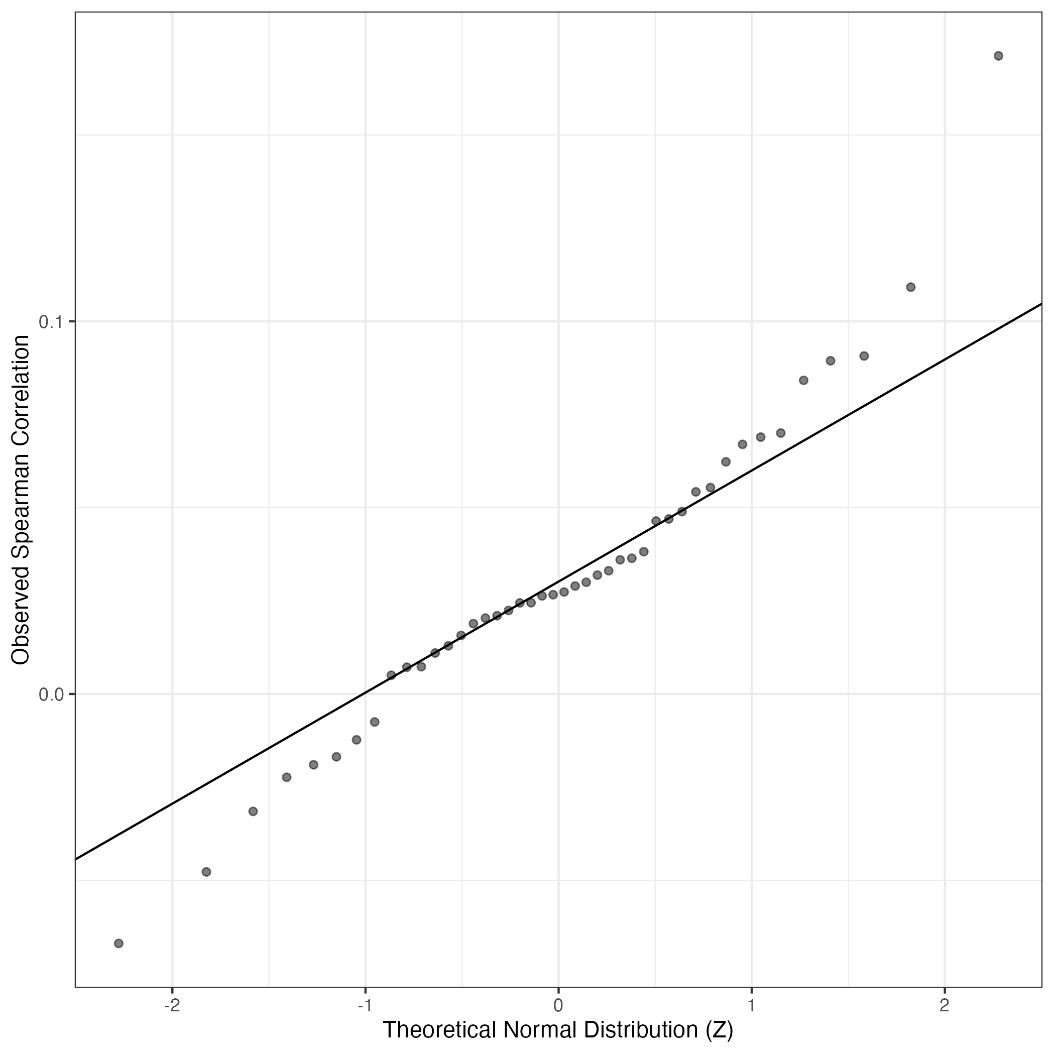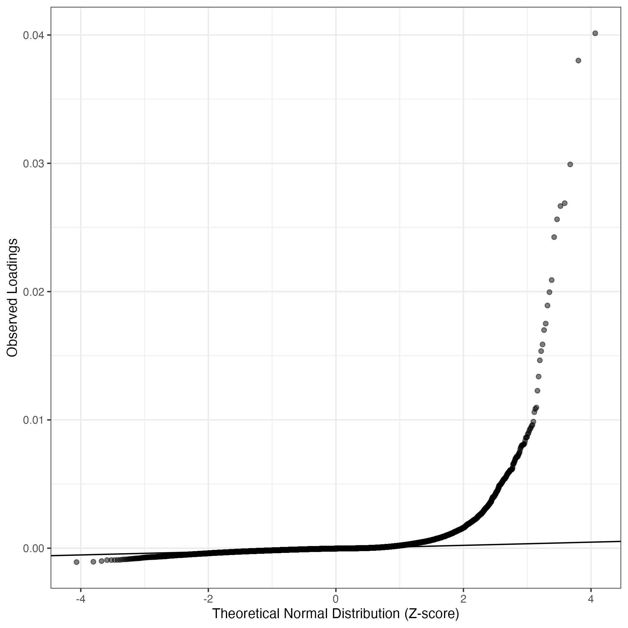 QQ-plot of gene loadings, averaged over both independent splits of the data