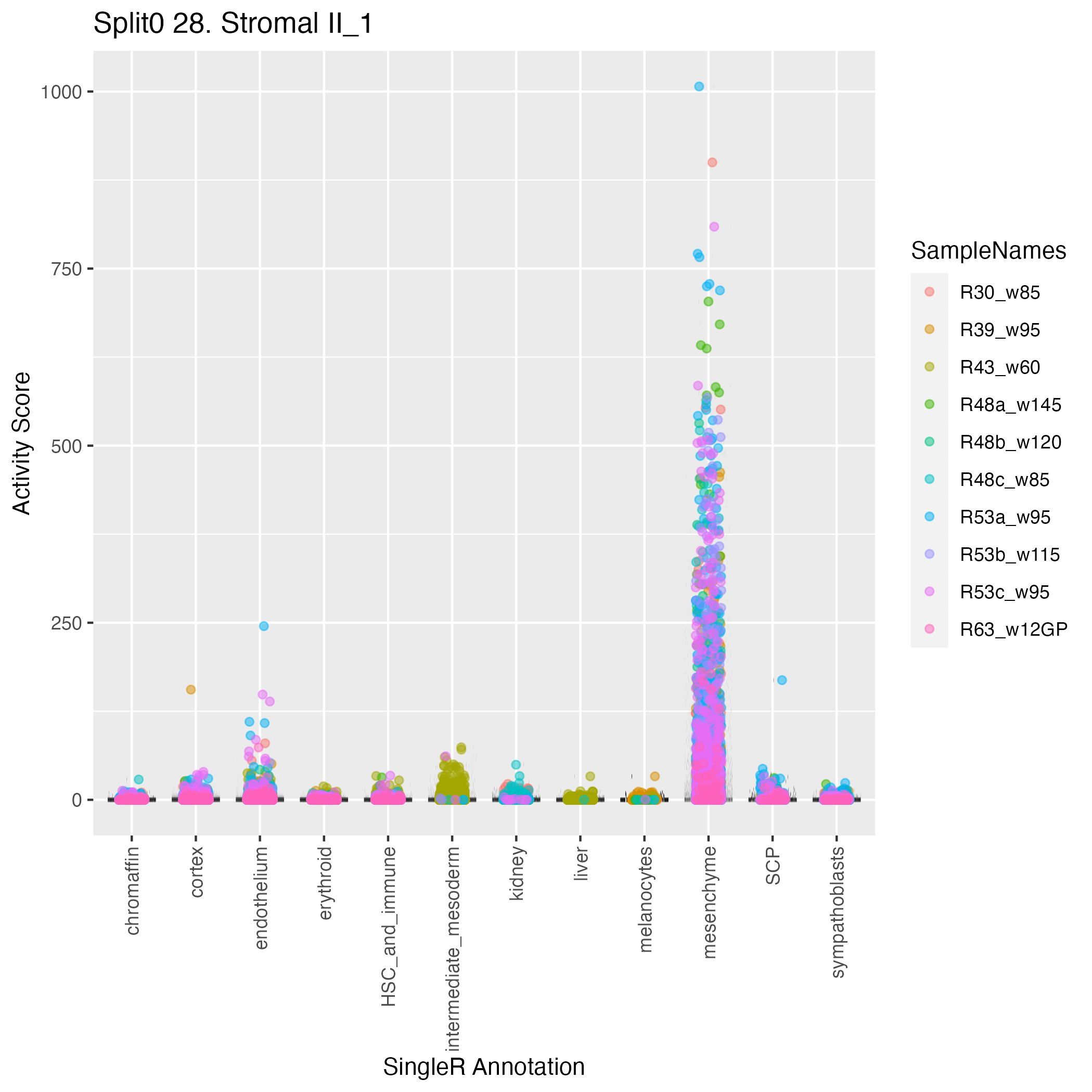 UMAP plots showing activity of gene expression program identified in GEP 28. Stromal II: