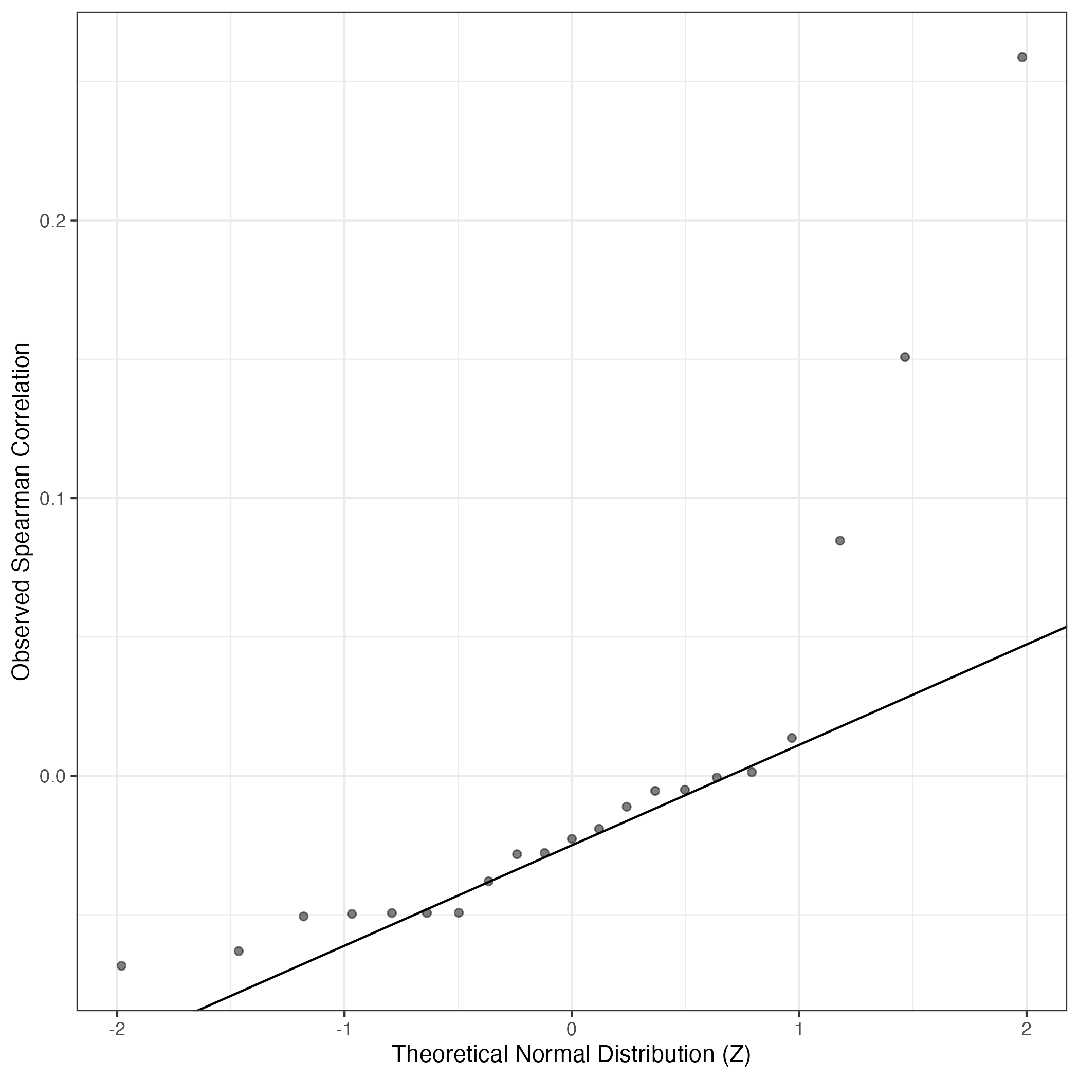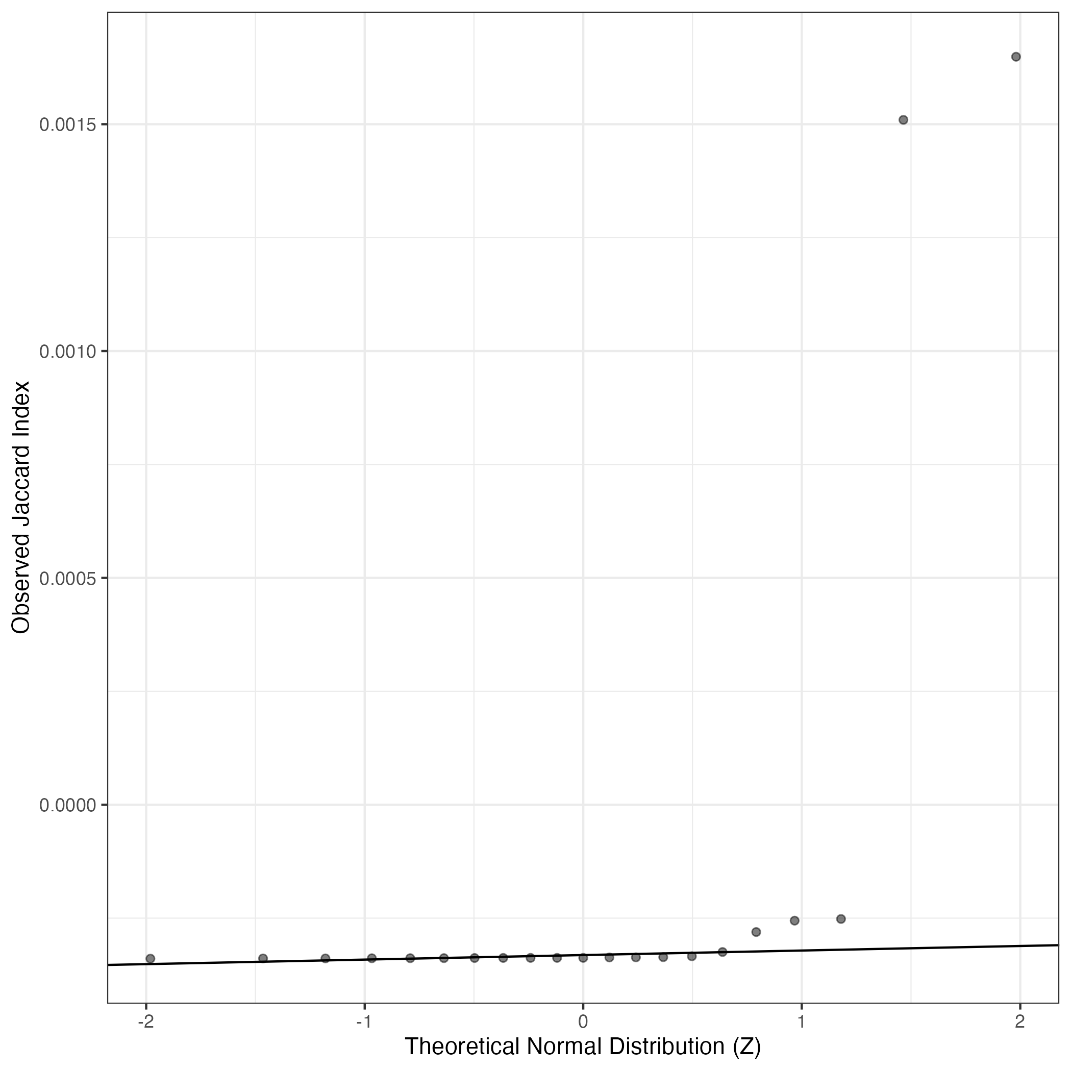 A similar QQ-plot as above, but only for instances where the H value is e.g. > 25, i.e. we are confident that the expression program is active above noise. Agreemenet between these binary vectors is tested using the Jaccard Index, with the P-values calculated by an exact test:
