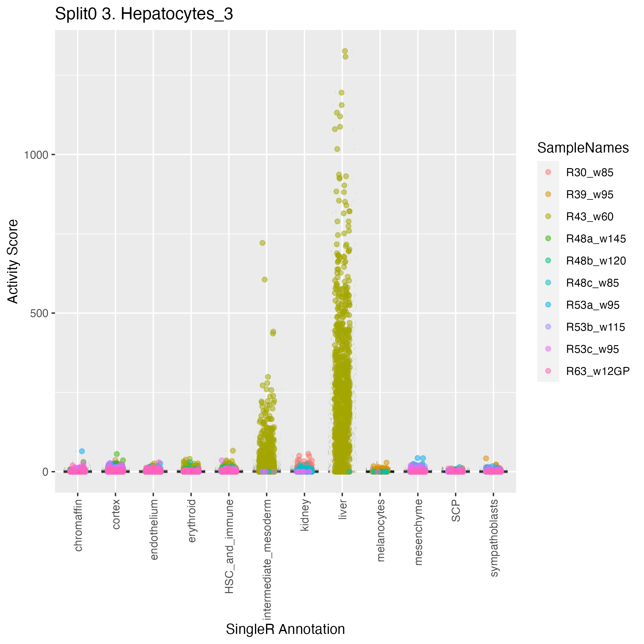 UMAP plots showing activity of gene expression program identified in GEP 3. Hepatocytes: