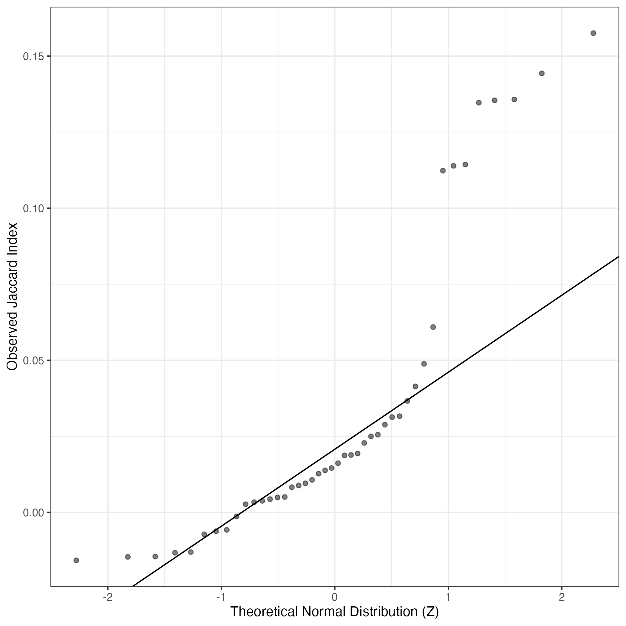 QQ-plot of gene loadings, averaged over both independent splits of the data