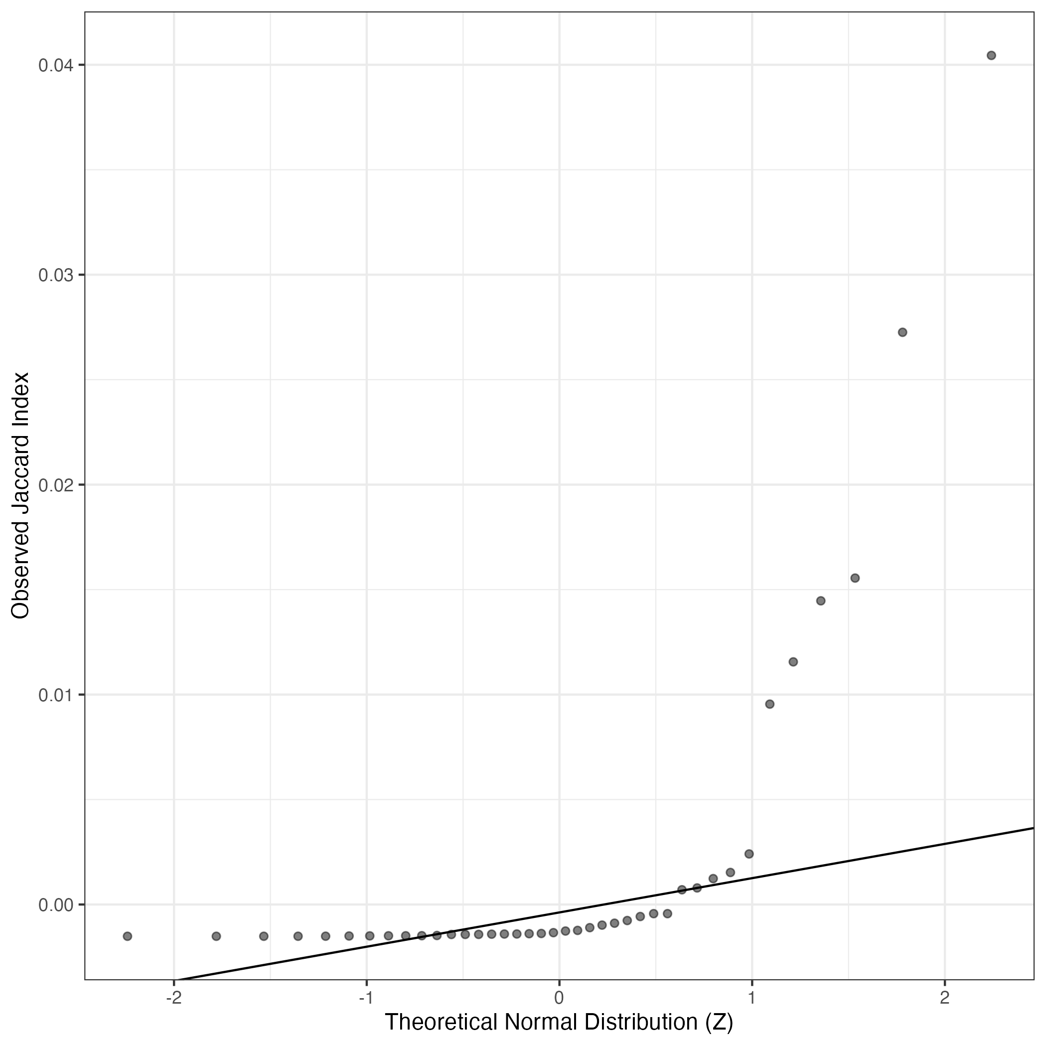 A similar QQ-plot as above, but only for instances where the H value is e.g. > 25, i.e. we are confident that the expression program is active above noise. Agreemenet between these binary vectors is tested using the Jaccard Index, with the P-values calculated by an exact test: