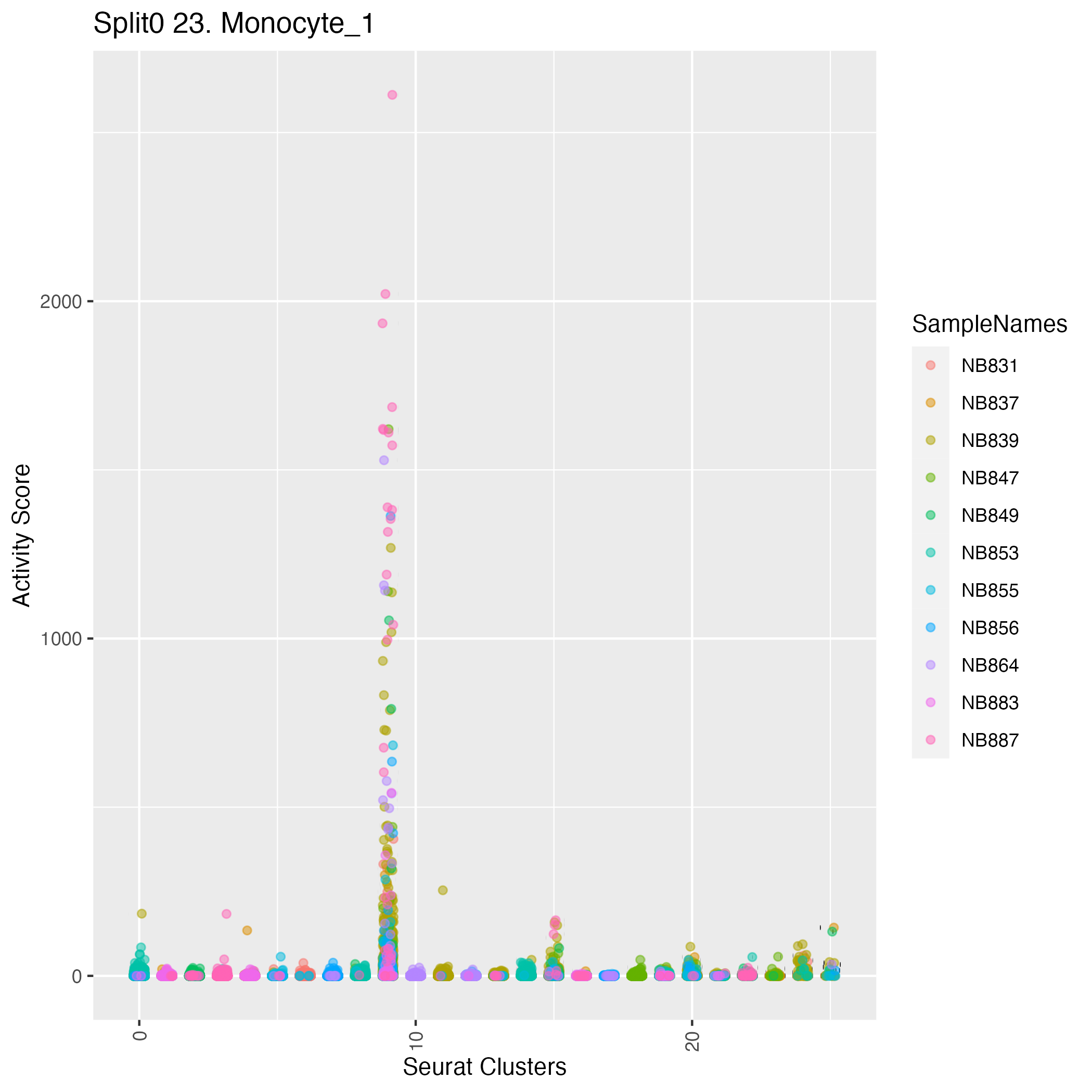 Cycling cells: Cycling monocytes (curated markers) proliferating monocytes: Wilcoxon ranksum test P-value for gene set overrepresentation: 9.70e-01 Mean rank of genes in gene set: 17055.33 Rank on gene expression program of genes in gene set: