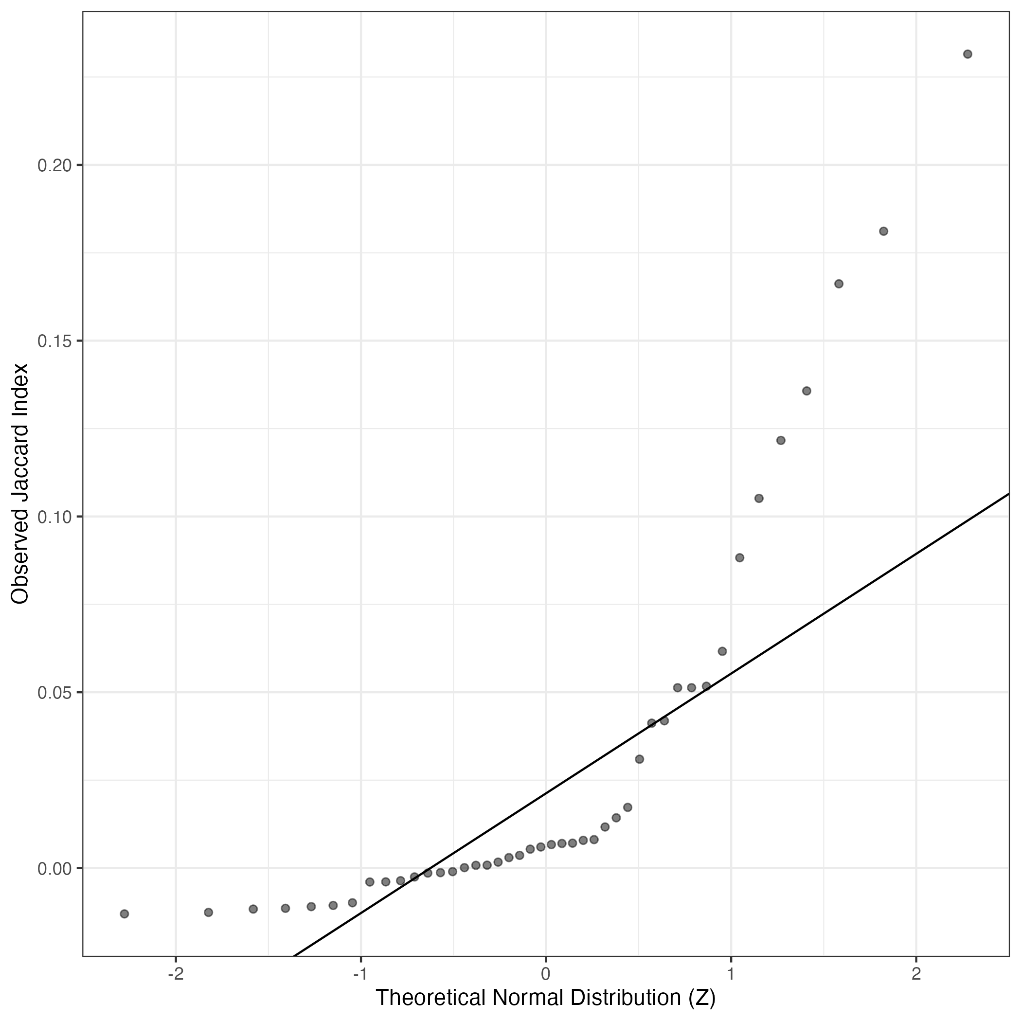 A similar QQ-plot as above, but only for instances where the H value is e.g. > 25, i.e. we are confident that the expression program is active above noise. Agreemenet between these binary vectors is tested using the Jaccard Index, with the P-values calculated by an exact test: