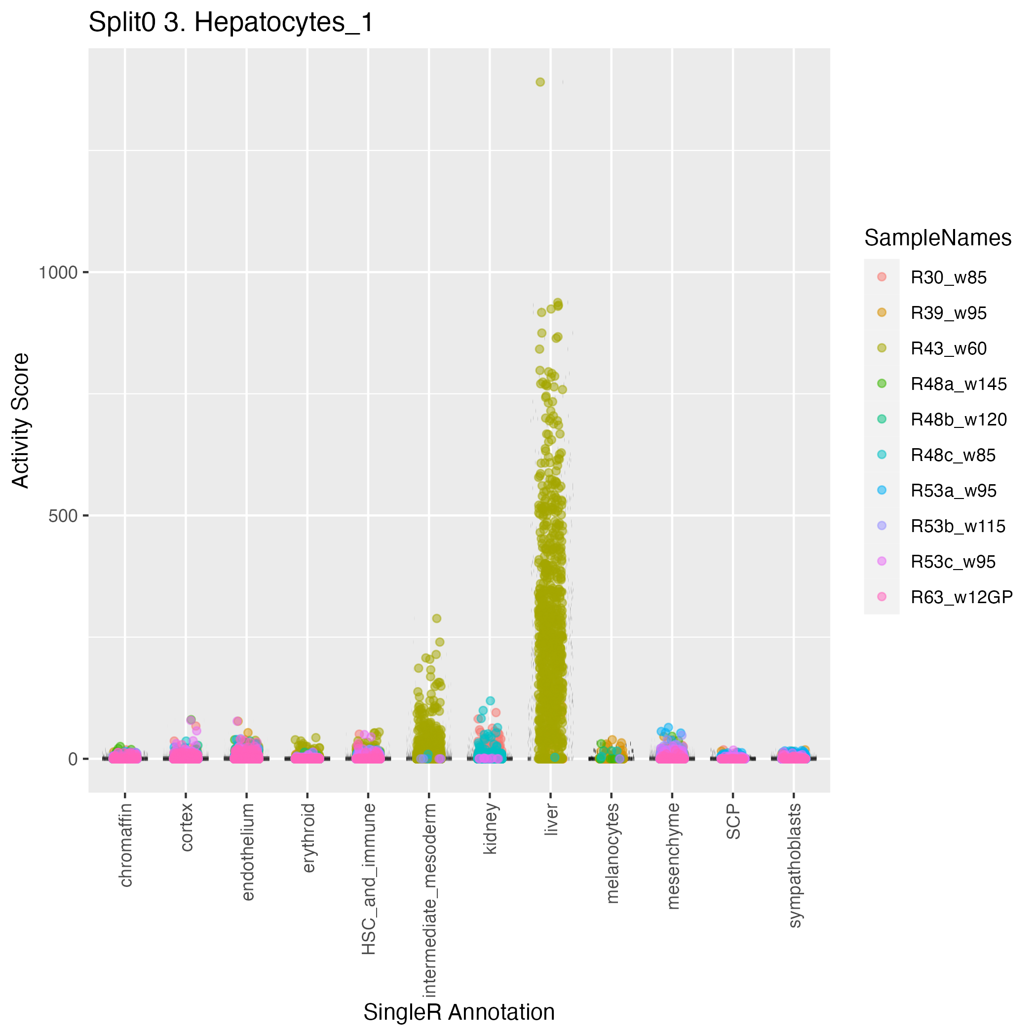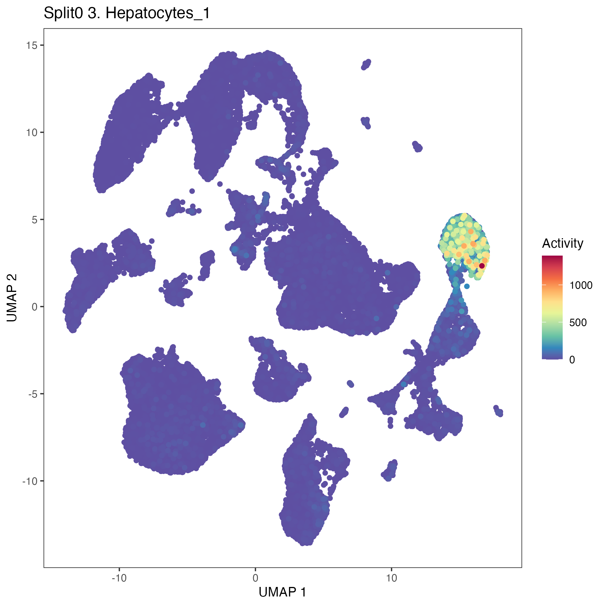 UMAP plots showing activity of gene expression program identified in GEP 3. Hepatocytes: