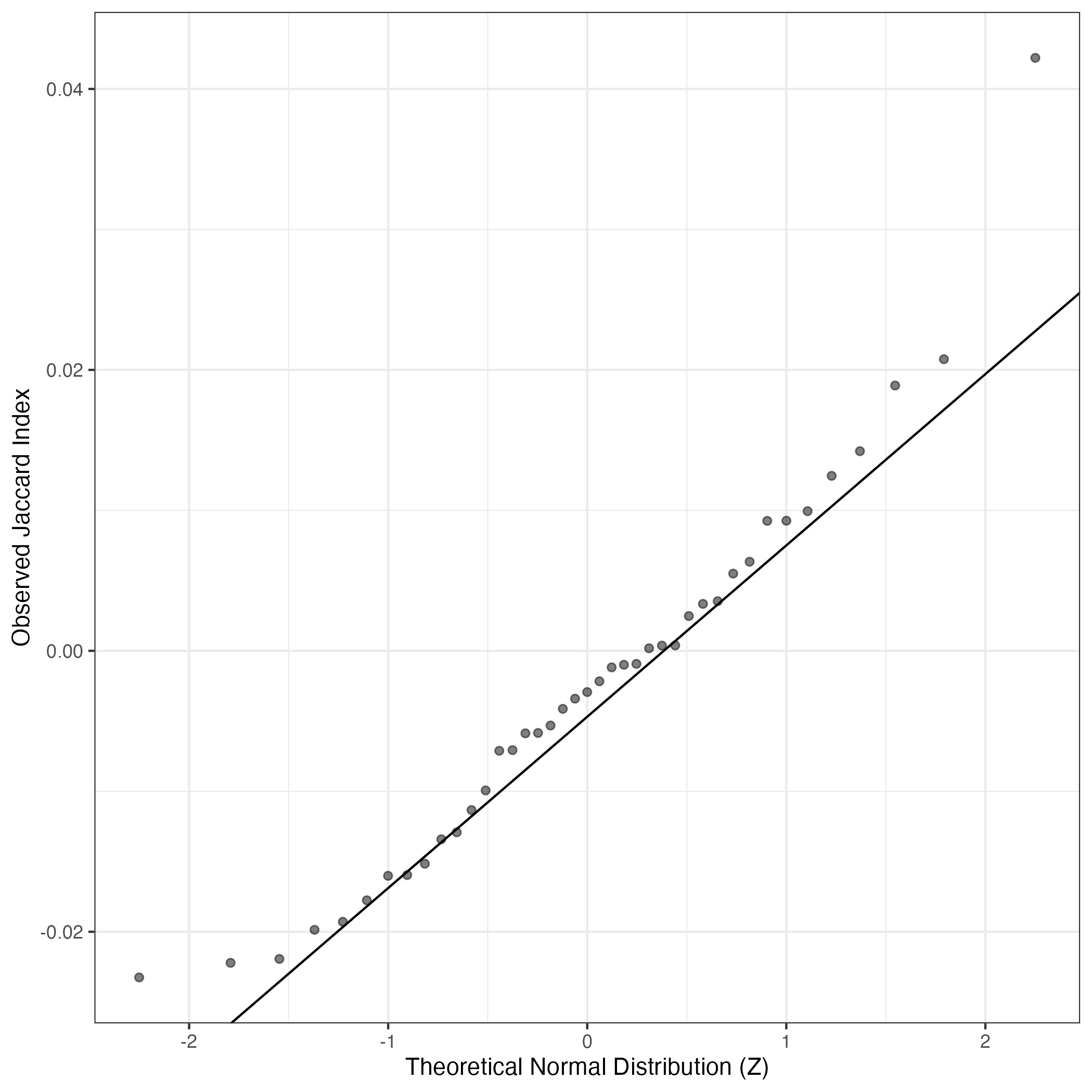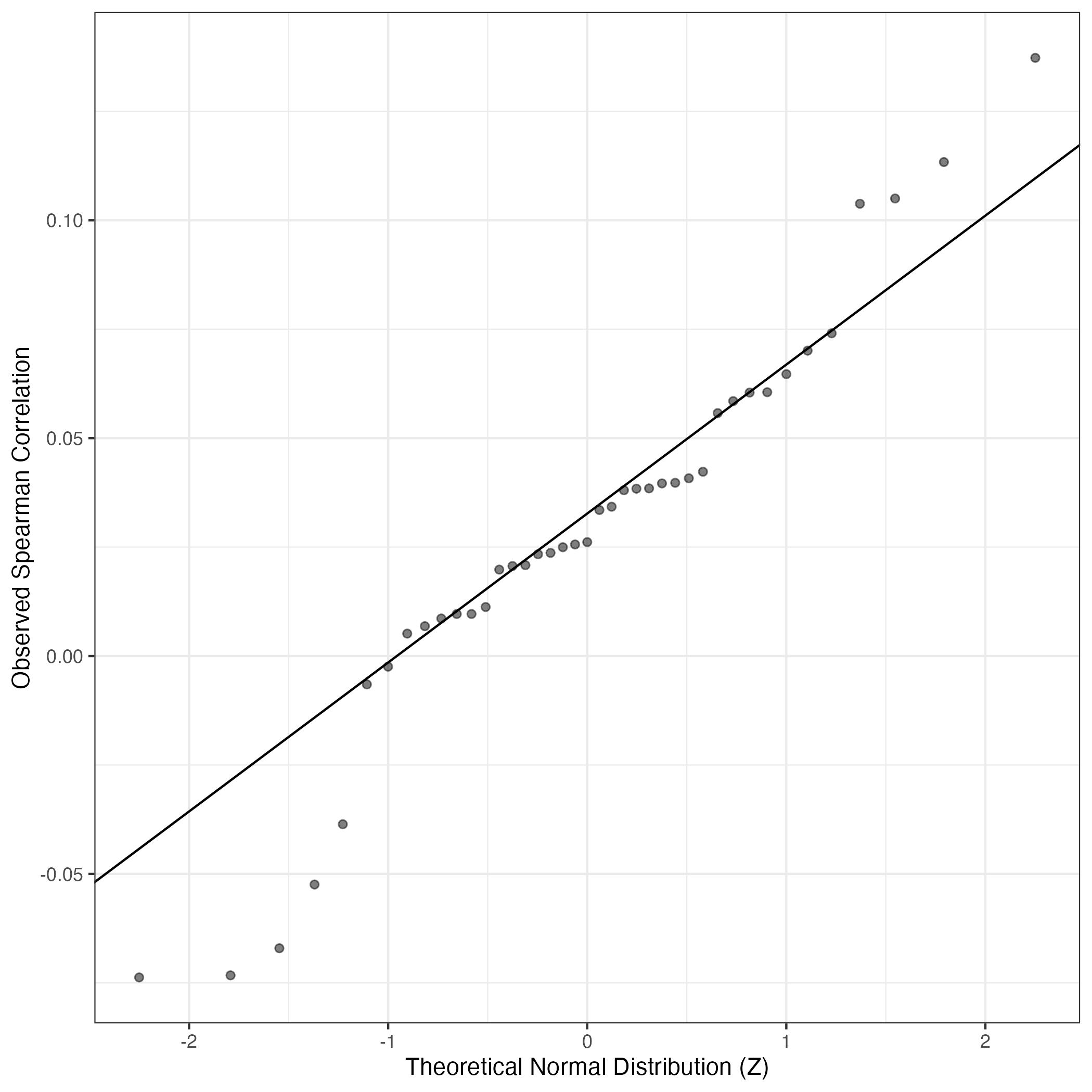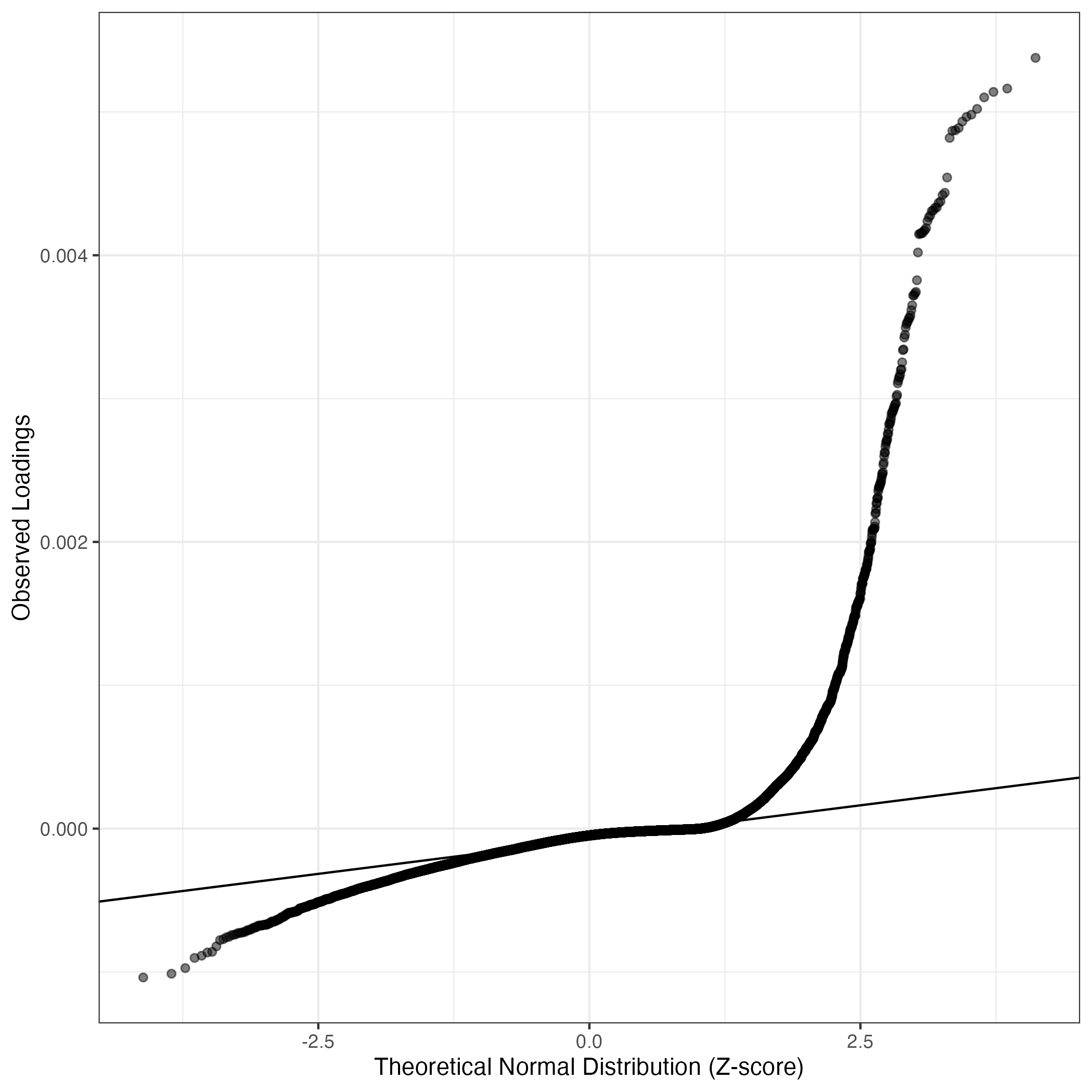 QQ-plot of gene loadings, averaged over both independent splits of the data
