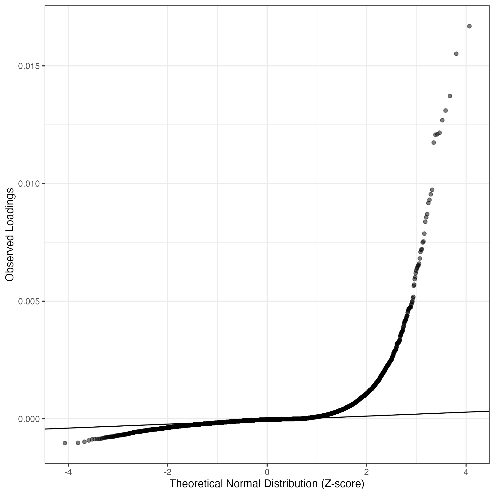 A similar QQ-plot as above, but only for instances where the H value is e.g. > 25, i.e. we are confident that the expression program is active above noise. Agreemenet between these binary vectors is tested using the Jaccard Index, with the P-values calculated by an exact test: