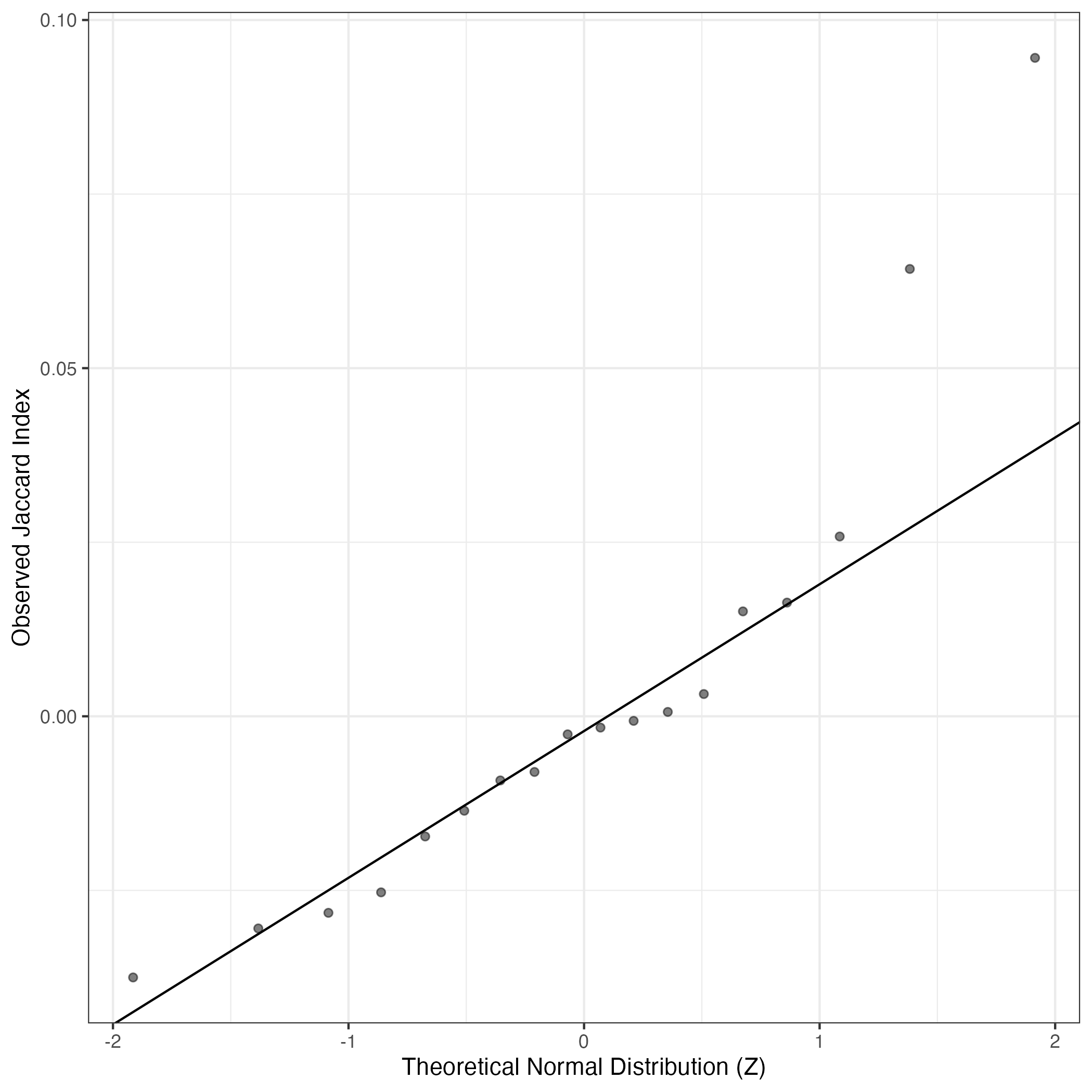 QQ-plot of gene loadings, averaged over both independent splits of the data