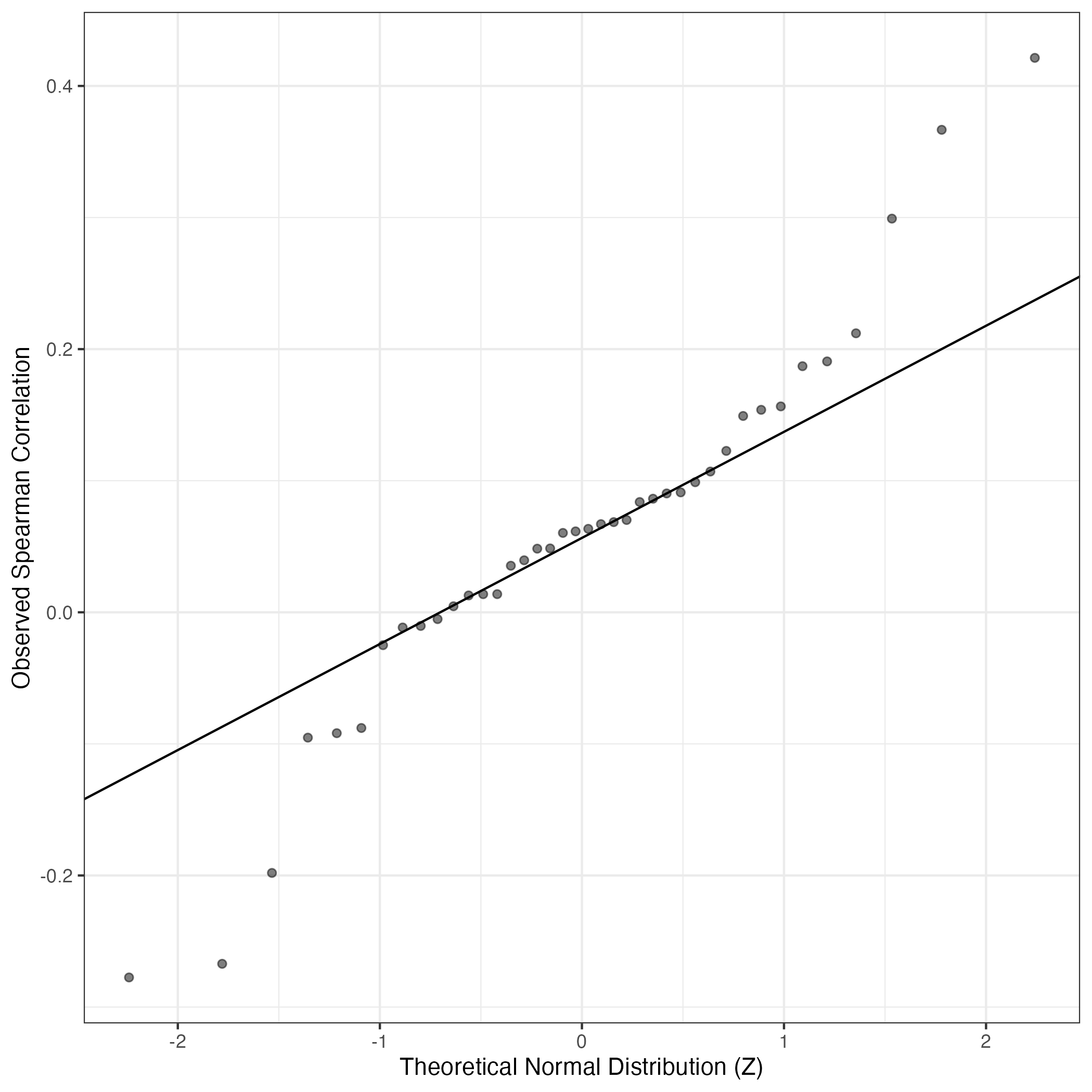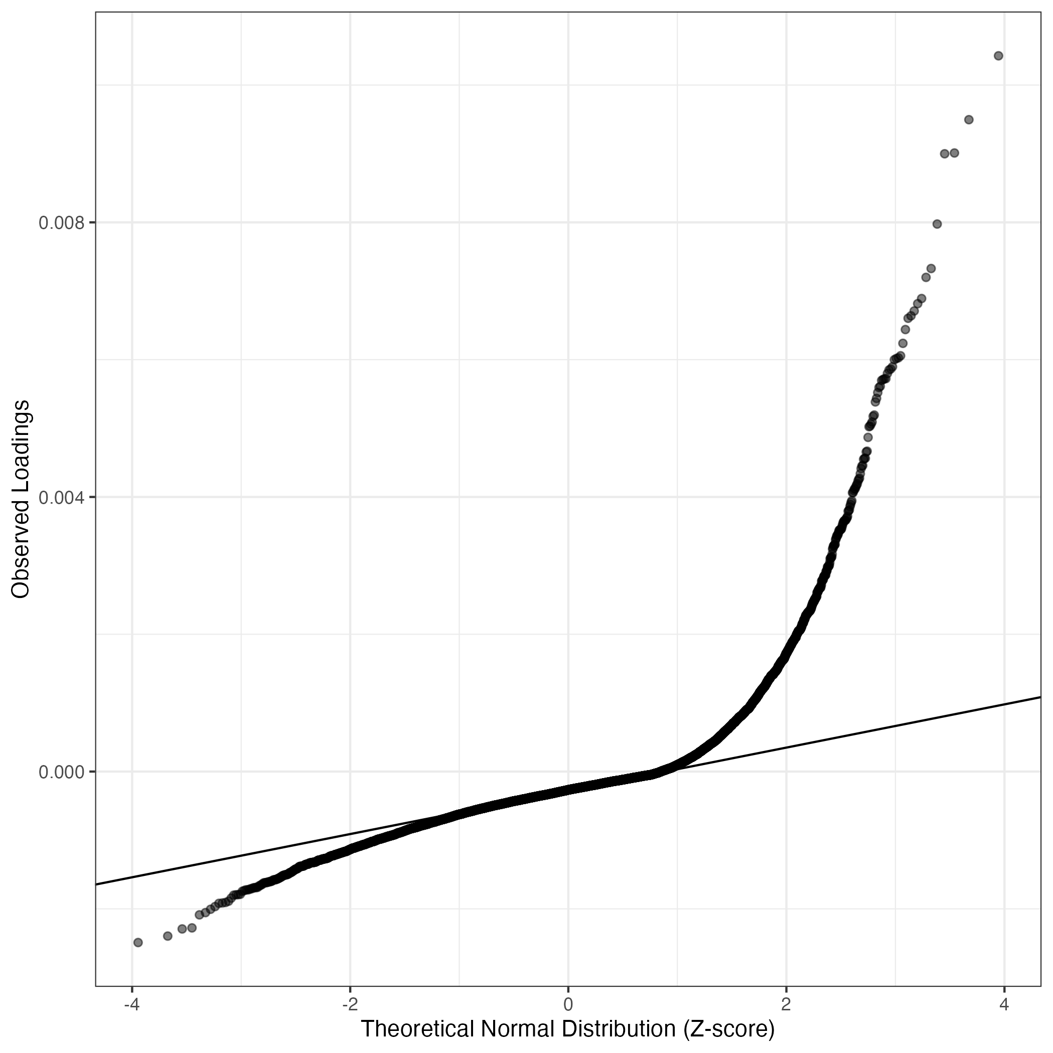 QQ-plot of gene loadings, averaged over both independent splits of the data
