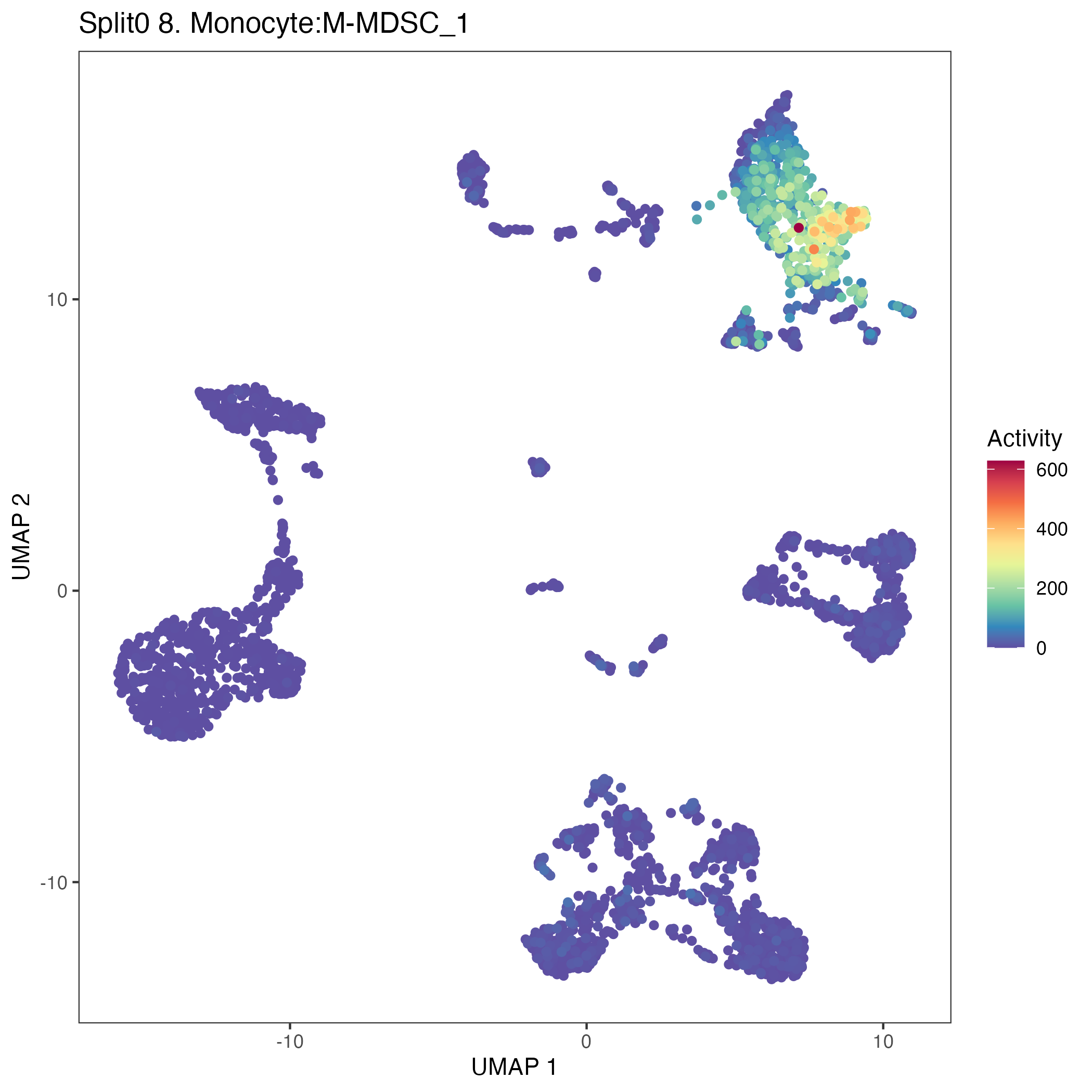 UMAP plots showing activity of gene expression program identified in GEP 8. Monocyte:M-MDSC: