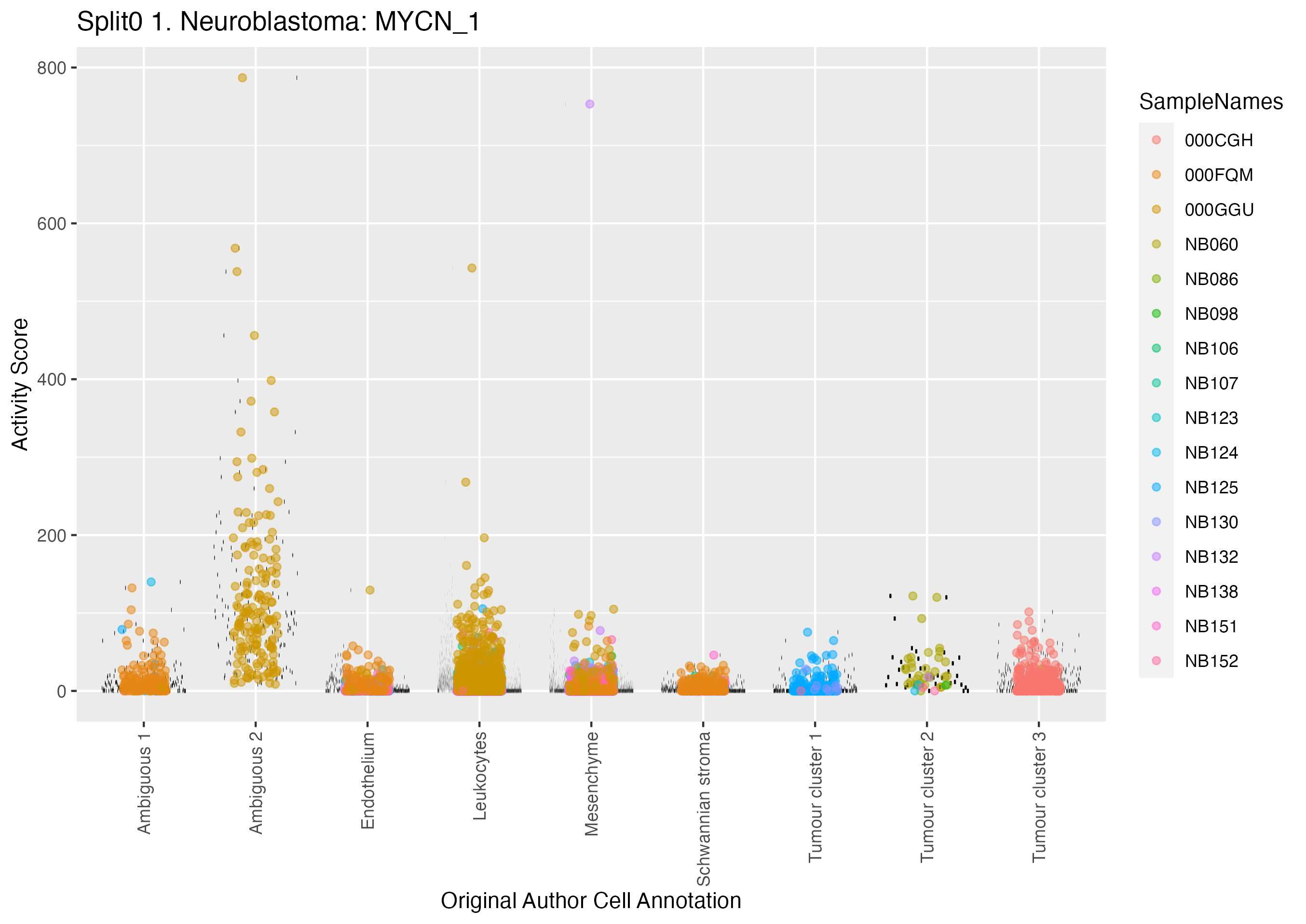 UMAP plots showing activity of gene expression program identified in community:1. Neuroblastoma: MYCN