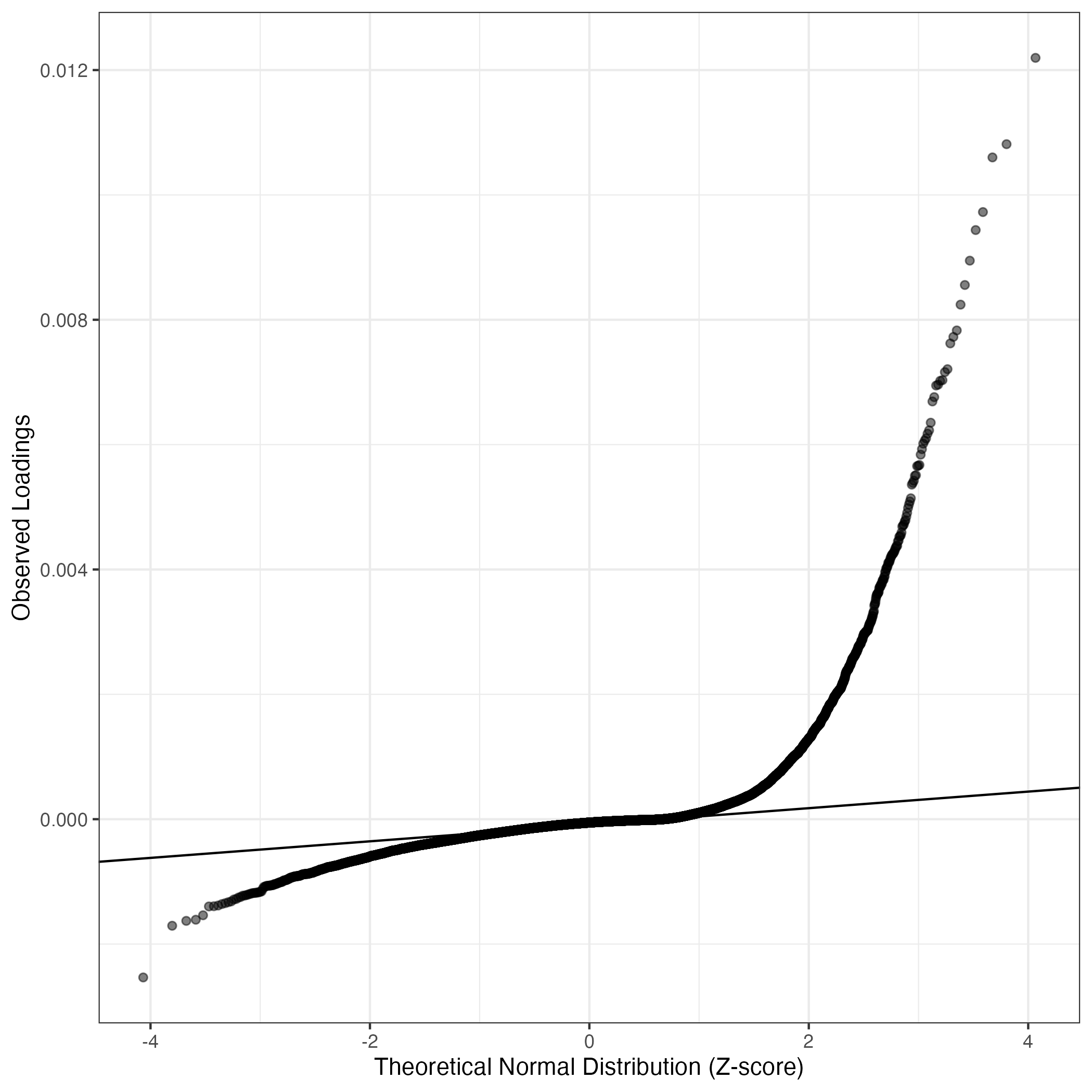 A similar QQ-plot as above, but only for instances where the H value is e.g. > 25, i.e. we are confident that the expression program is active above noise. Agreemenet between these binary vectors is tested using the Jaccard Index, with the P-values calculated by an exact test: