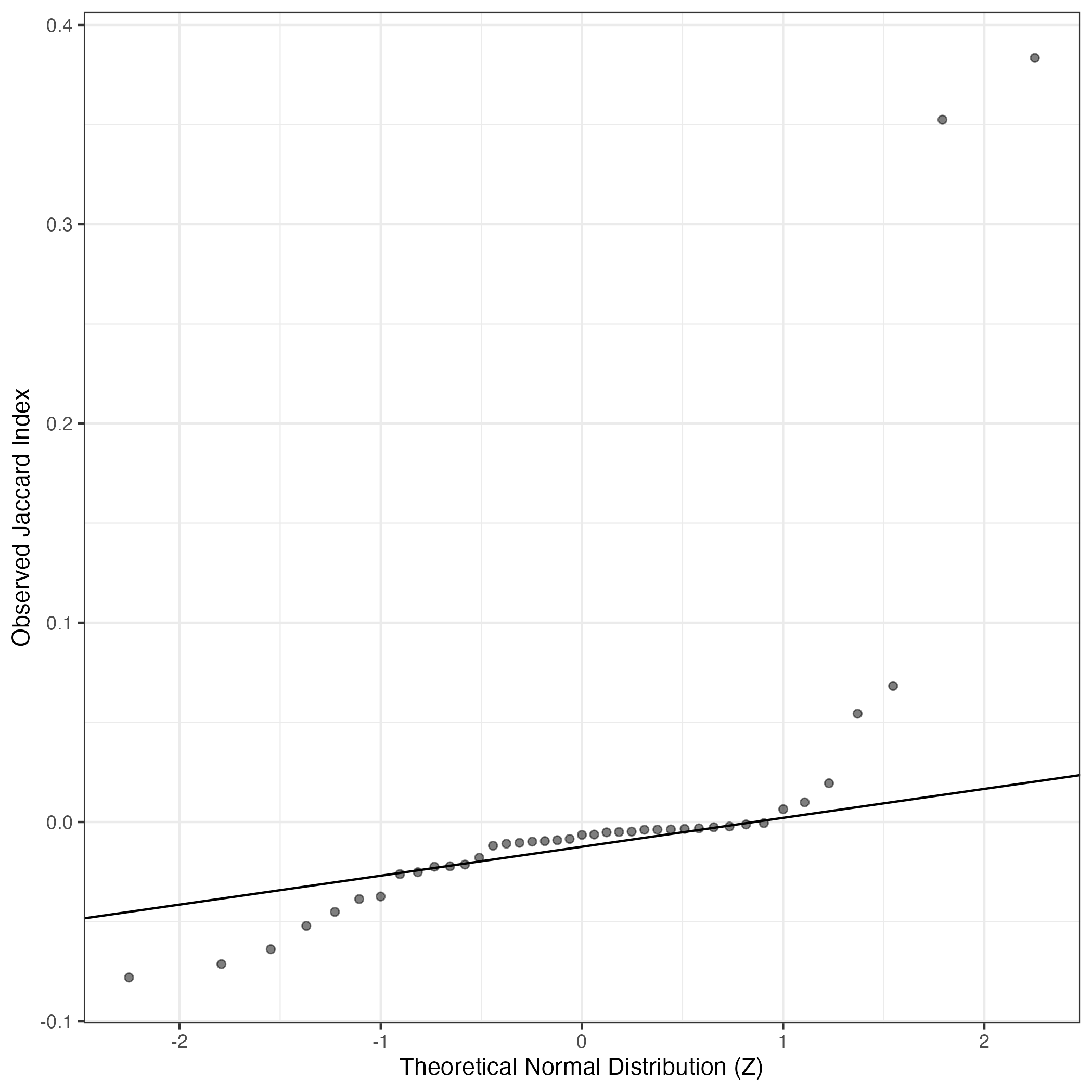QQ-plot of gene loadings, averaged over both independent splits of the data