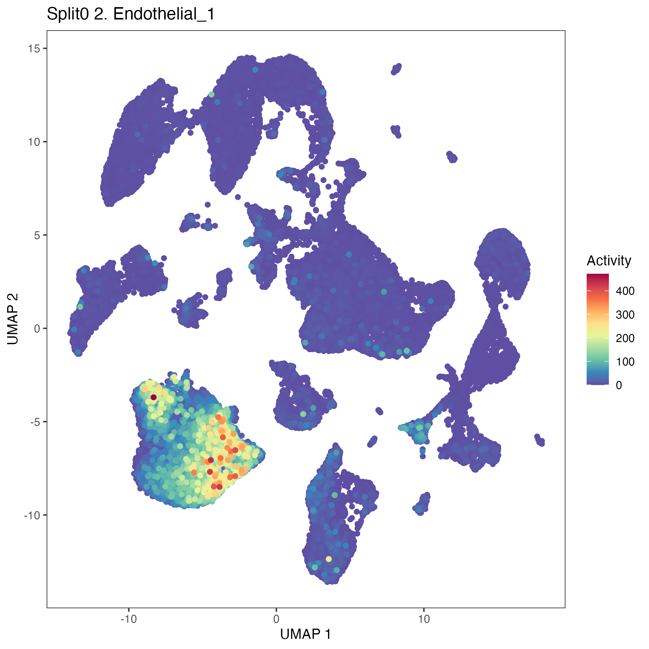 UMAP plots showing activity of gene expression program identified in GEP 2. Endothelial: