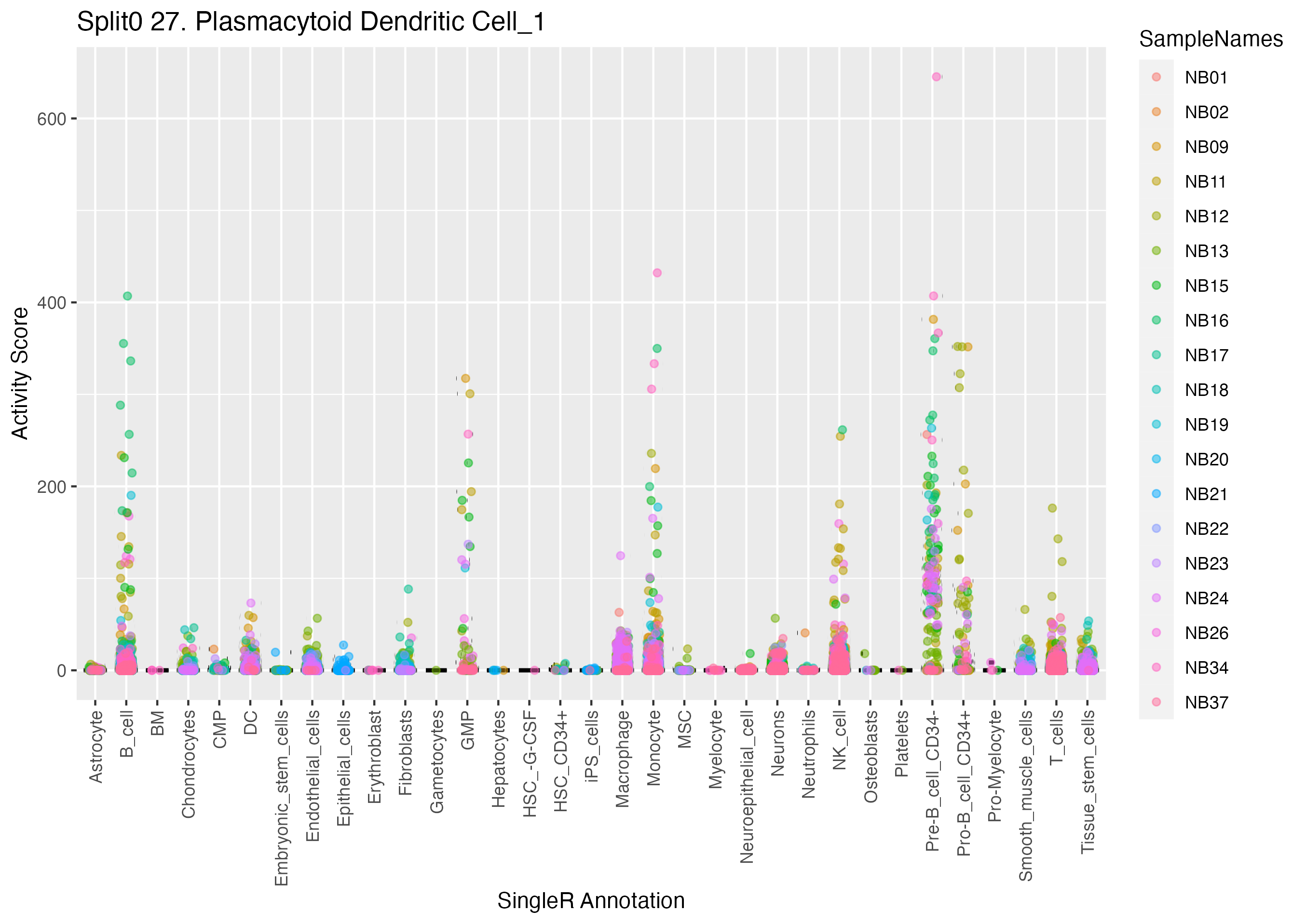 DC precursor: DC precursor (model markers) dendritic cell precursors that differentiate into dendritic cells: Wilcoxon ranksum test P-value for gene set overrepresentation: 7.87e-01 Mean rank of genes in gene set: 16869.17 Rank on gene expression program of genes in gene set: