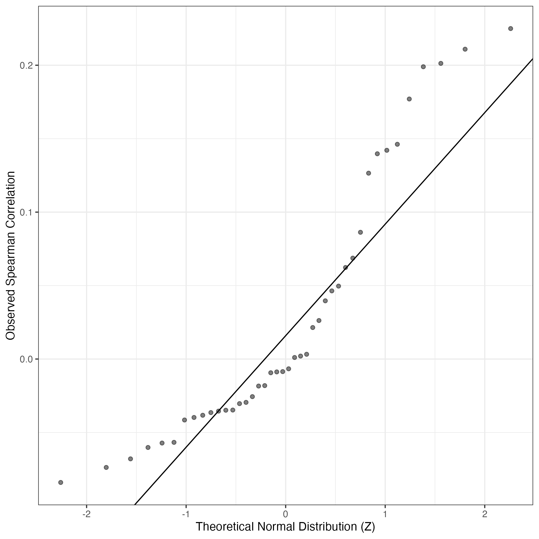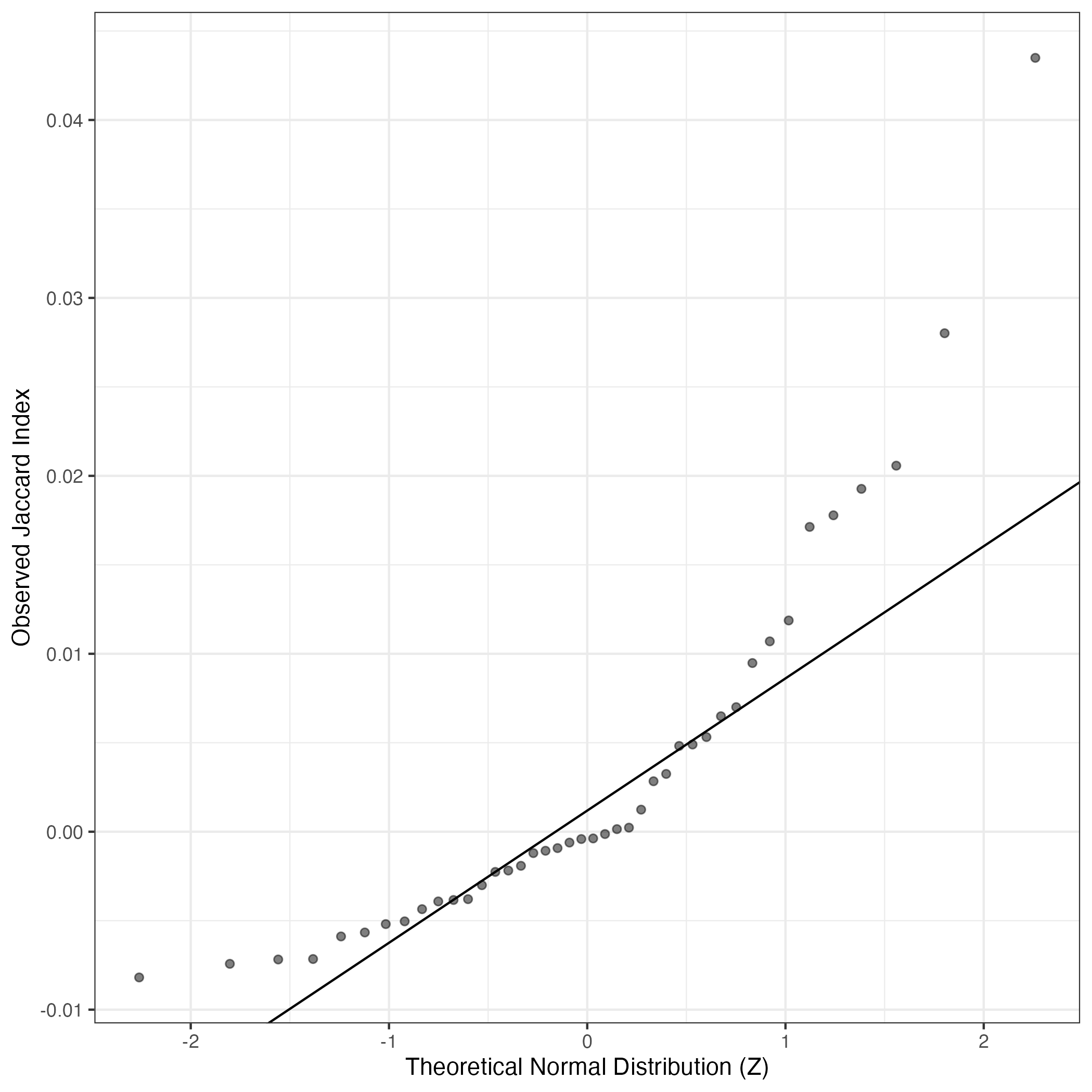 A similar QQ-plot as above, but only for instances where the H value is e.g. > 25, i.e. we are confident that the expression program is active above noise. Agreemenet between these binary vectors is tested using the Jaccard Index, with the P-values calculated by an exact test: