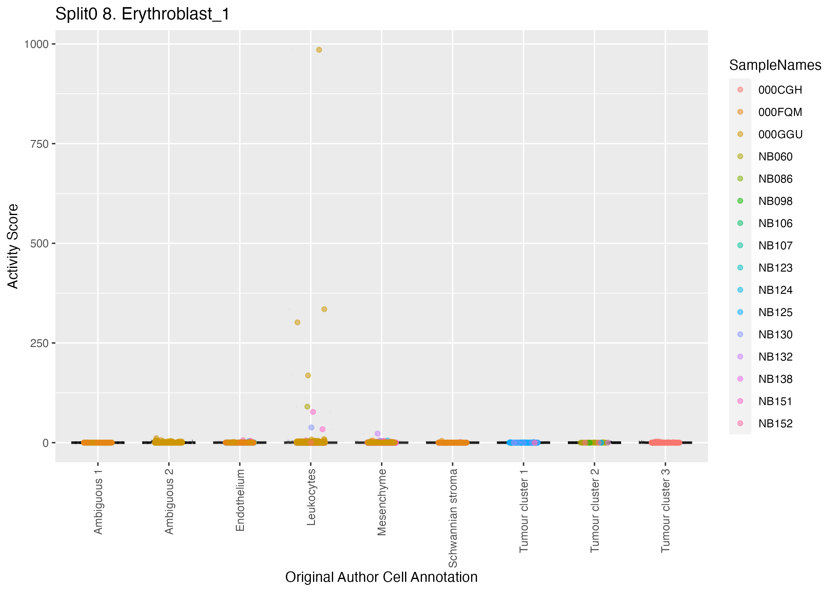 Late Neuroblasts (Jansky Fig1E) Heatmap in Fig. 1E, marker genes derived from Jansks scRNA-seq data for adrenal medulla cell types. Note: the Jansky Late Neuroblast signature is the same as the earlier Neuroblast signature, but NEFM and ALK are now absent (meaning lower expressed at later stages of differentiation): Wilcoxon ranksum test P-value for gene set overrepresentation: 8.62e-01 Mean rank of genes in gene set: 8043 Rank on gene expression program of genes in gene set:
