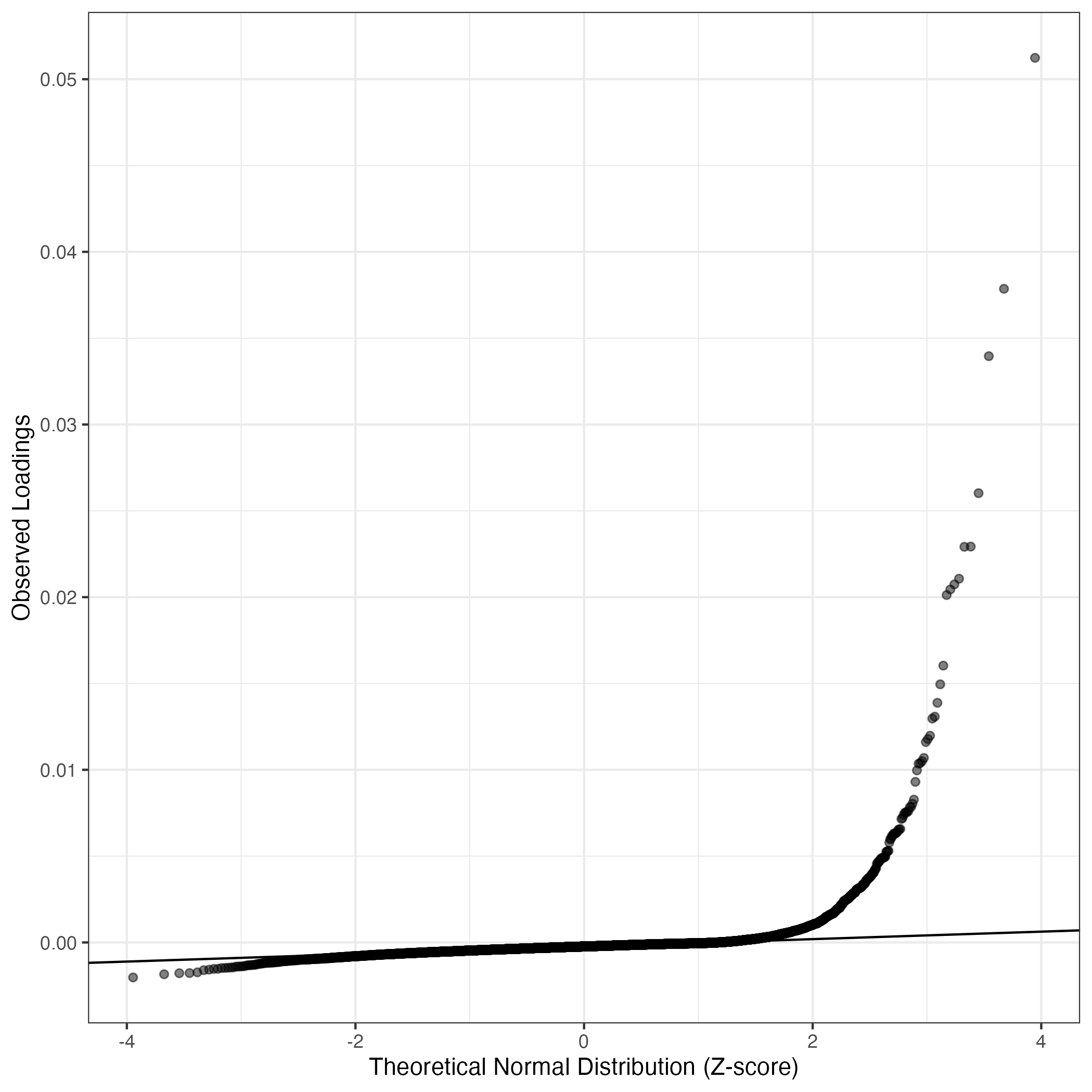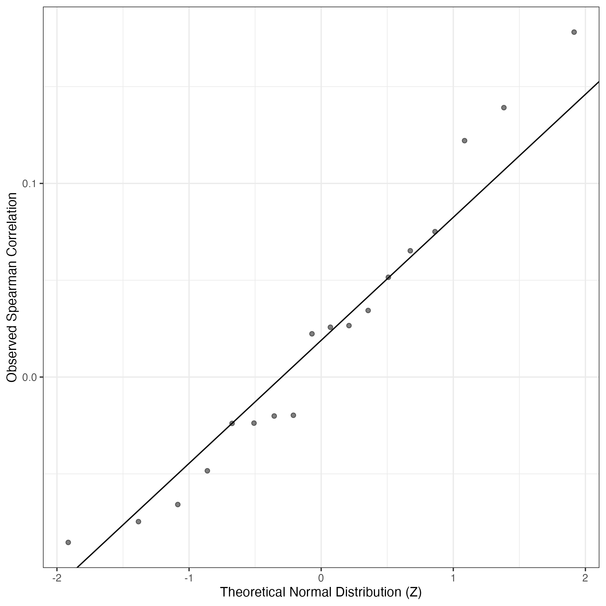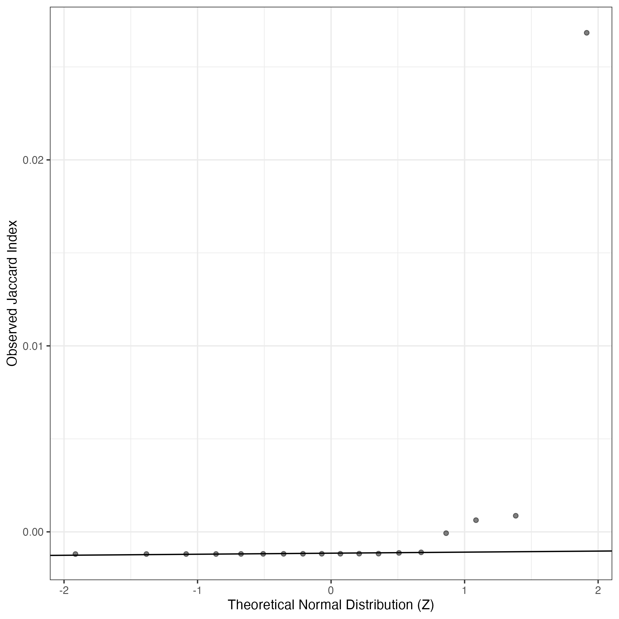 A similar QQ-plot as above, but only for instances where the H value is e.g. > 25, i.e. we are confident that the expression program is active above noise. Agreemenet between these binary vectors is tested using the Jaccard Index, with the P-values calculated by an exact test:
