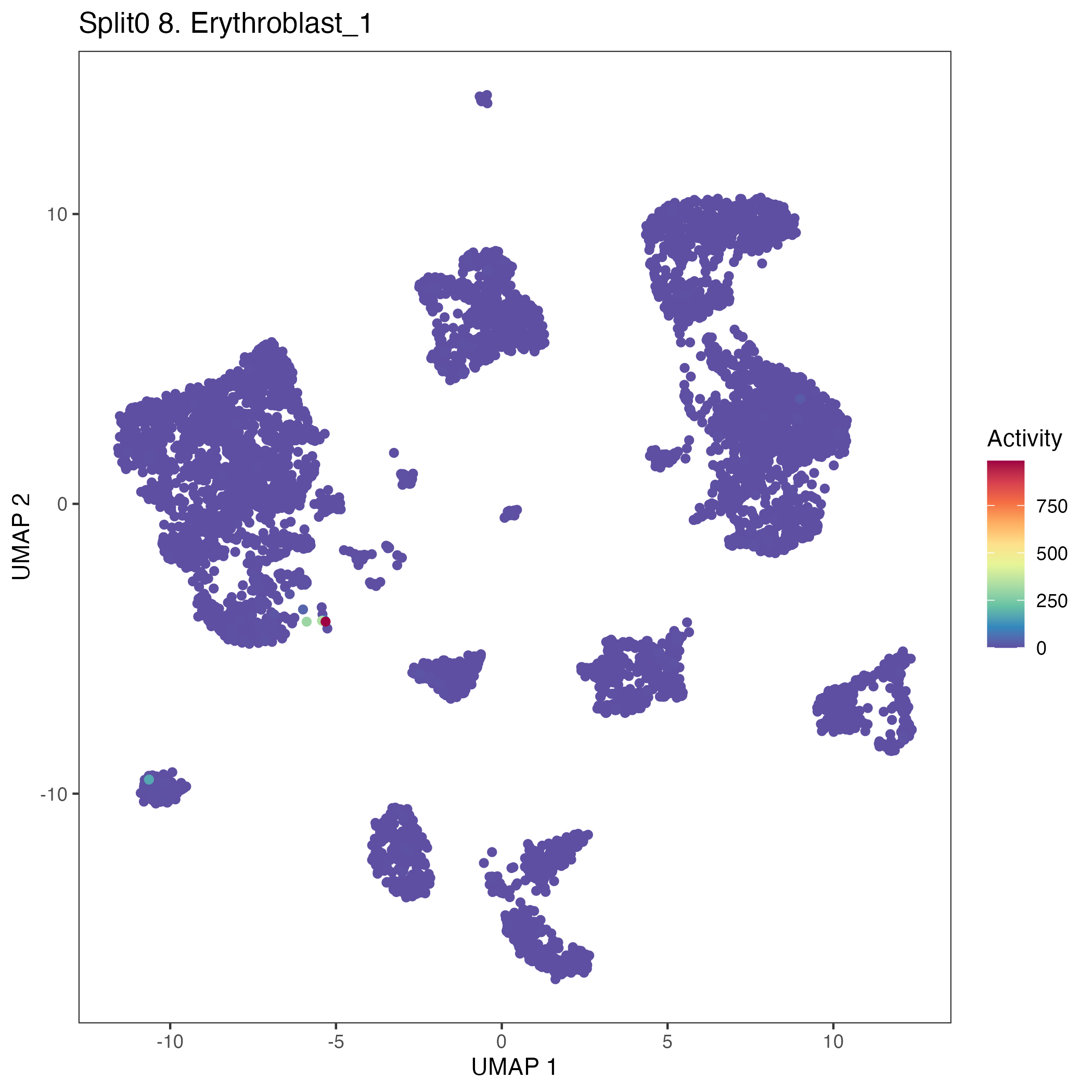 Erythroid: Early erythroid (curated markers) early erythroid cells which are committed to erythroid lineage cells: Wilcoxon ranksum test P-value for gene set overrepresentation: 3.19e-01 Mean rank of genes in gene set: 5291.67 Rank on gene expression program of genes in gene set: