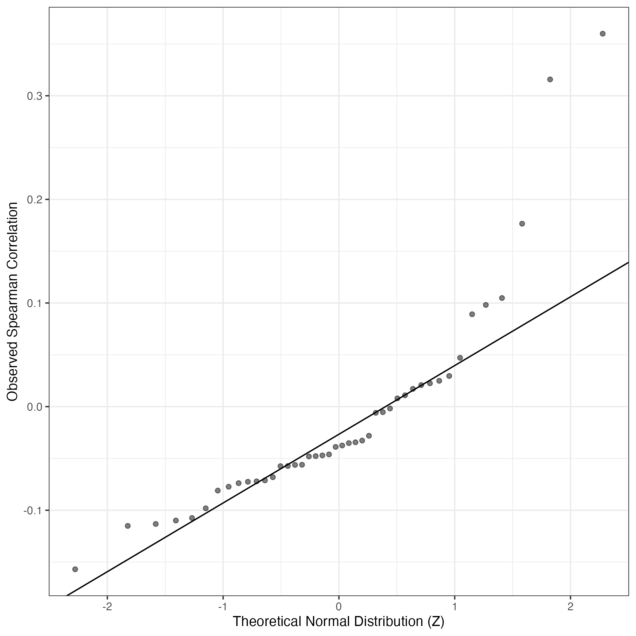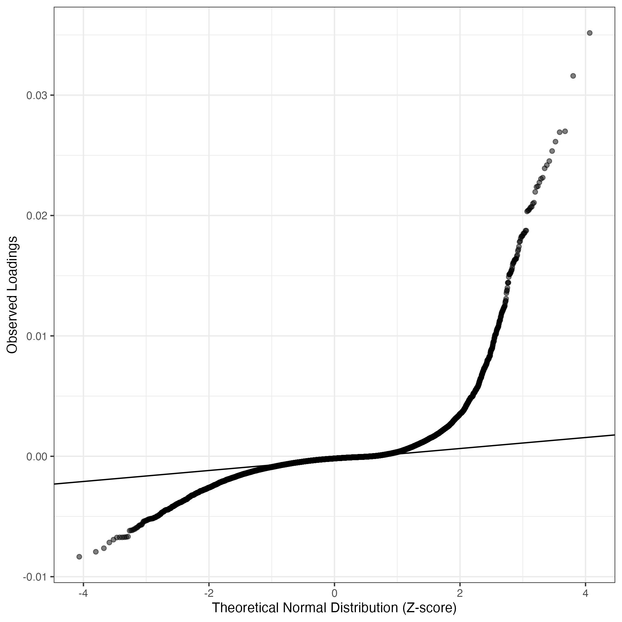 QQ-plot of gene loadings, averaged over both independent splits of the data