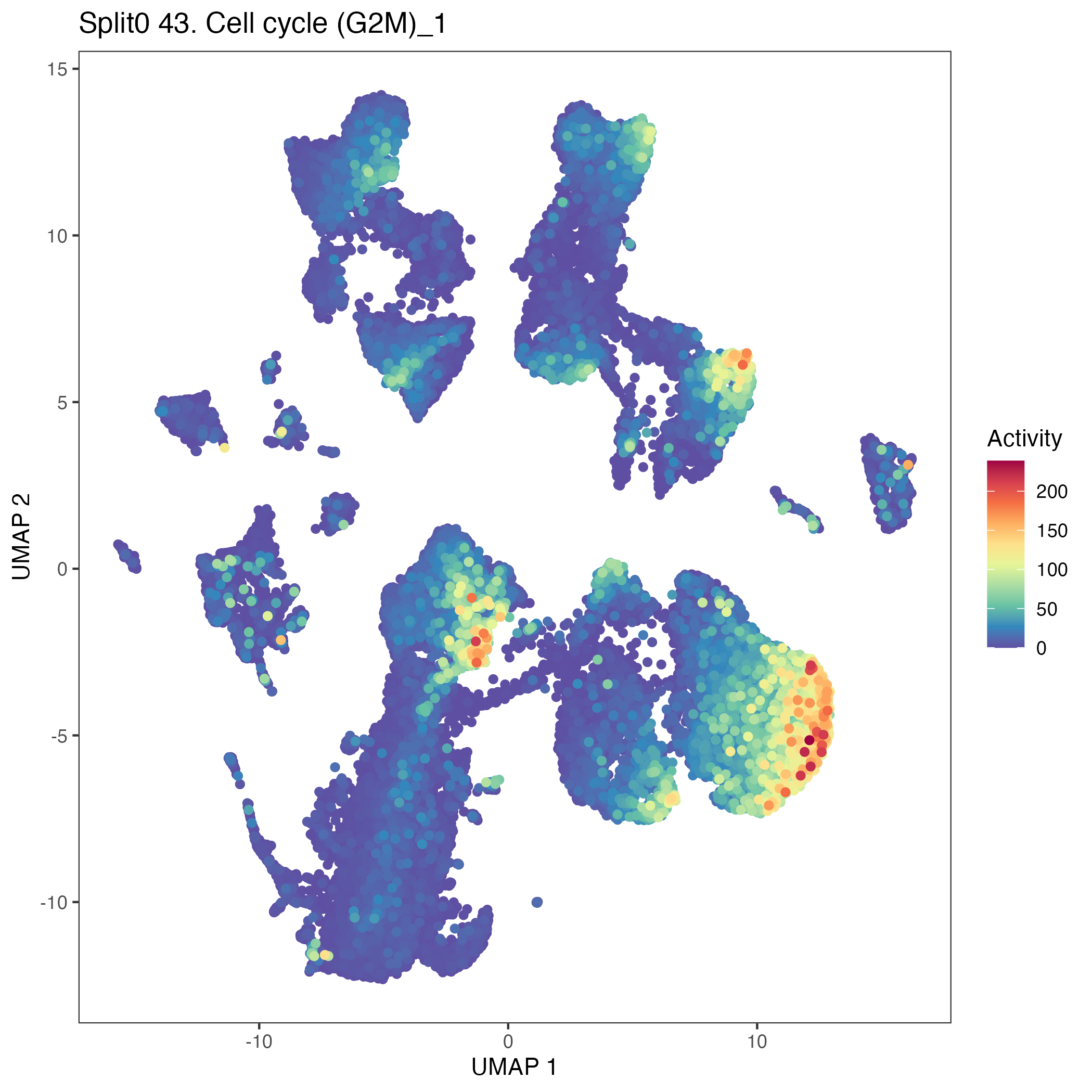 UMAP plots showing activity of gene expression program identified in community:43. Cell cycle (G2M)