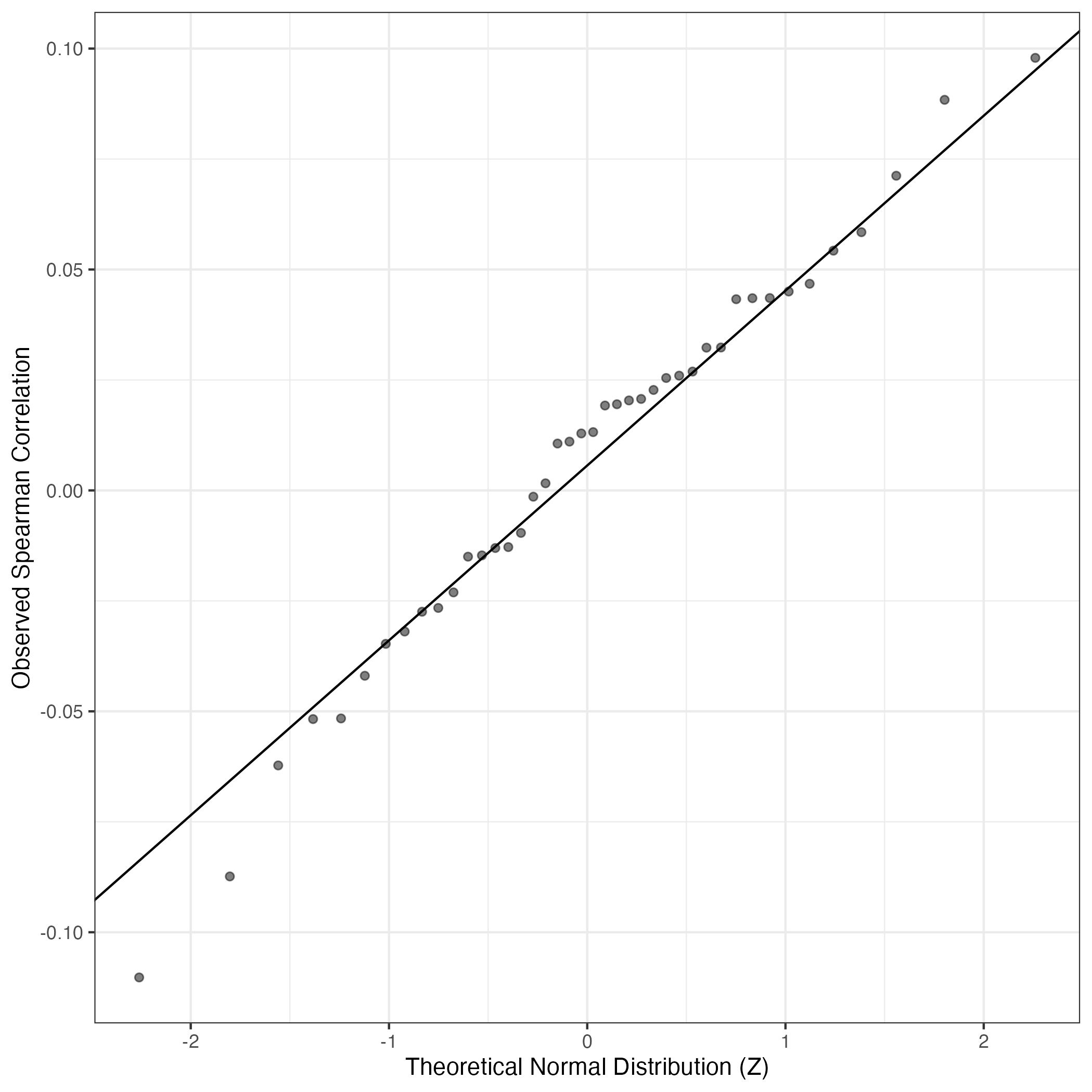 A similar QQ-plot as above, but only for instances where the H value is e.g. > 25, i.e. we are confident that the expression program is active above noise. Agreemenet between these binary vectors is tested using the Jaccard Index, with the P-values calculated by an exact test:
