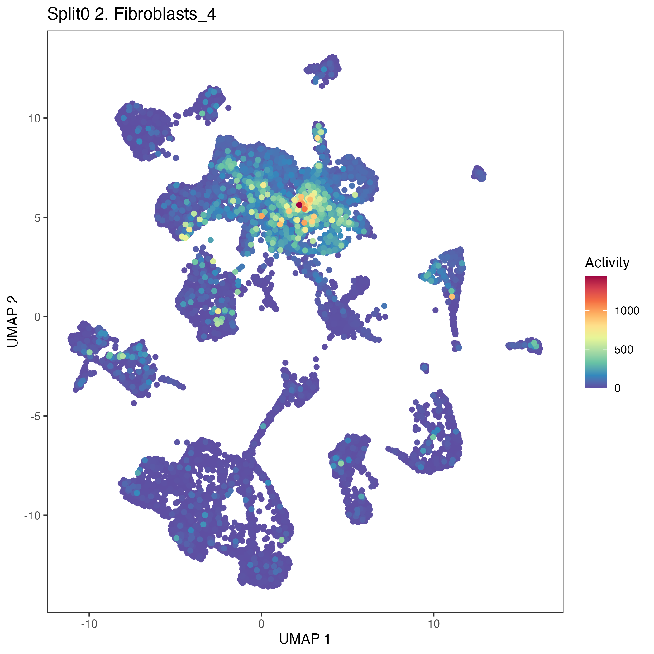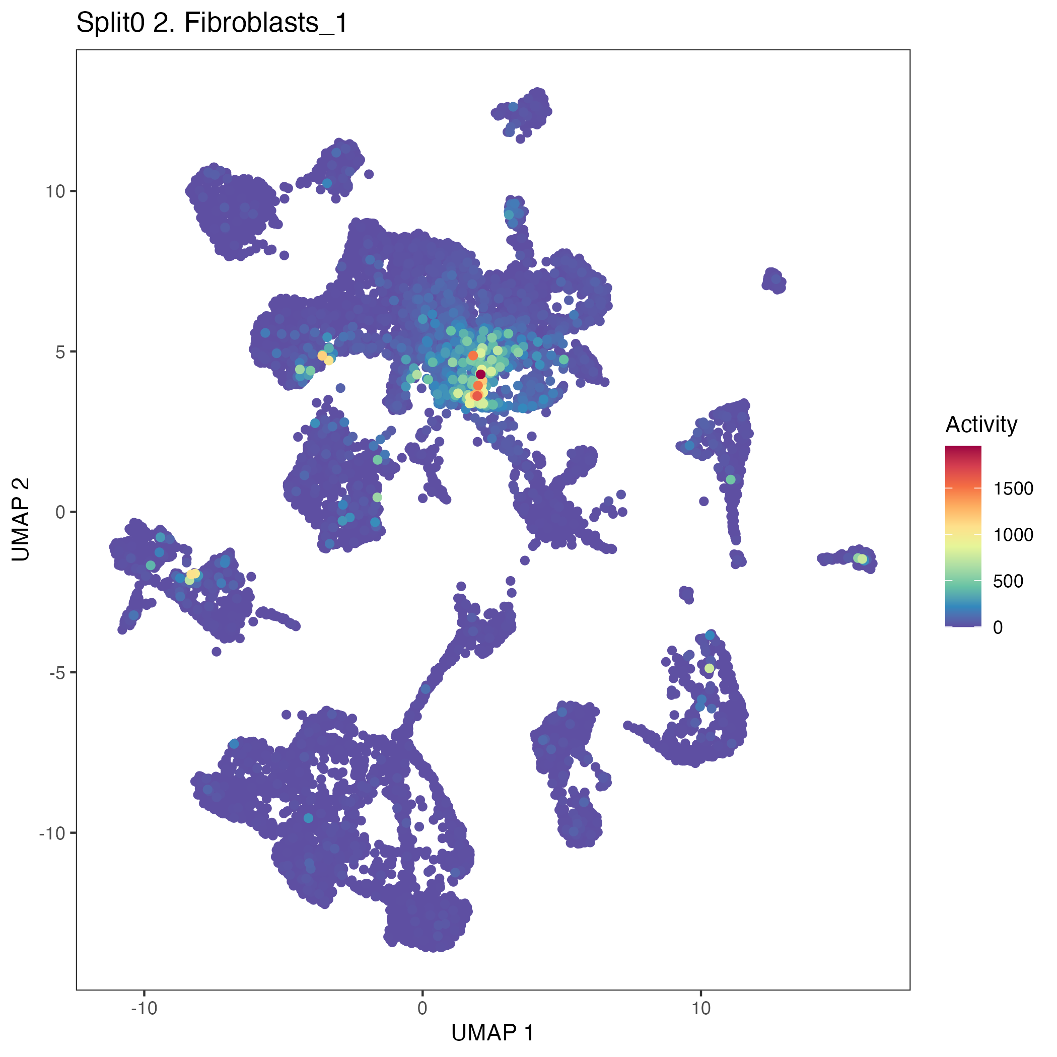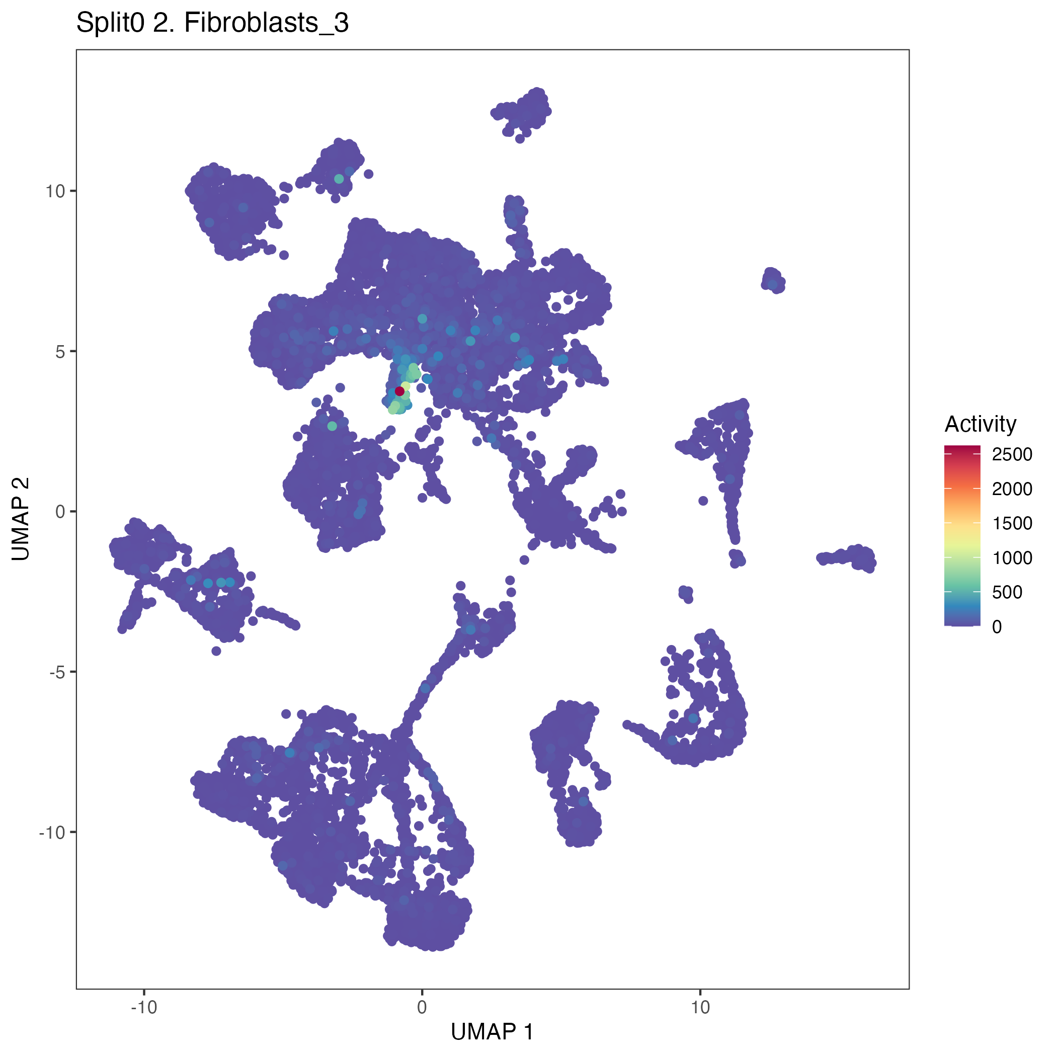 UMAP plots showing activity of gene expression program identified in GEP 2. Fibroblasts: