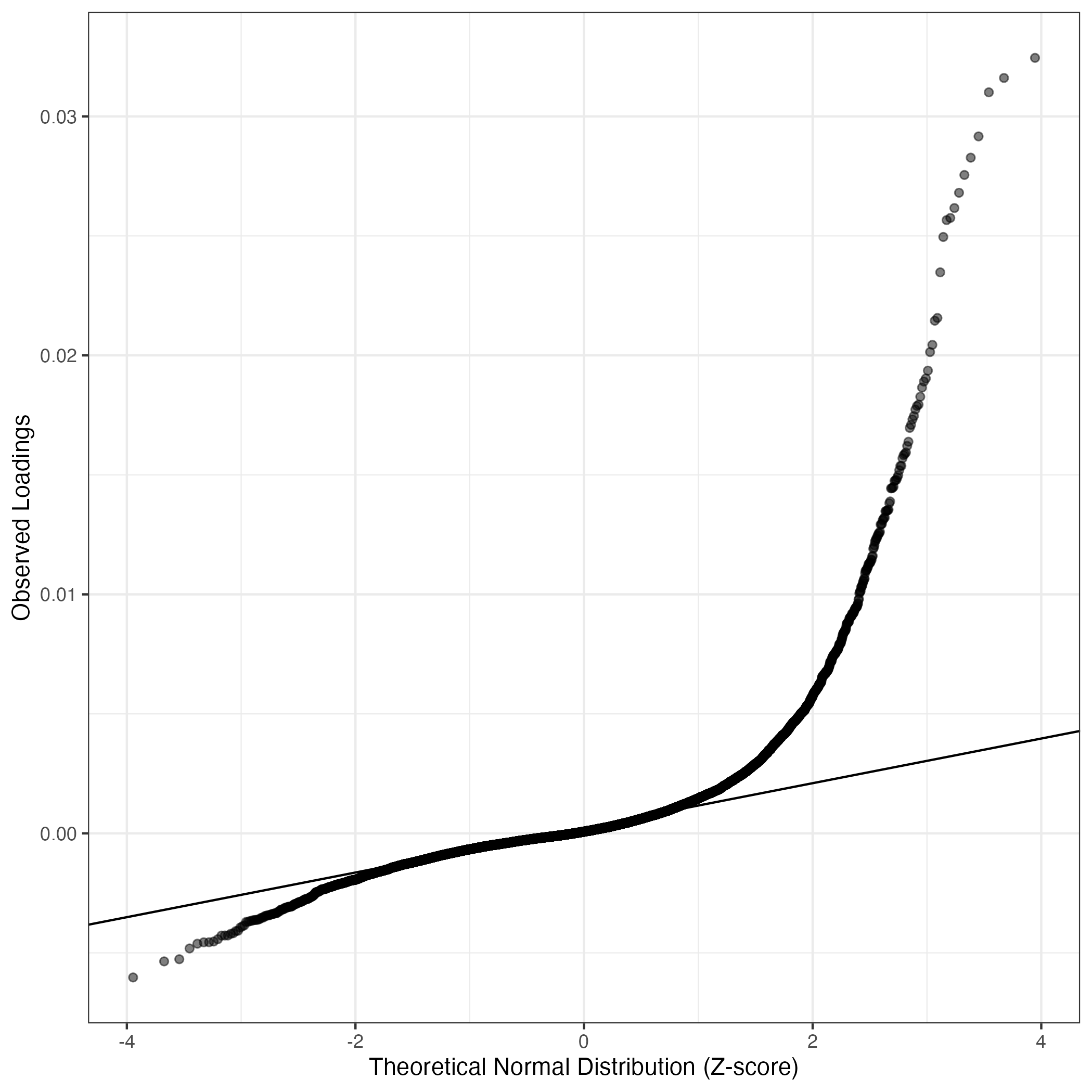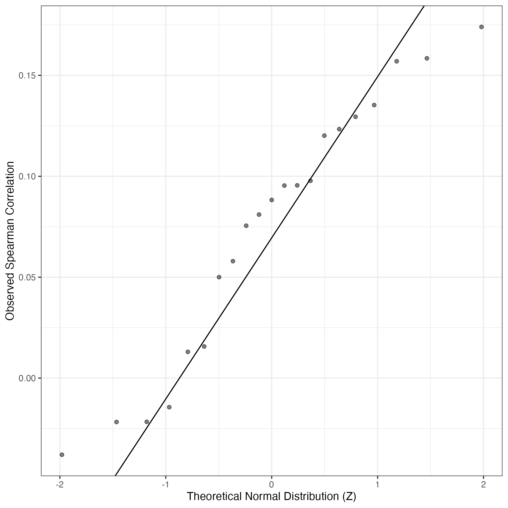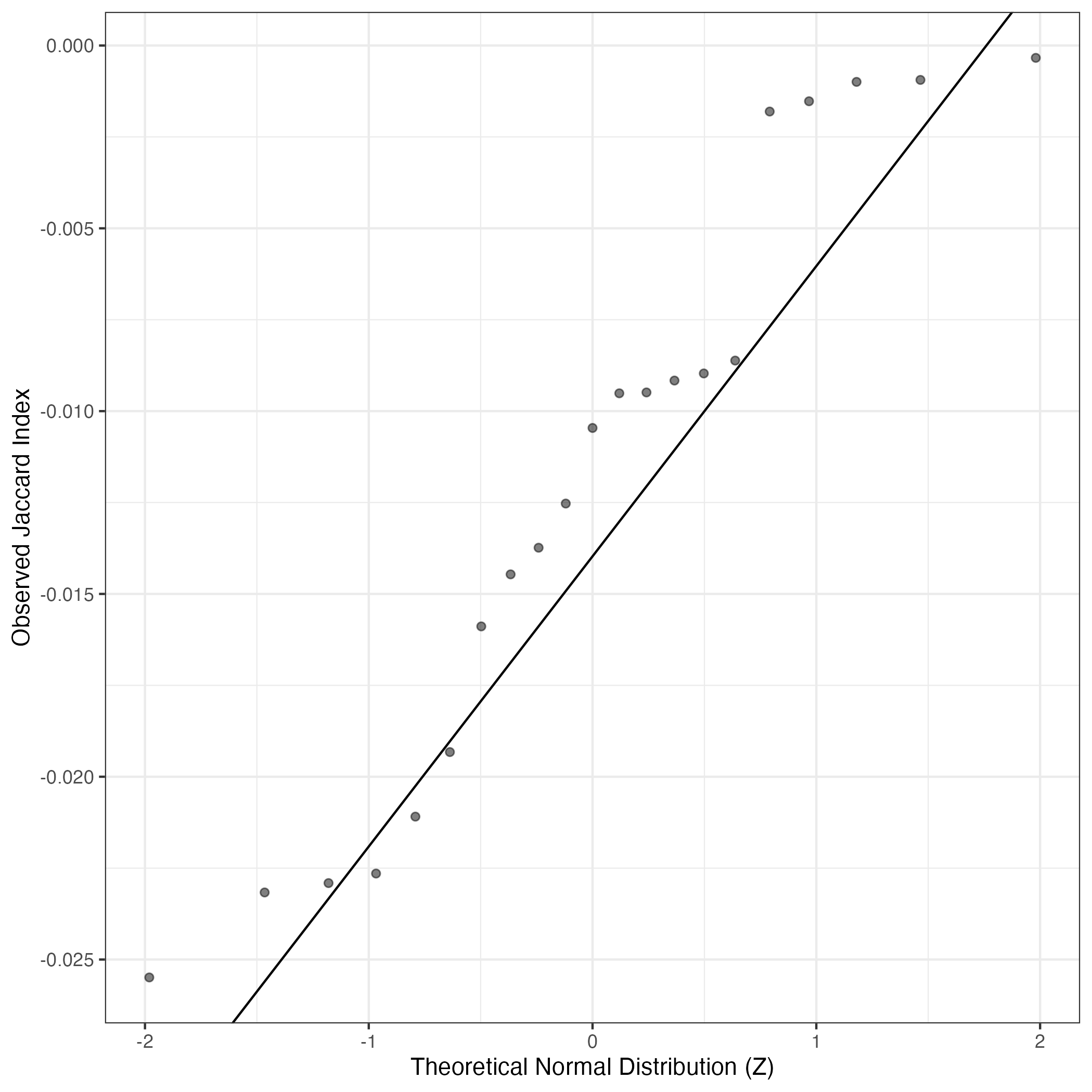 A similar QQ-plot as above, but only for instances where the H value is e.g. > 25, i.e. we are confident that the expression program is active above noise. Agreemenet between these binary vectors is tested using the Jaccard Index, with the P-values calculated by an exact test: