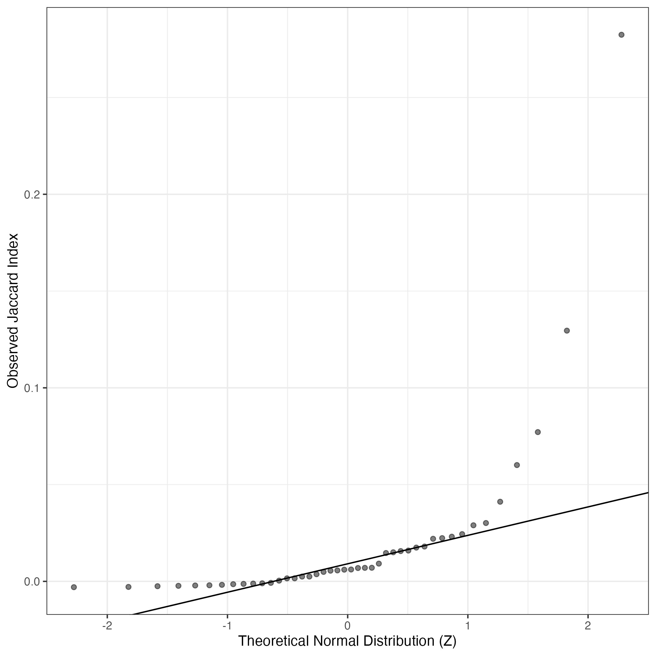A similar QQ-plot as above, but only for instances where the H value is e.g. > 25, i.e. we are confident that the expression program is active above noise. Agreemenet between these binary vectors is tested using the Jaccard Index, with the P-values calculated by an exact test: