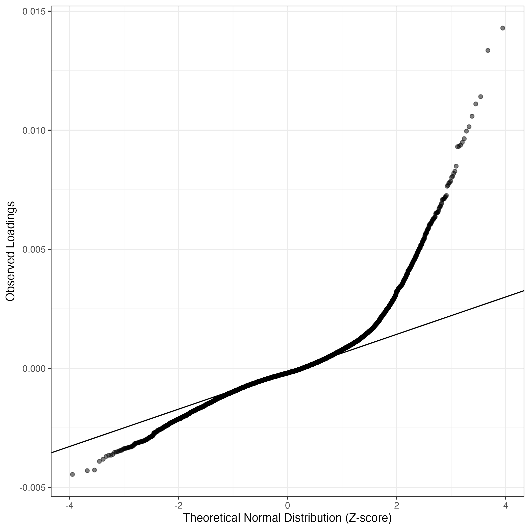 QQ-plot of gene loadings, averaged over both independent splits of the data
