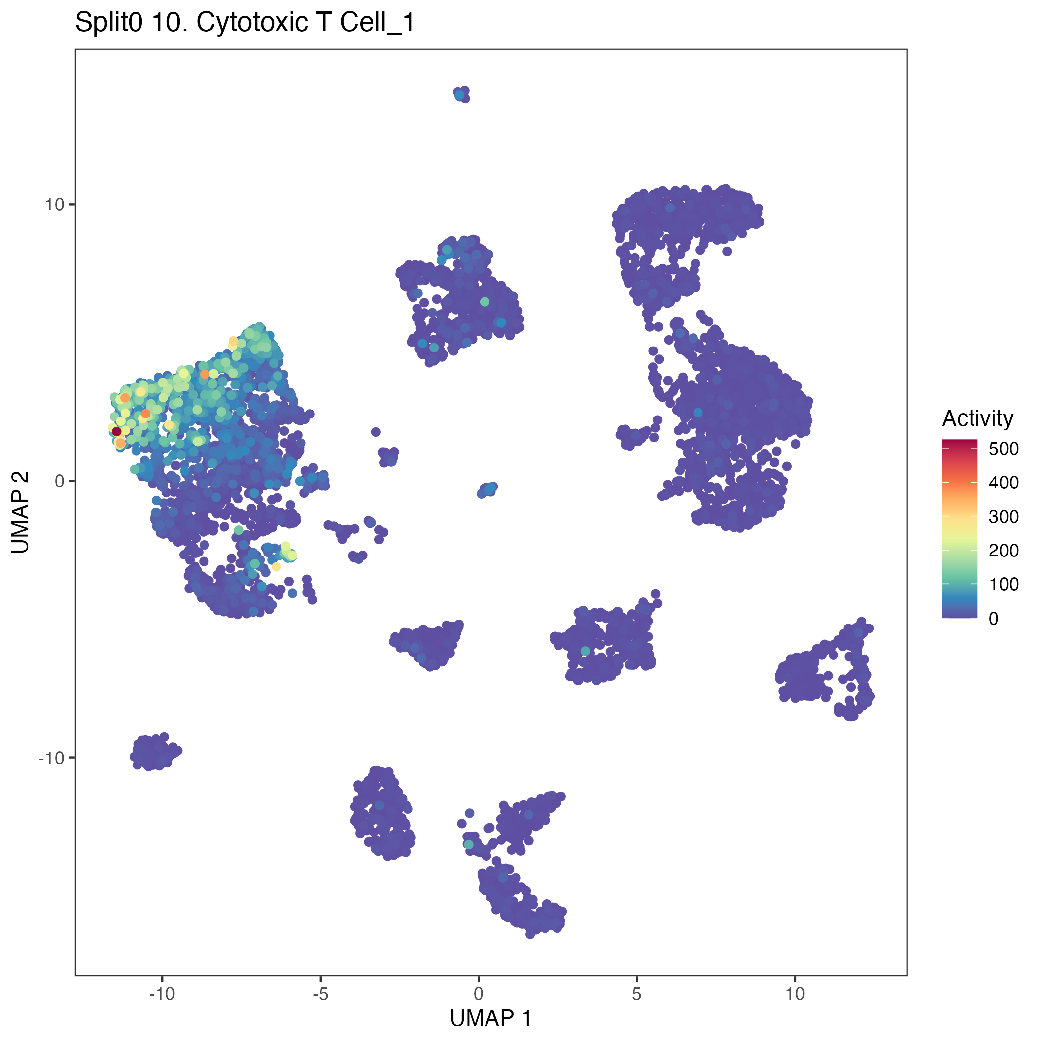 UMAP plots showing activity of gene expression program identified in community:10. Cytotoxic T Cell