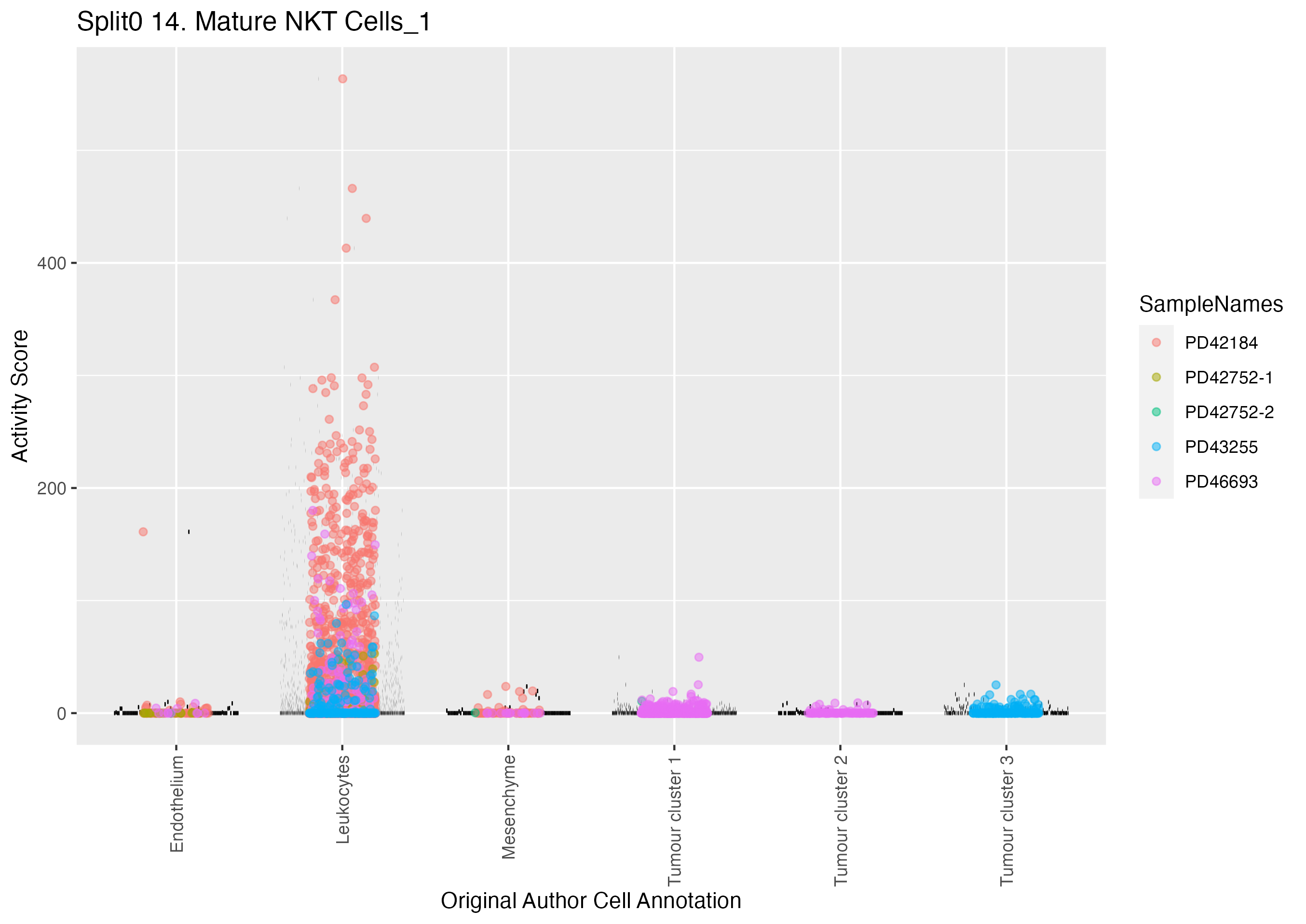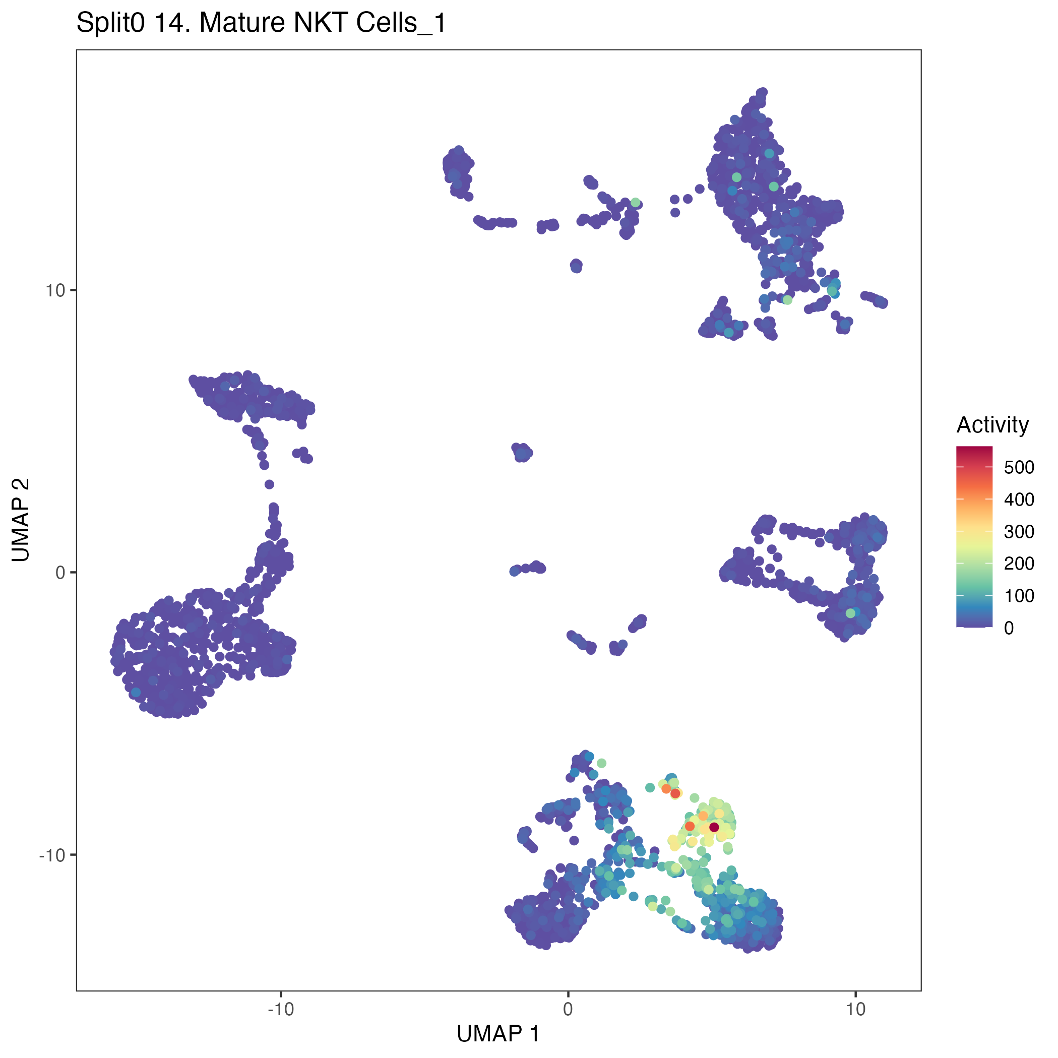 UMAP plots showing activity of gene expression program identified in GEP 14. Mature NKT Cells: