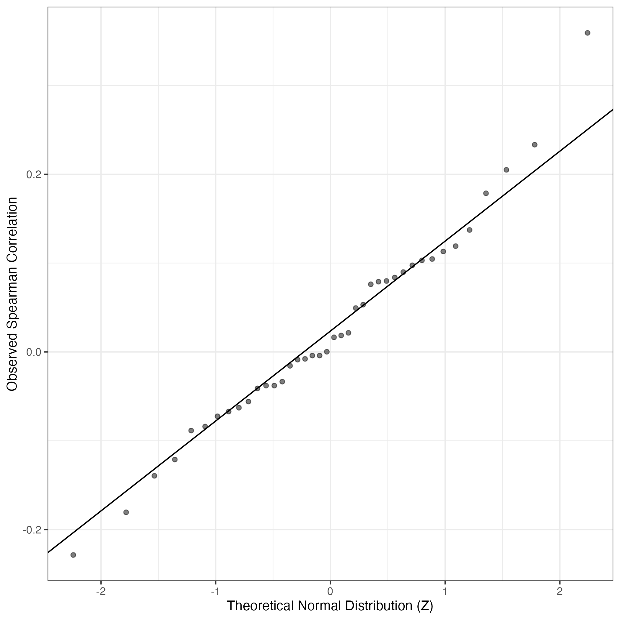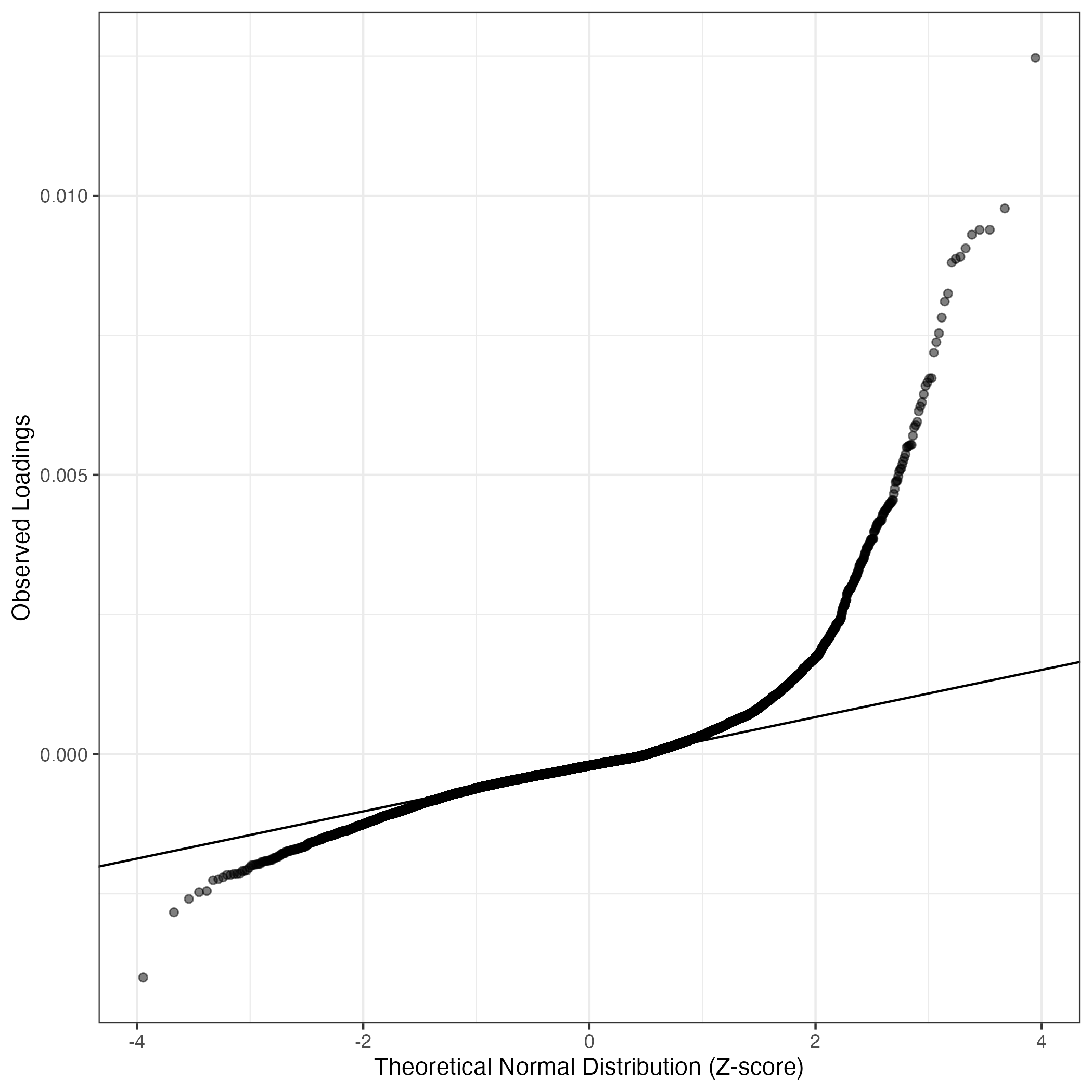 QQ-plot of gene loadings, averaged over both independent splits of the data