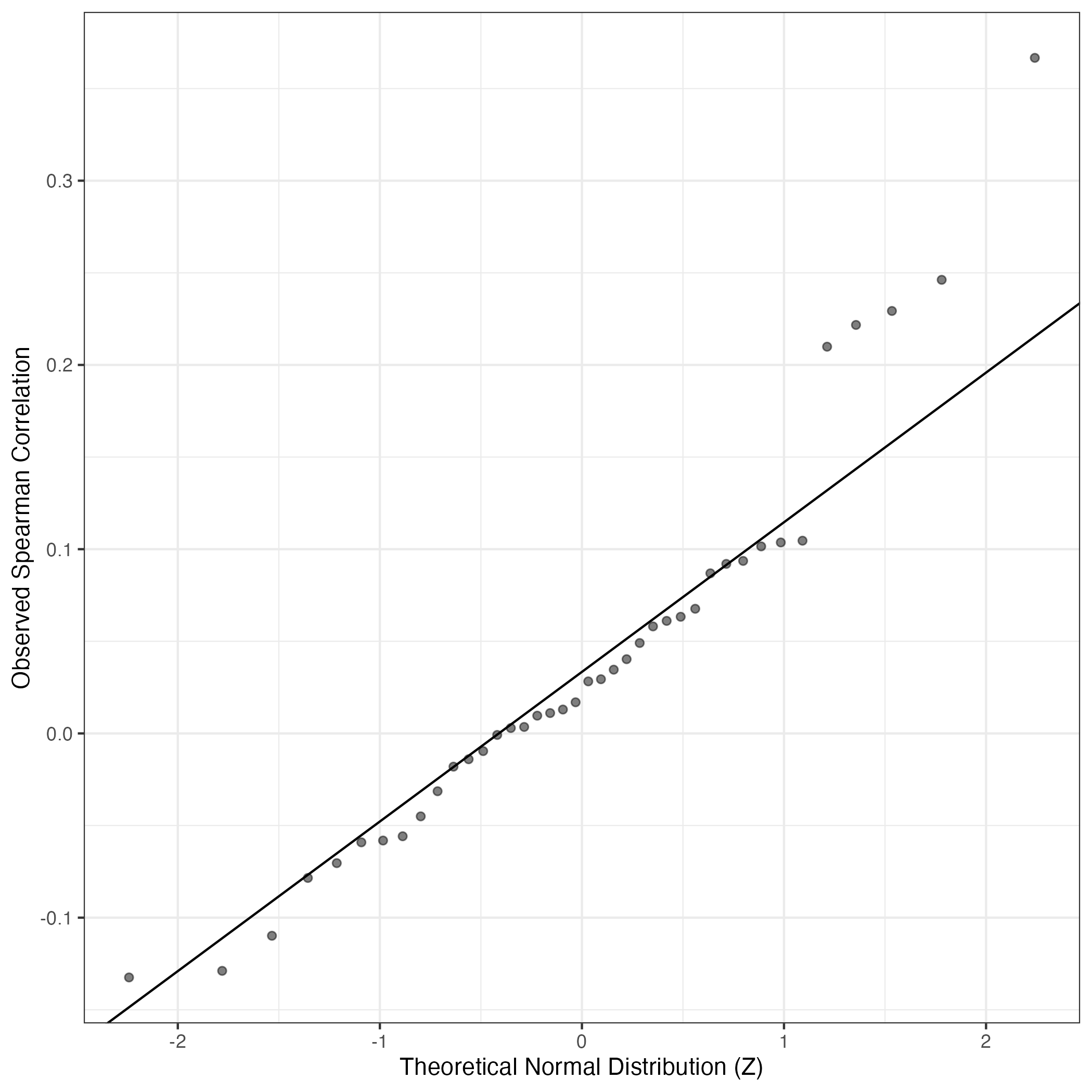 QQ-plot of gene loadings, averaged over both independent splits of the data