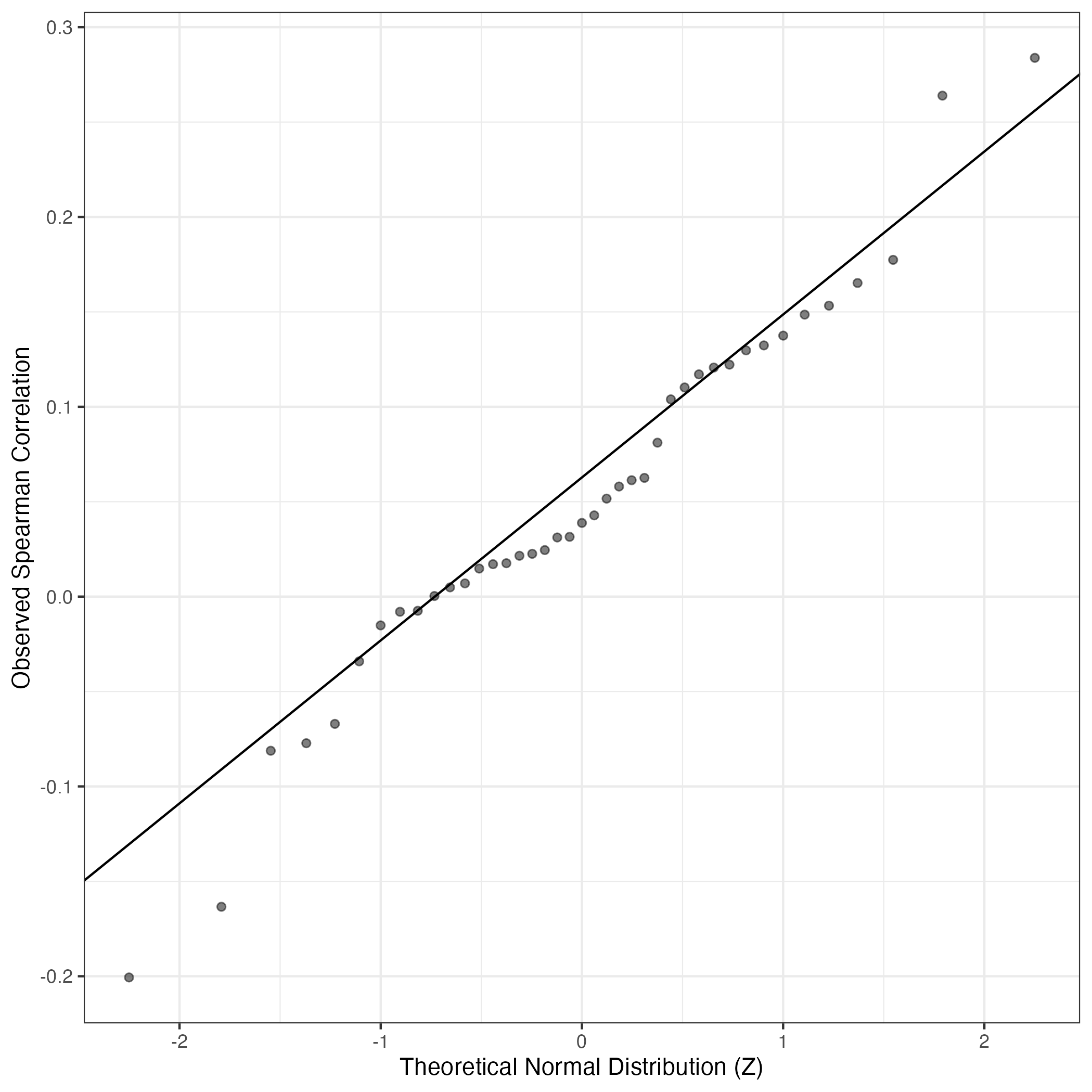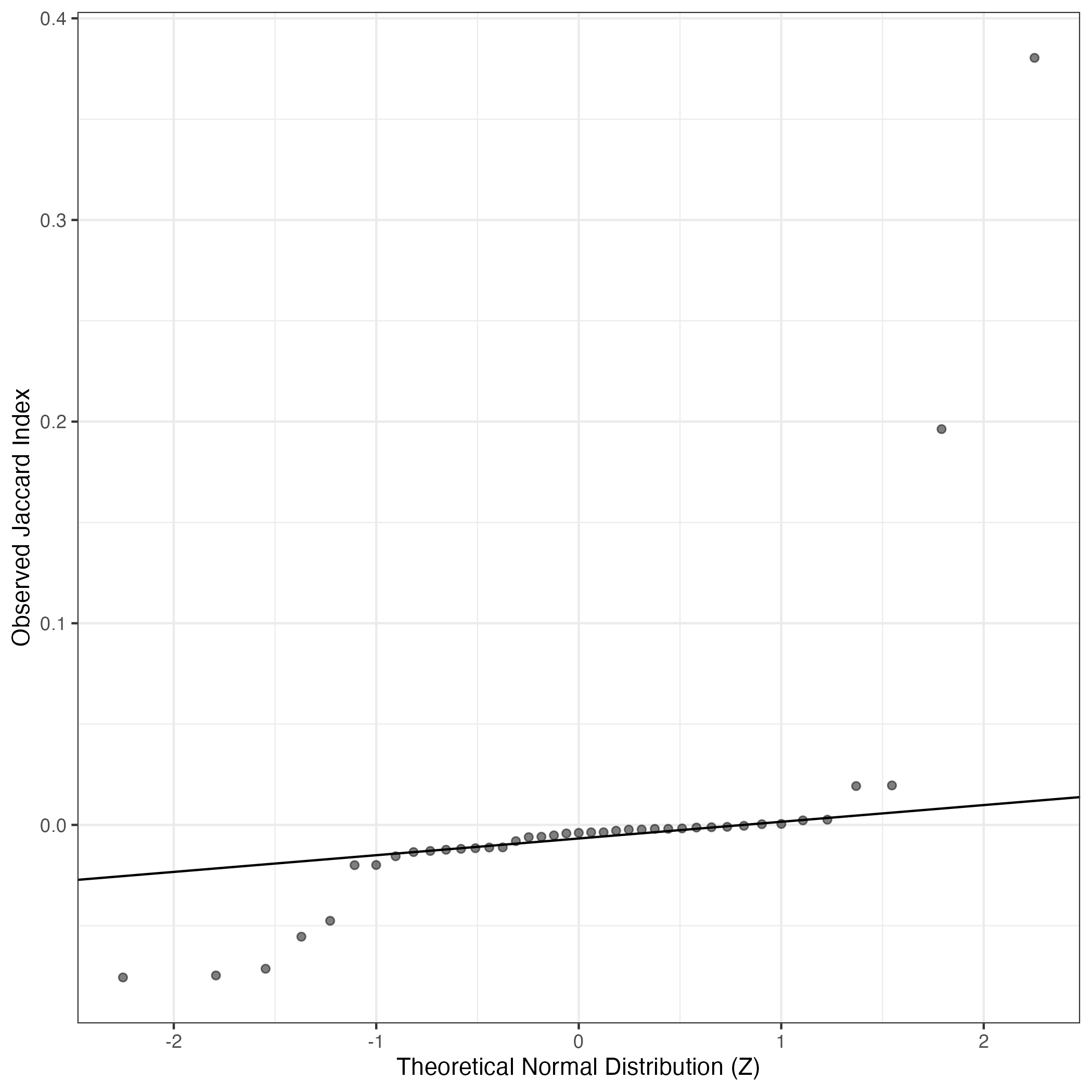 A similar QQ-plot as above, but only for instances where the H value is e.g. > 25, i.e. we are confident that the expression program is active above noise. Agreemenet between these binary vectors is tested using the Jaccard Index, with the P-values calculated by an exact test: