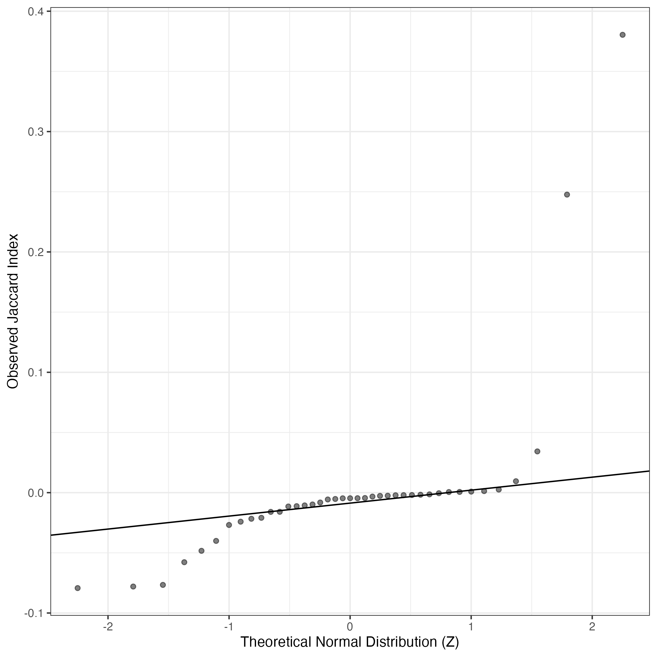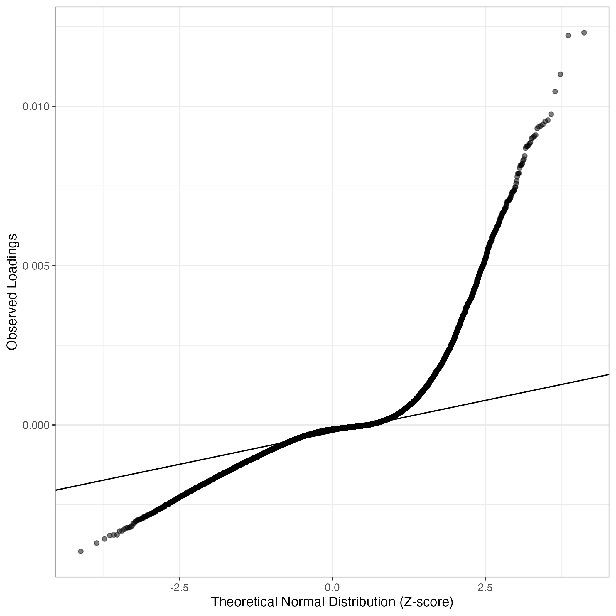 QQ-plot of gene loadings, averaged over both independent splits of the data