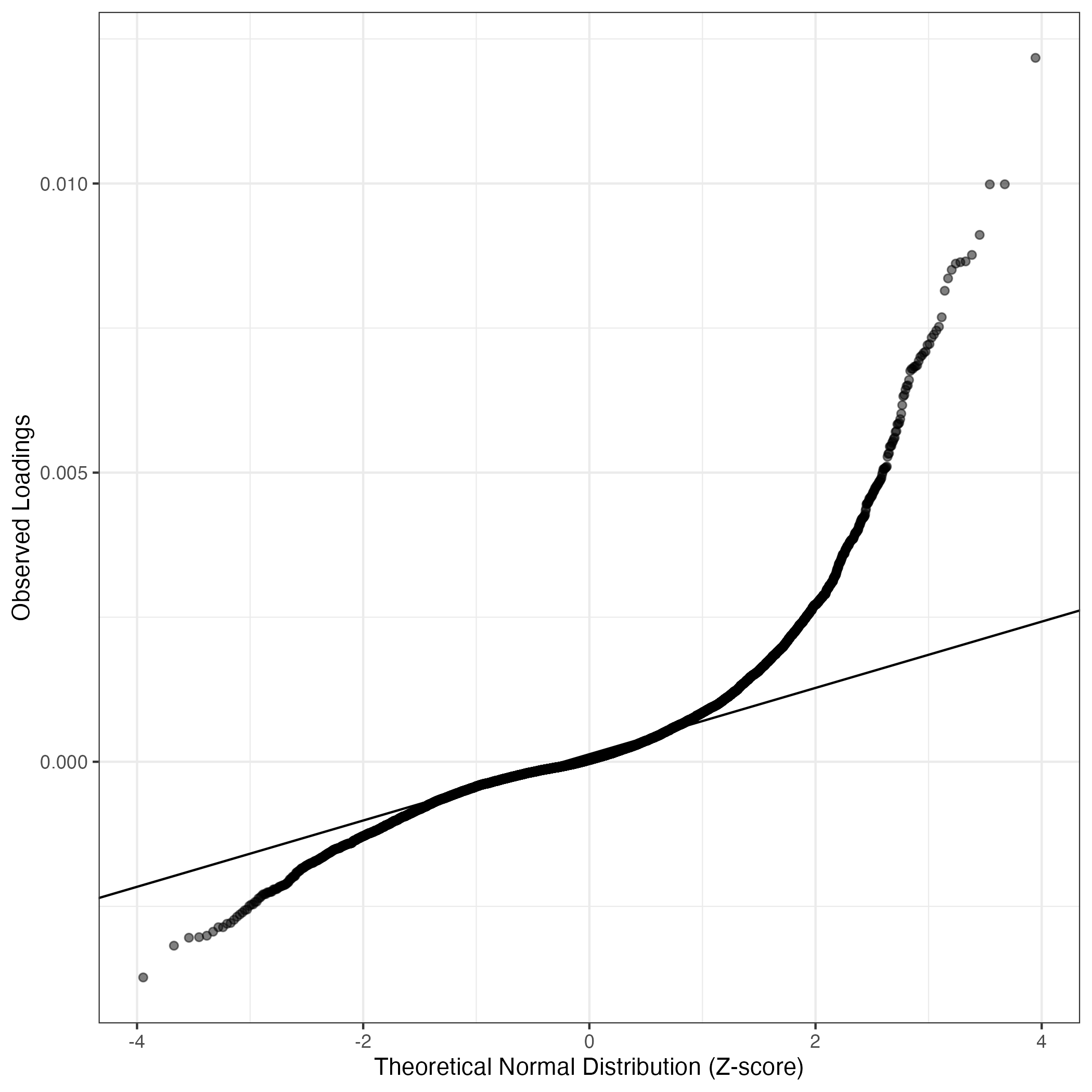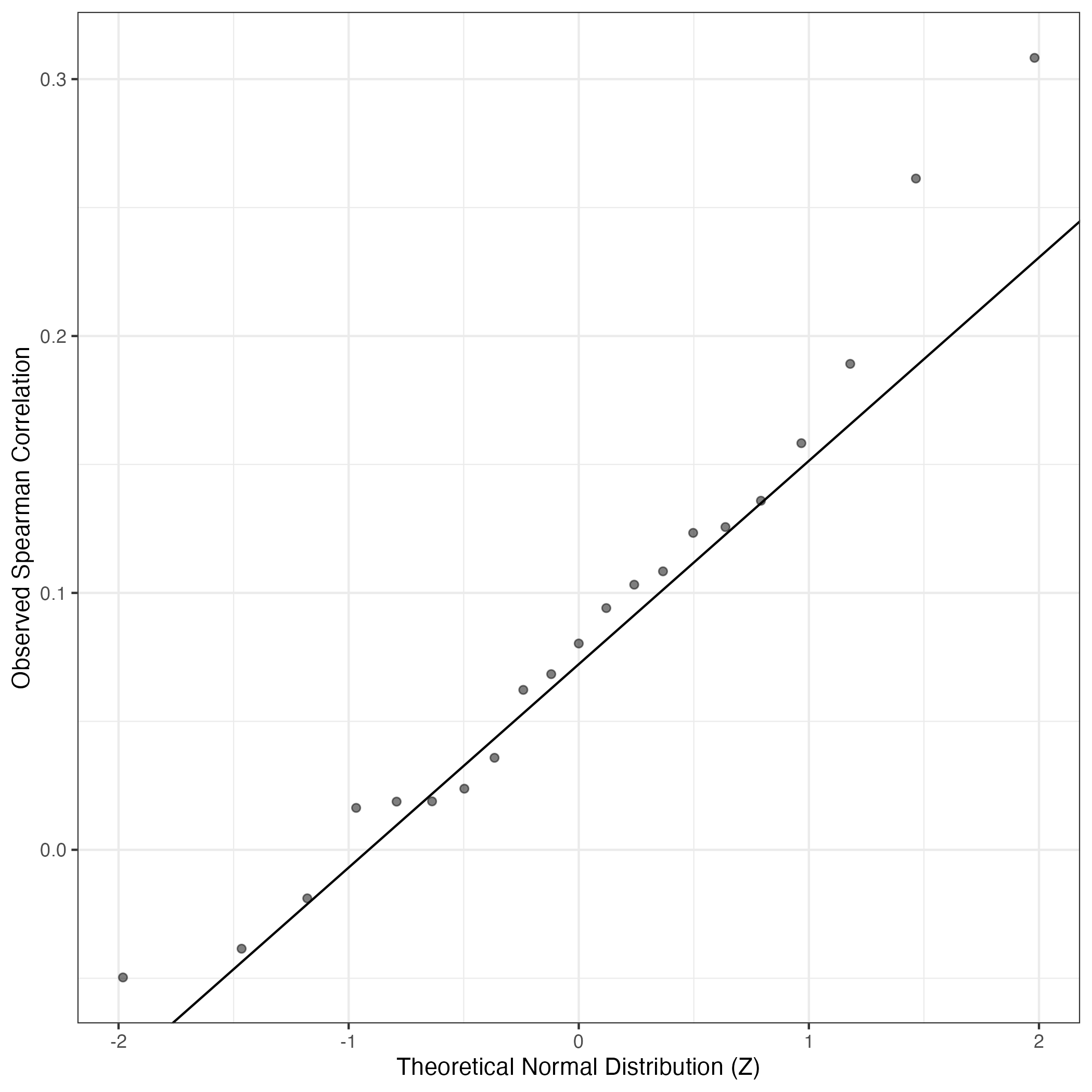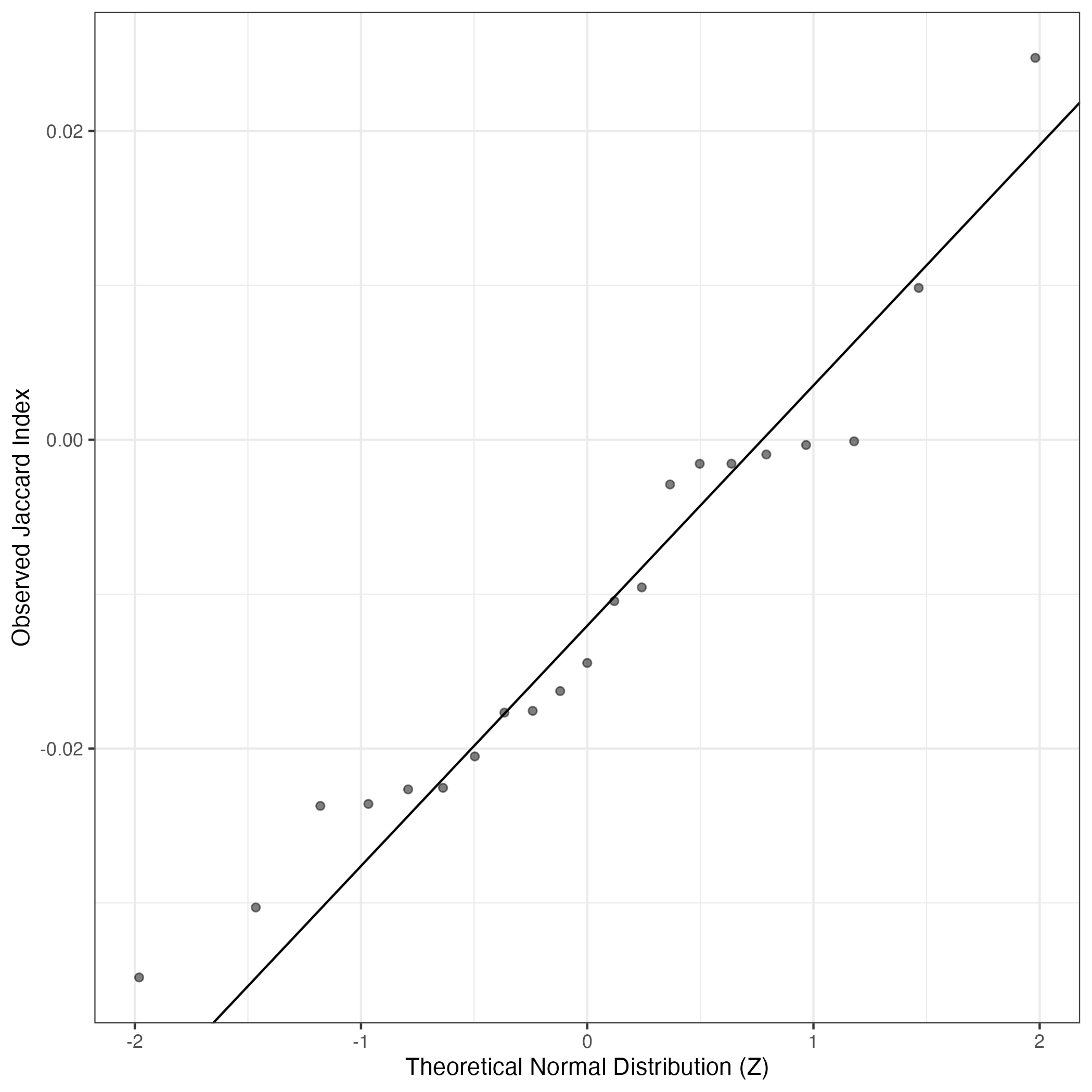 A similar QQ-plot as above, but only for instances where the H value is e.g. > 25, i.e. we are confident that the expression program is active above noise. Agreemenet between these binary vectors is tested using the Jaccard Index, with the P-values calculated by an exact test: