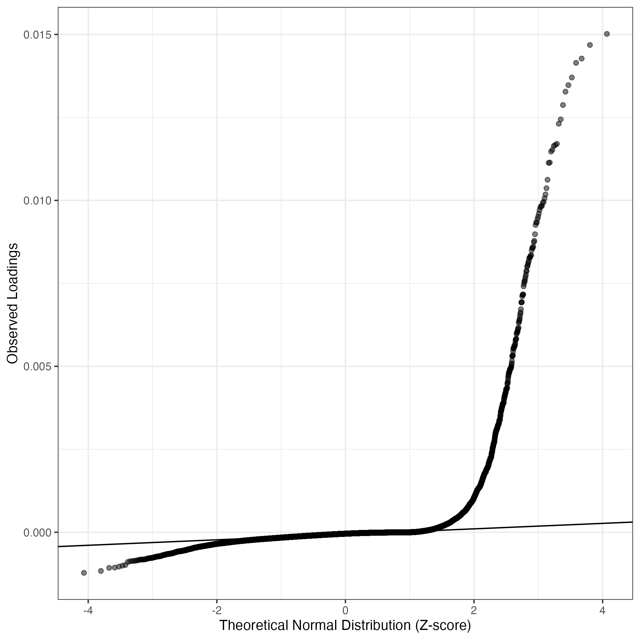 A similar QQ-plot as above, but only for instances where the H value is e.g. > 25, i.e. we are confident that the expression program is active above noise. Agreemenet between these binary vectors is tested using the Jaccard Index, with the P-values calculated by an exact test: