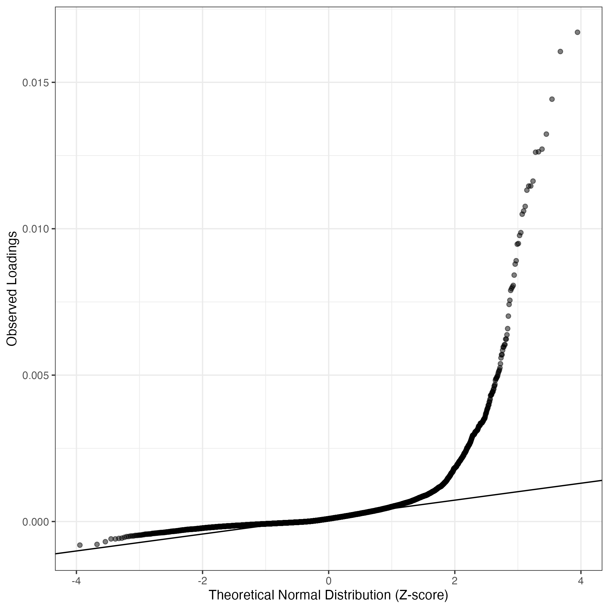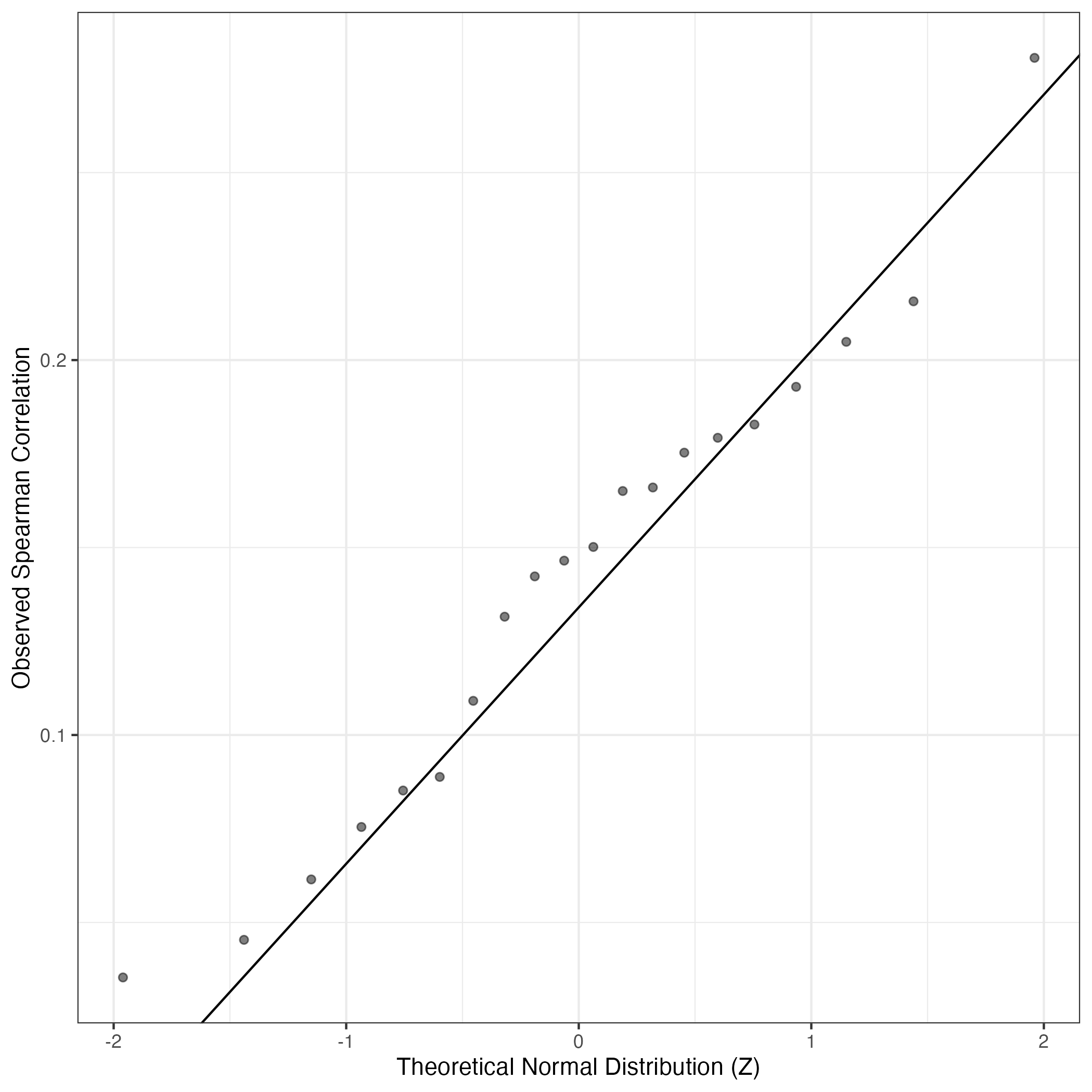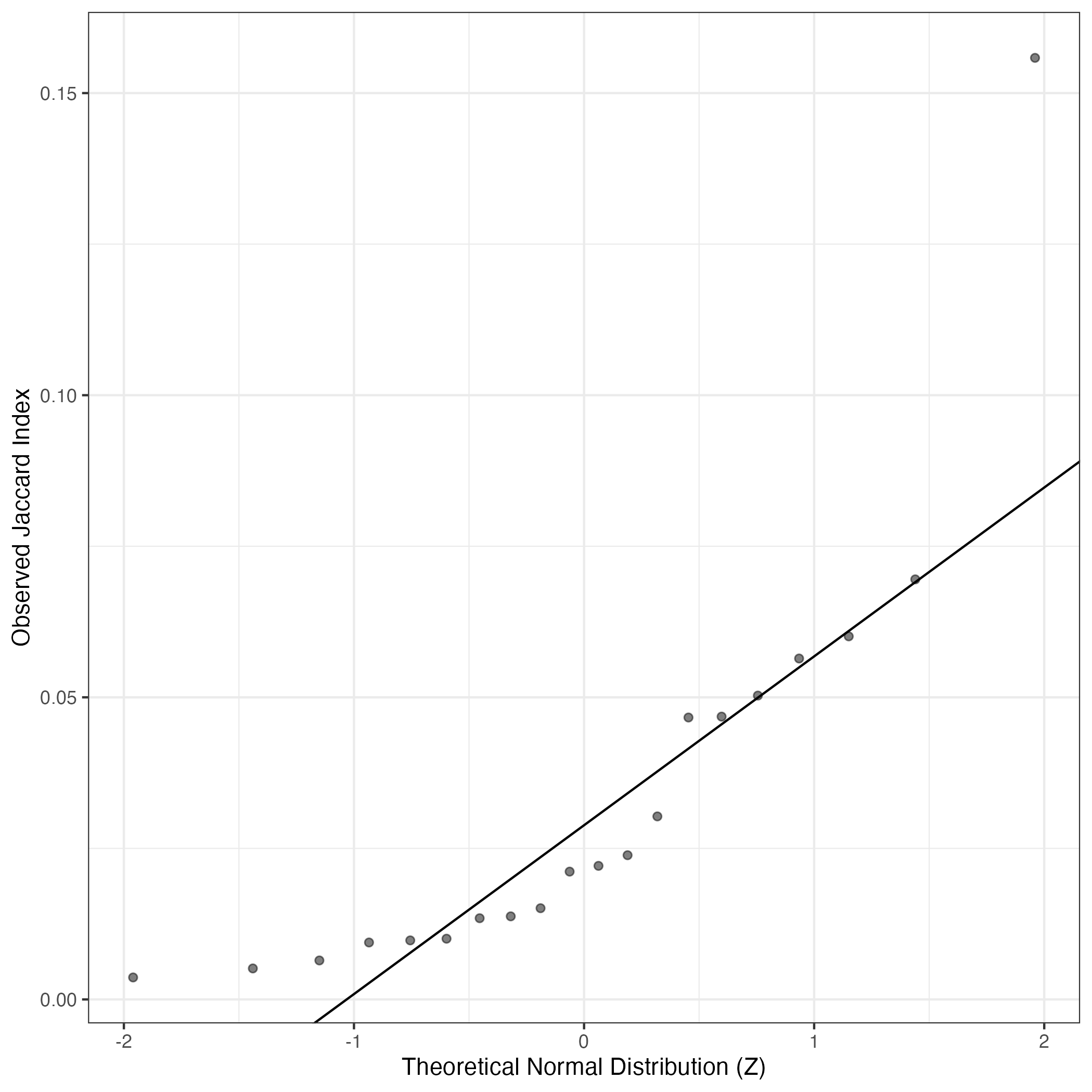 A similar QQ-plot as above, but only for instances where the H value is e.g. > 25, i.e. we are confident that the expression program is active above noise. Agreemenet between these binary vectors is tested using the Jaccard Index, with the P-values calculated by an exact test: