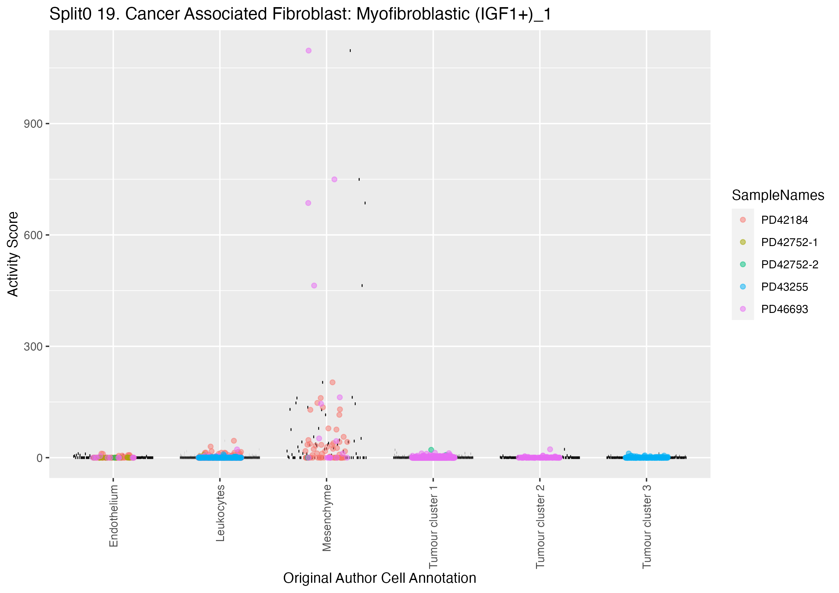 Mesenchymal (Kildisiute) Mesenchymal markers obtained from Kildisiute et al, Supplmenentary Table 2, references supporting these genes are provided in Supp Table S2 of Kildisiute et al (PMID 33547074) https://www.science.org/doi/suppl/10.1126/sciadv.abd3311/suppl_file/abd3311_tables_s1_to_s12.xlsx: Wilcoxon ranksum test P-value for gene set overrepresentation: 4.08e-01 Mean rank of genes in gene set: 5432 Rank on gene expression program of genes in gene set: